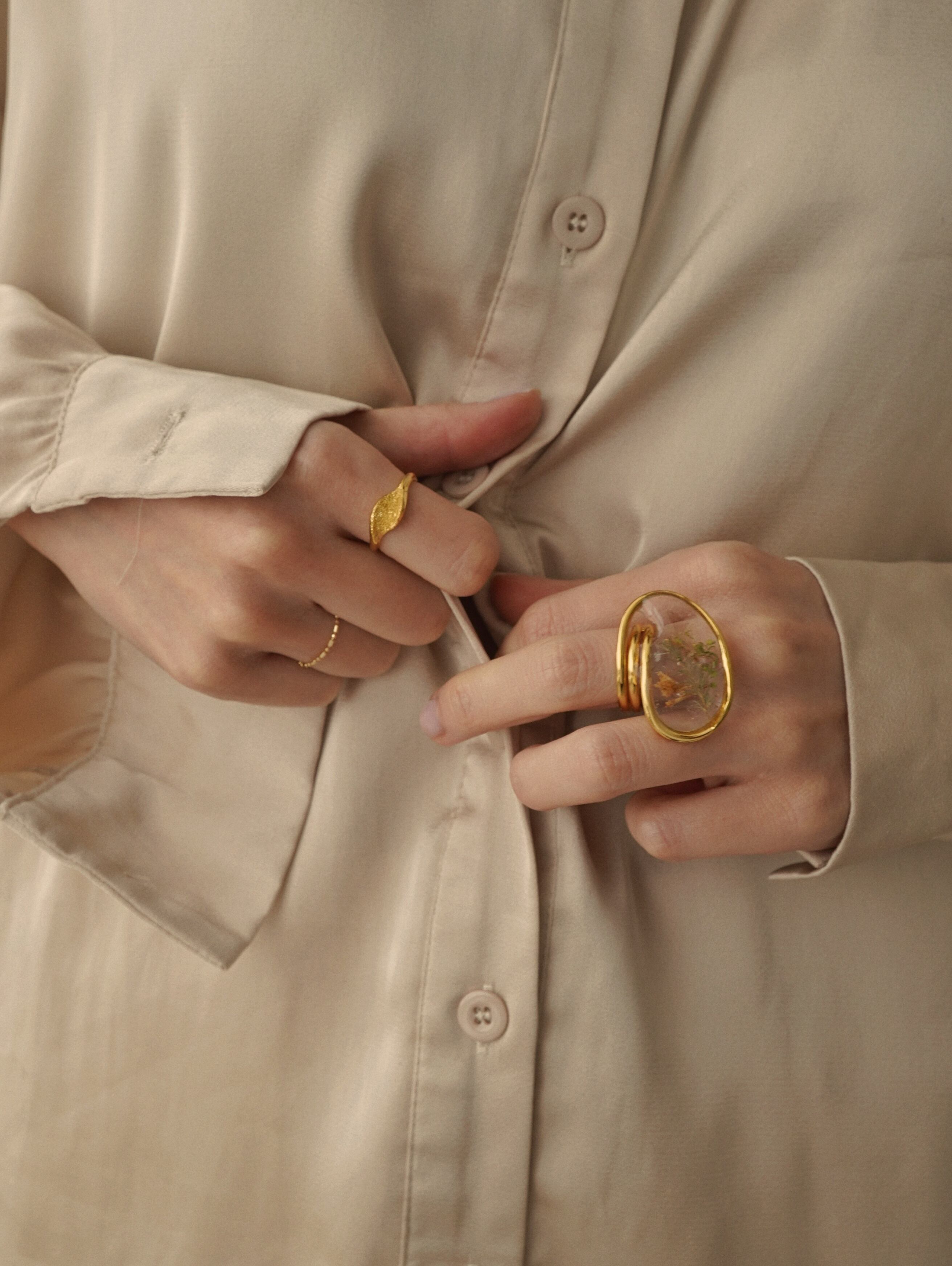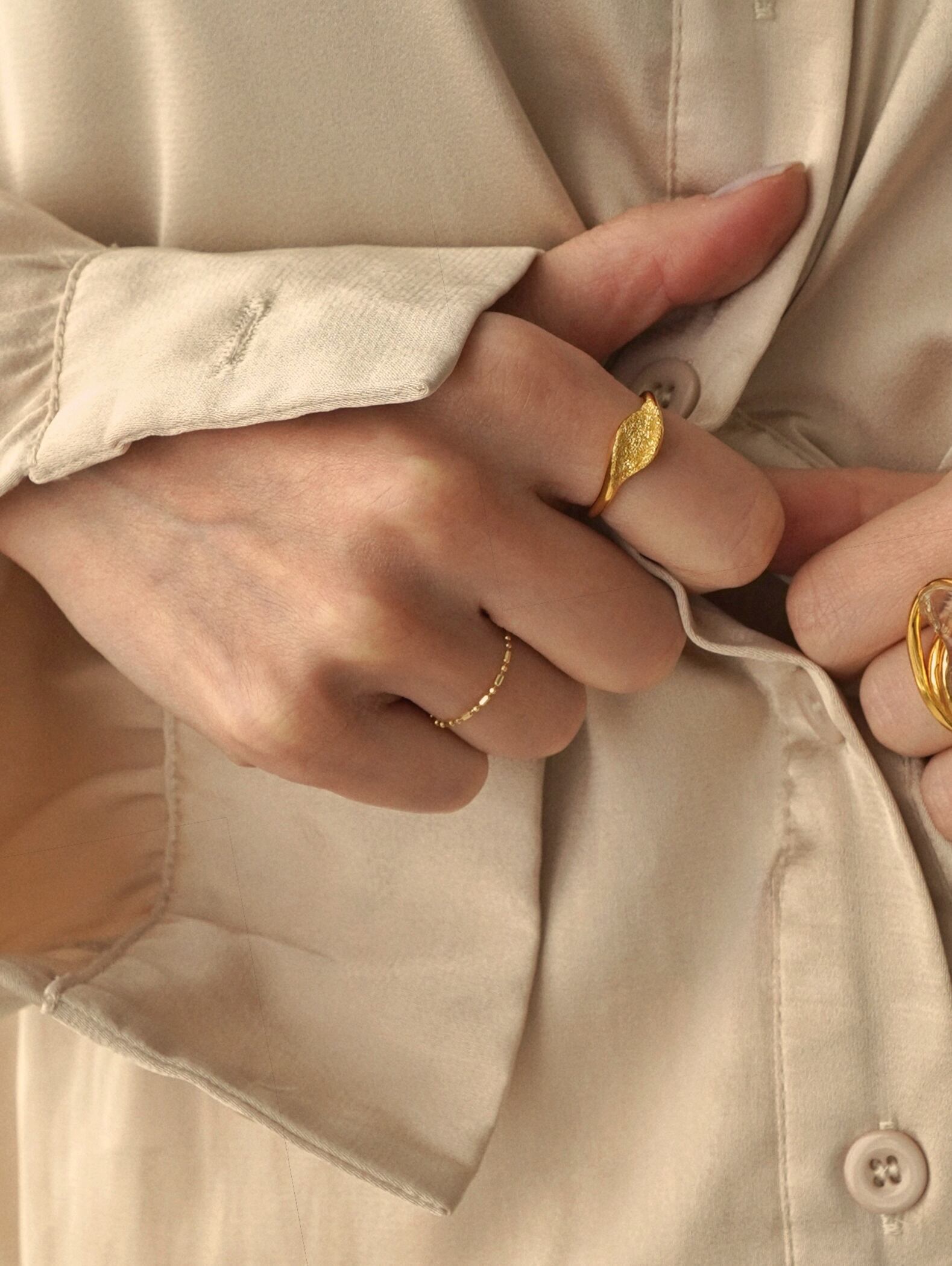 やわらかく波打つようなフォルムが、指先に自然なニュアンスを添えるリング。