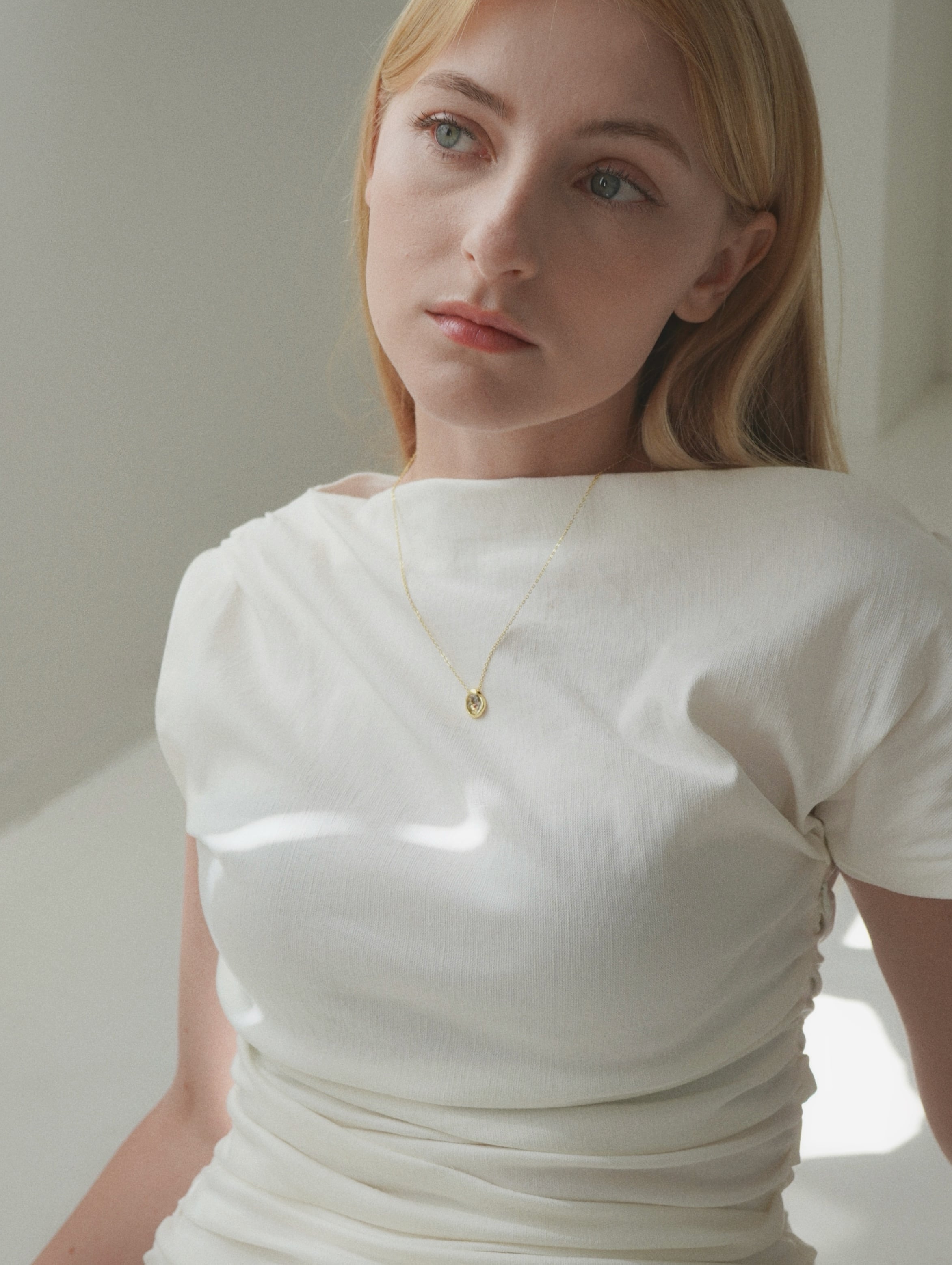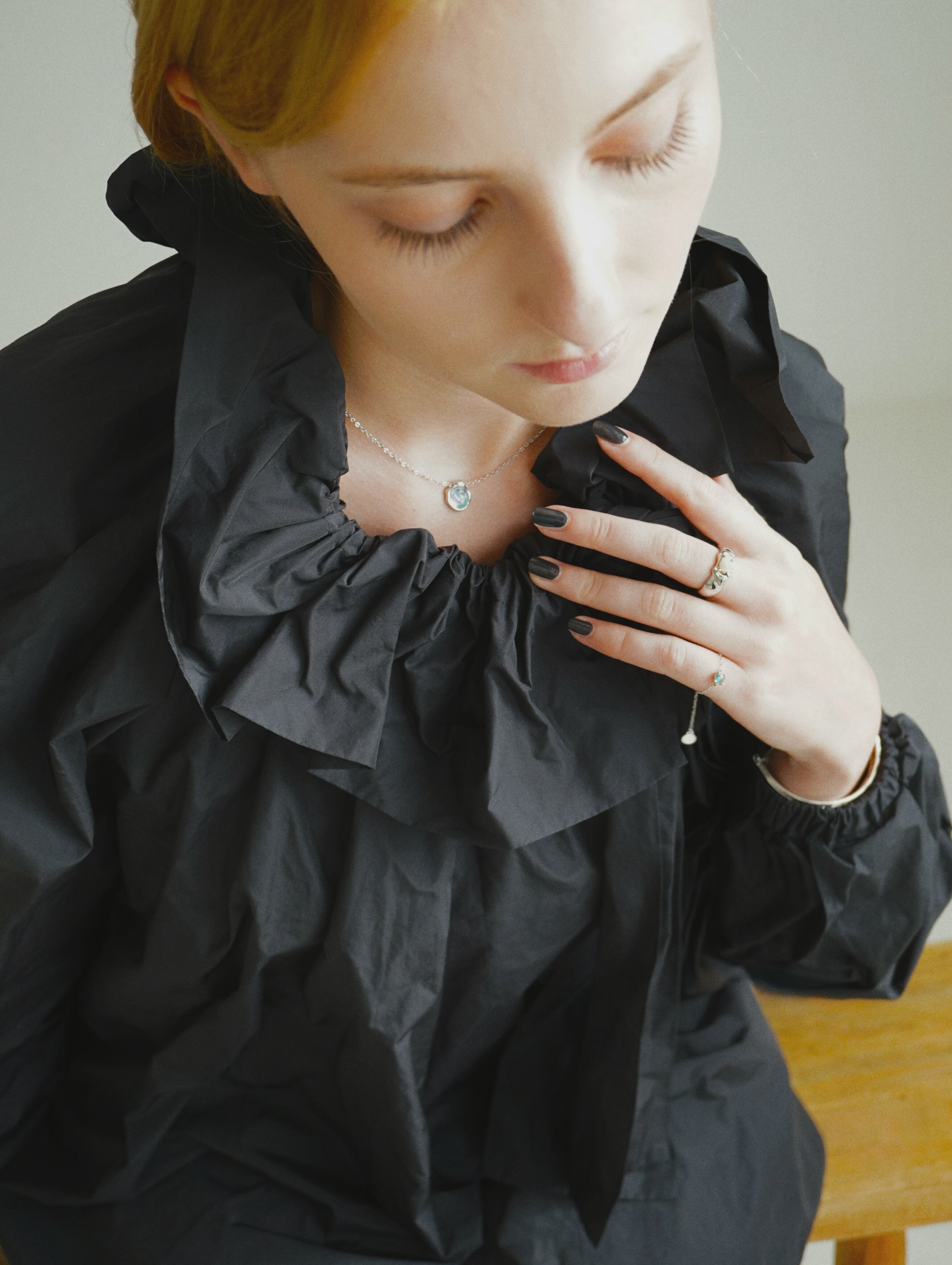 The soft shine and petite floral detail bring a subtle charm to the neckline, creating an elegant yet effortless look.
