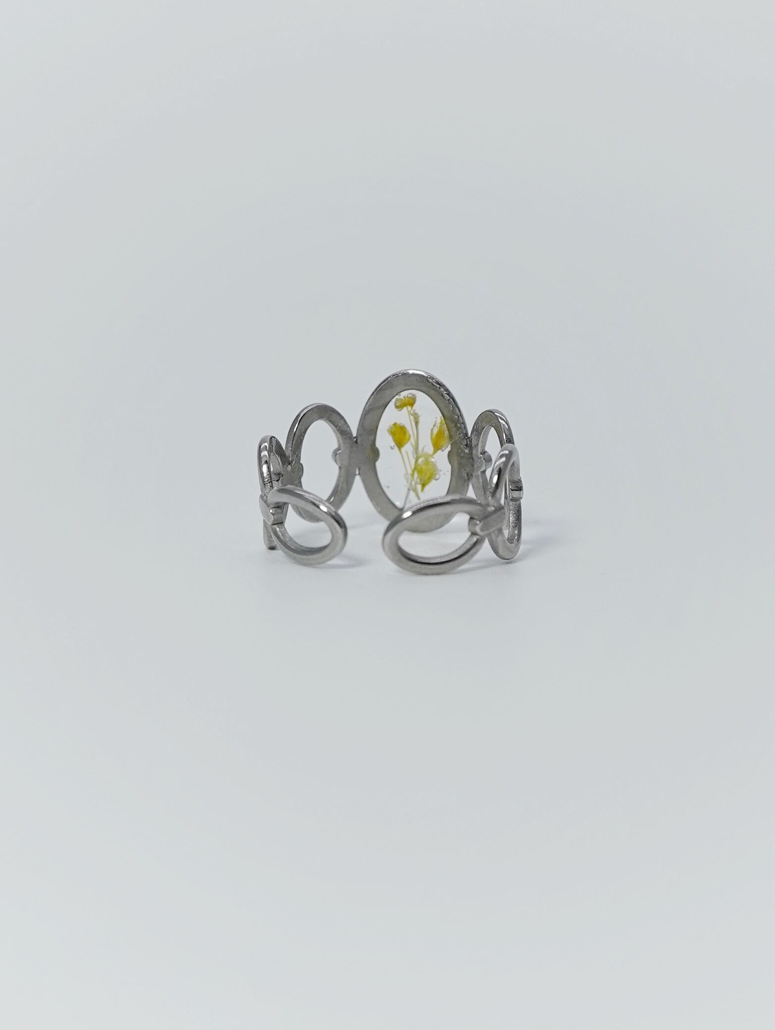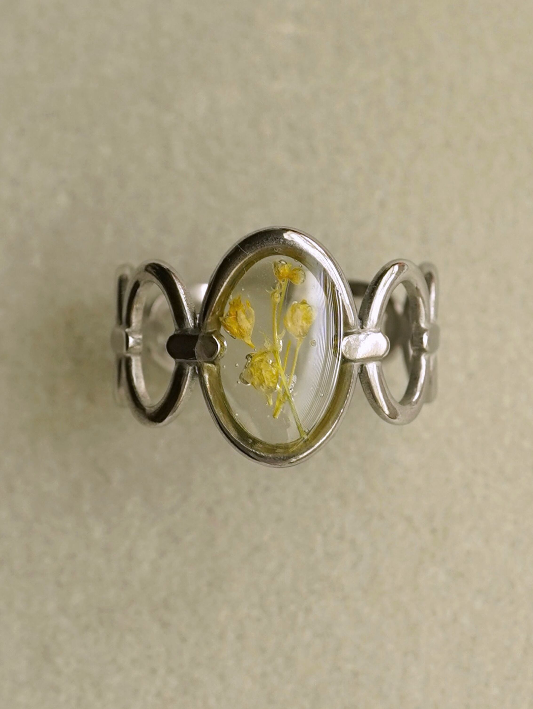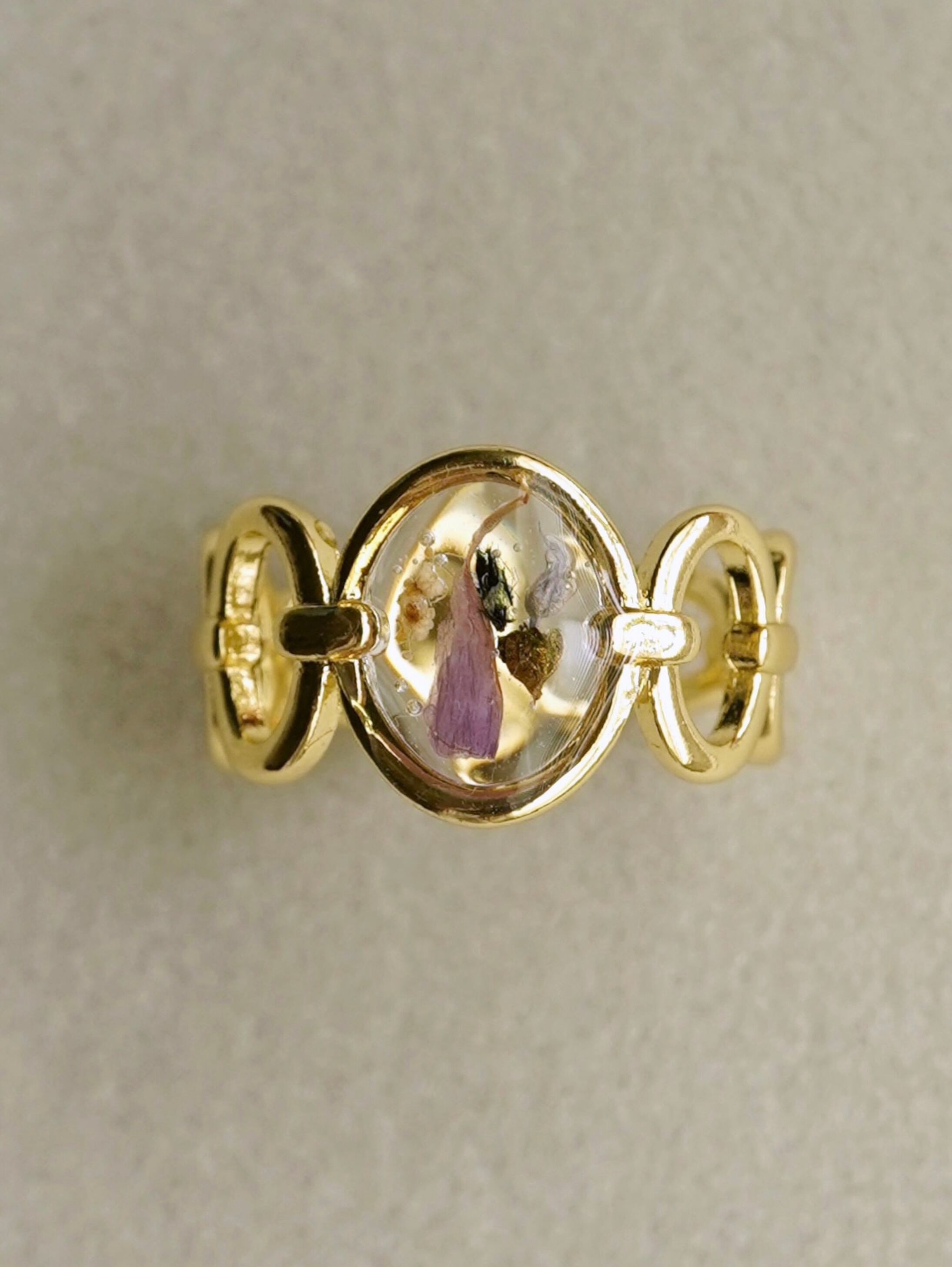 A ring featuring real tiny flowers encased in a transparent clear material.