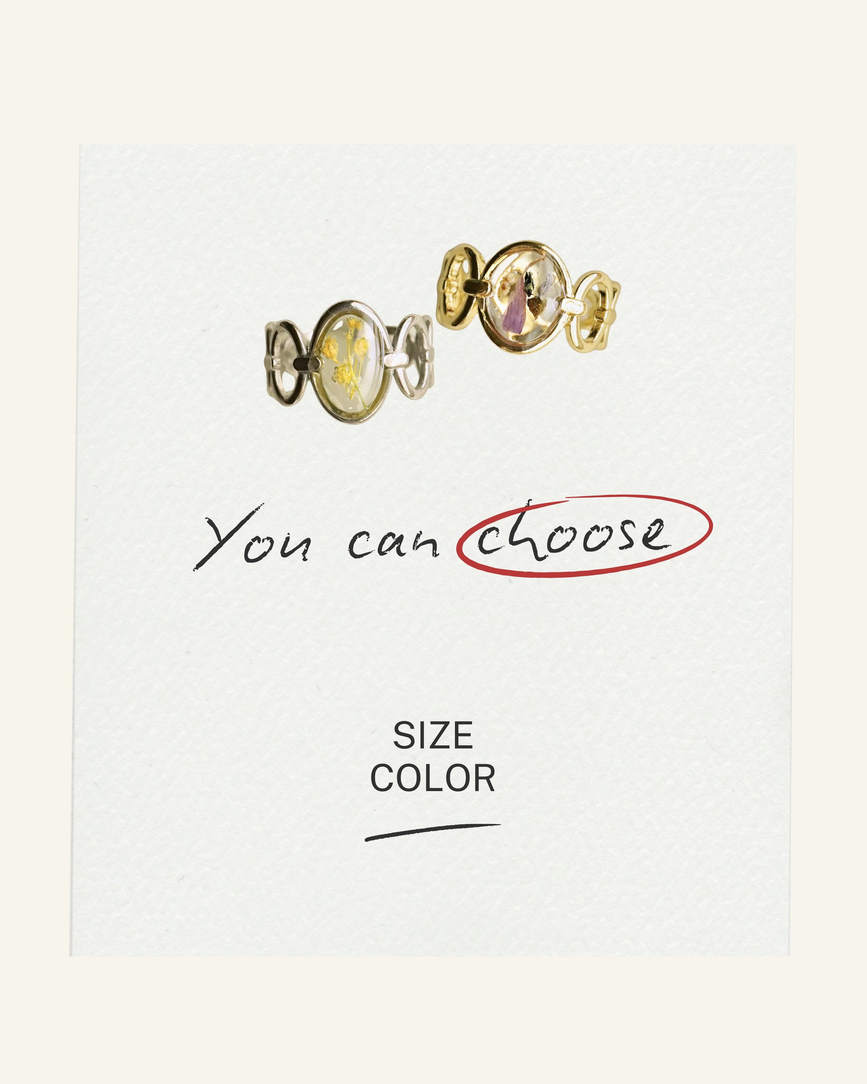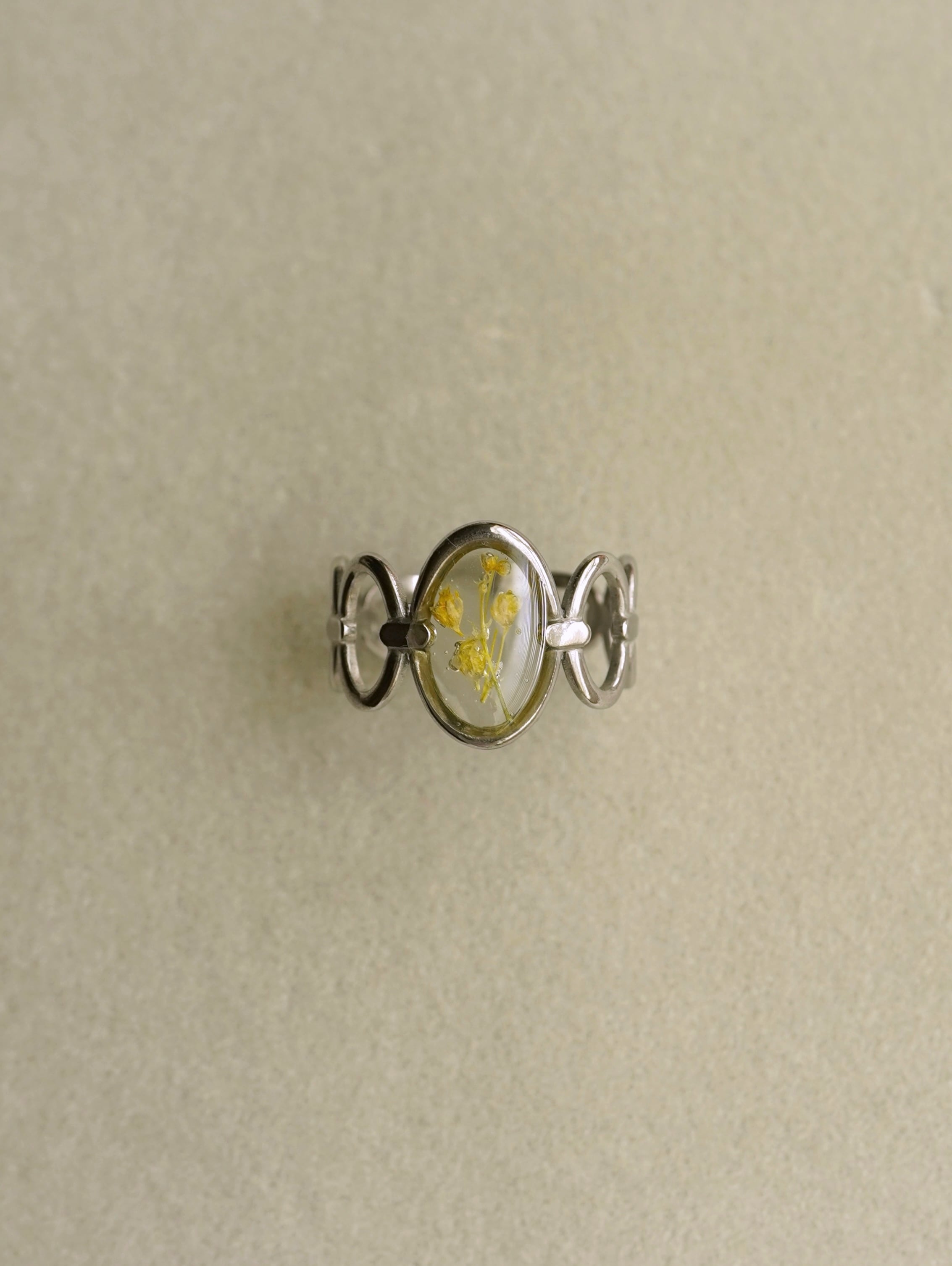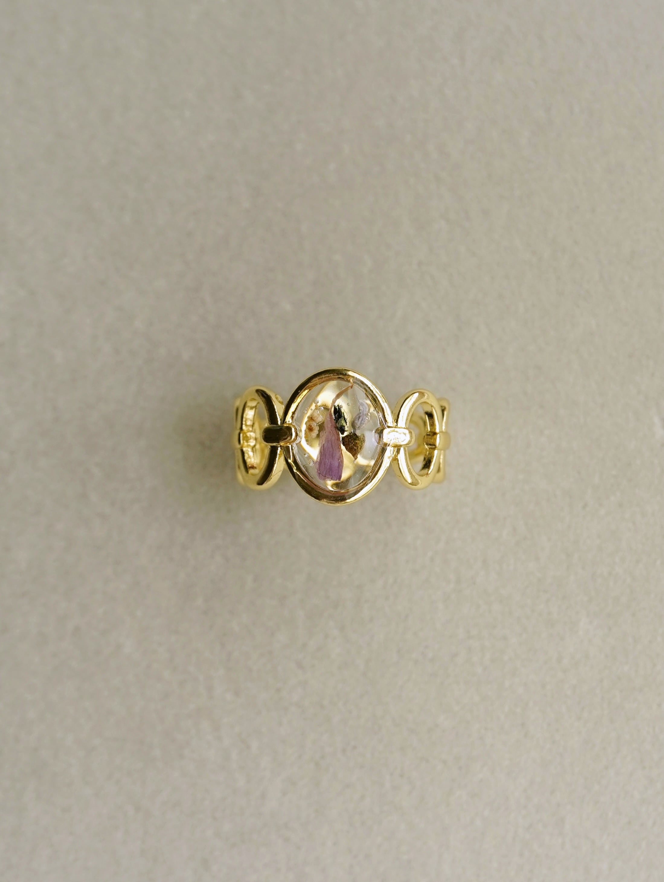 A ring featuring real tiny flowers encased in a transparent clear material.