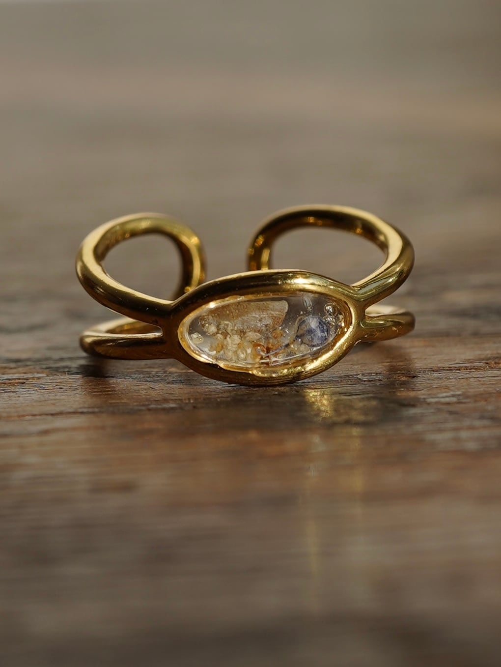 A delicate ring featuring tiny real flowers encased in an oval-shaped frame.