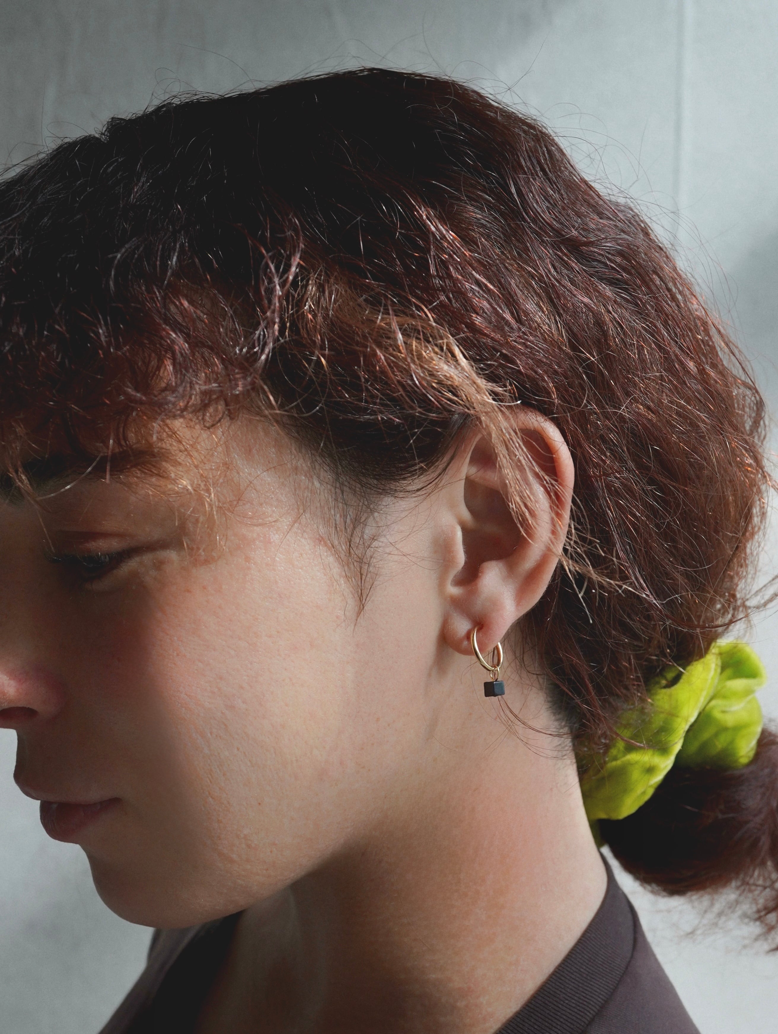 シンプルなフープにブルーカルセドニーを添えたイヤリング。