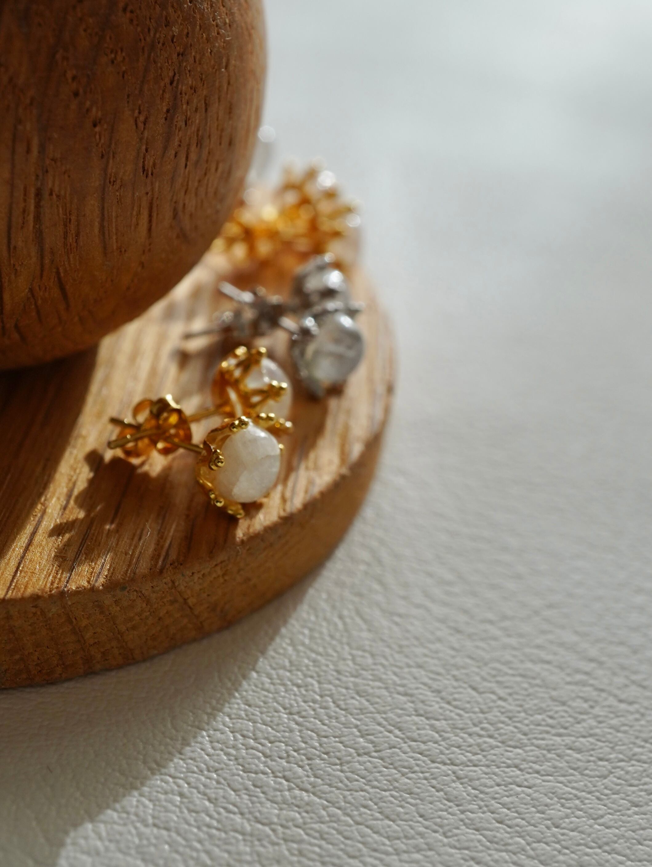 ムーンストーンが美しく輝くシンプルなポストピアス。落ち着いた印象でありながらムーンストーンの繊細な輝きが耳元を優雅に引き立てます。