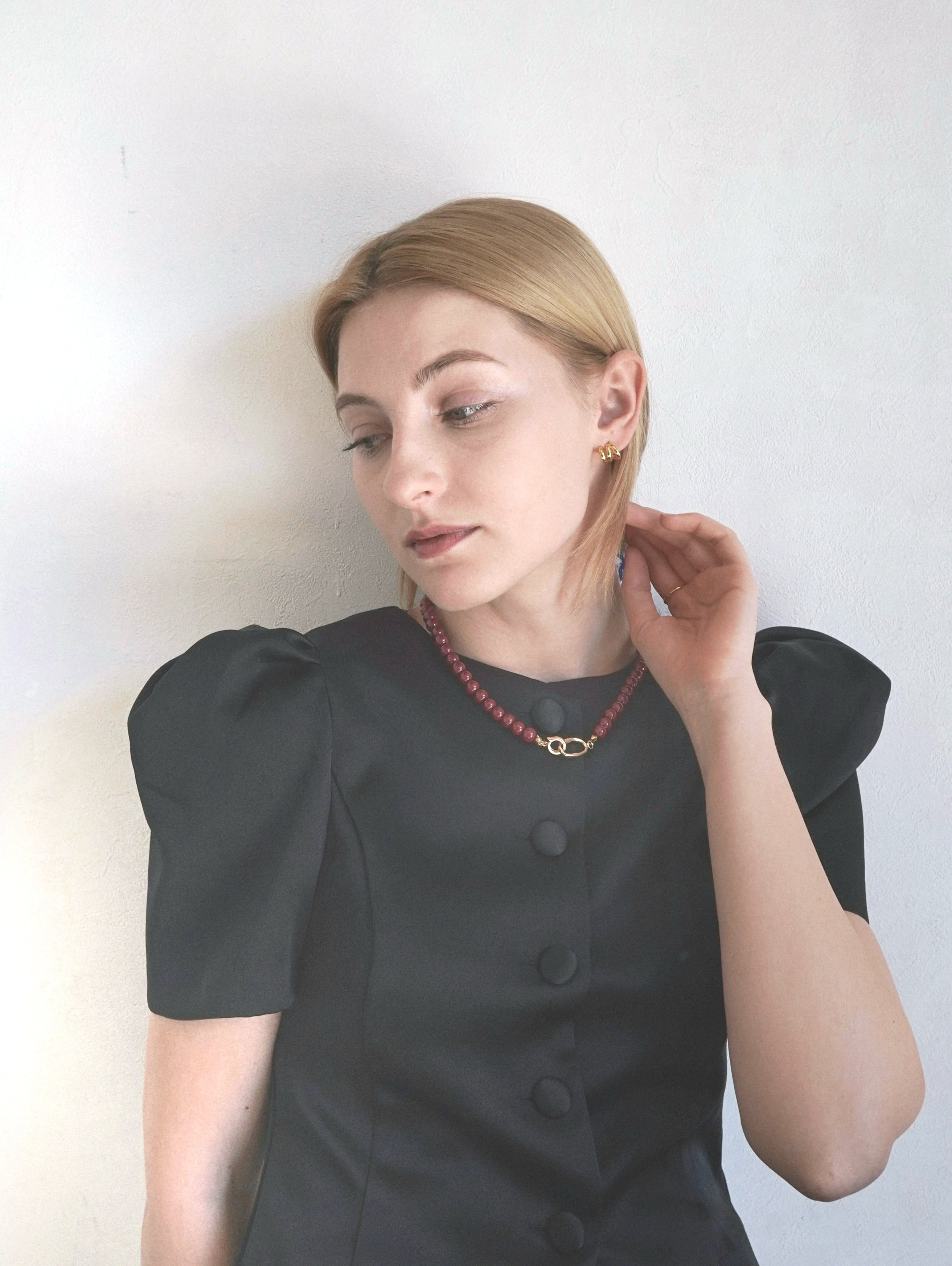 深みのあるレッドカラーのビーズを等間隔に並べて仕上げたネックレス。