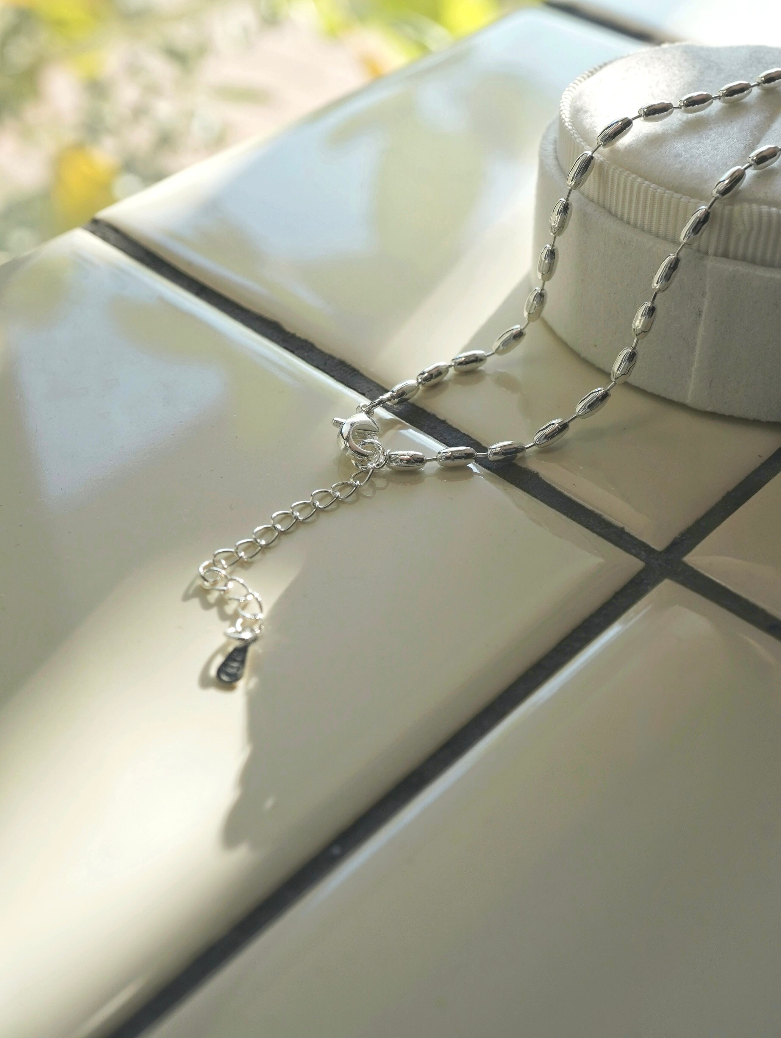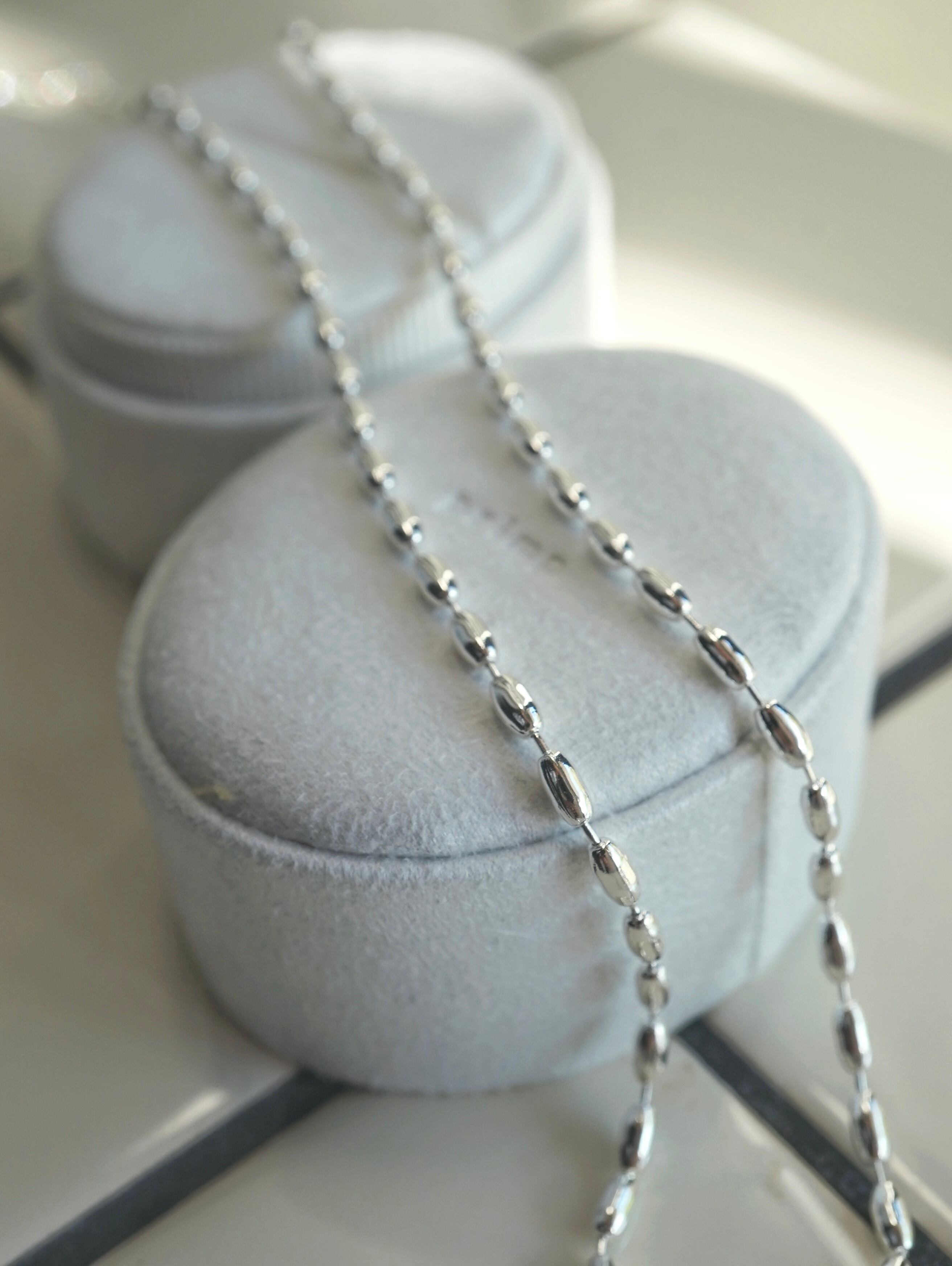 楕円状のリンクが連なり、シンプルながらも存在感のある首元を演出します。