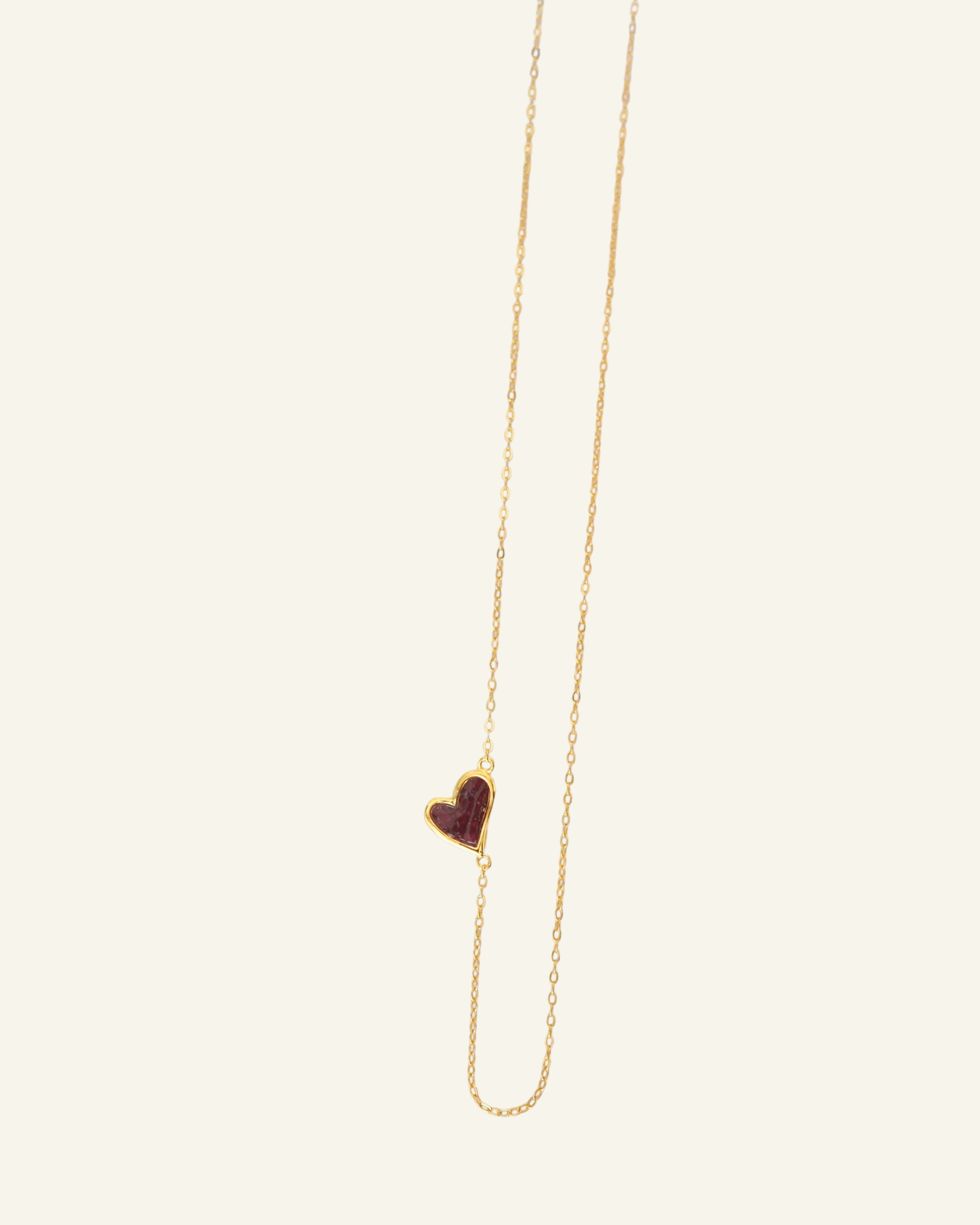 薔薇の花びらを細かく砕き、ハート型のトップに閉じ込めたネックレス。