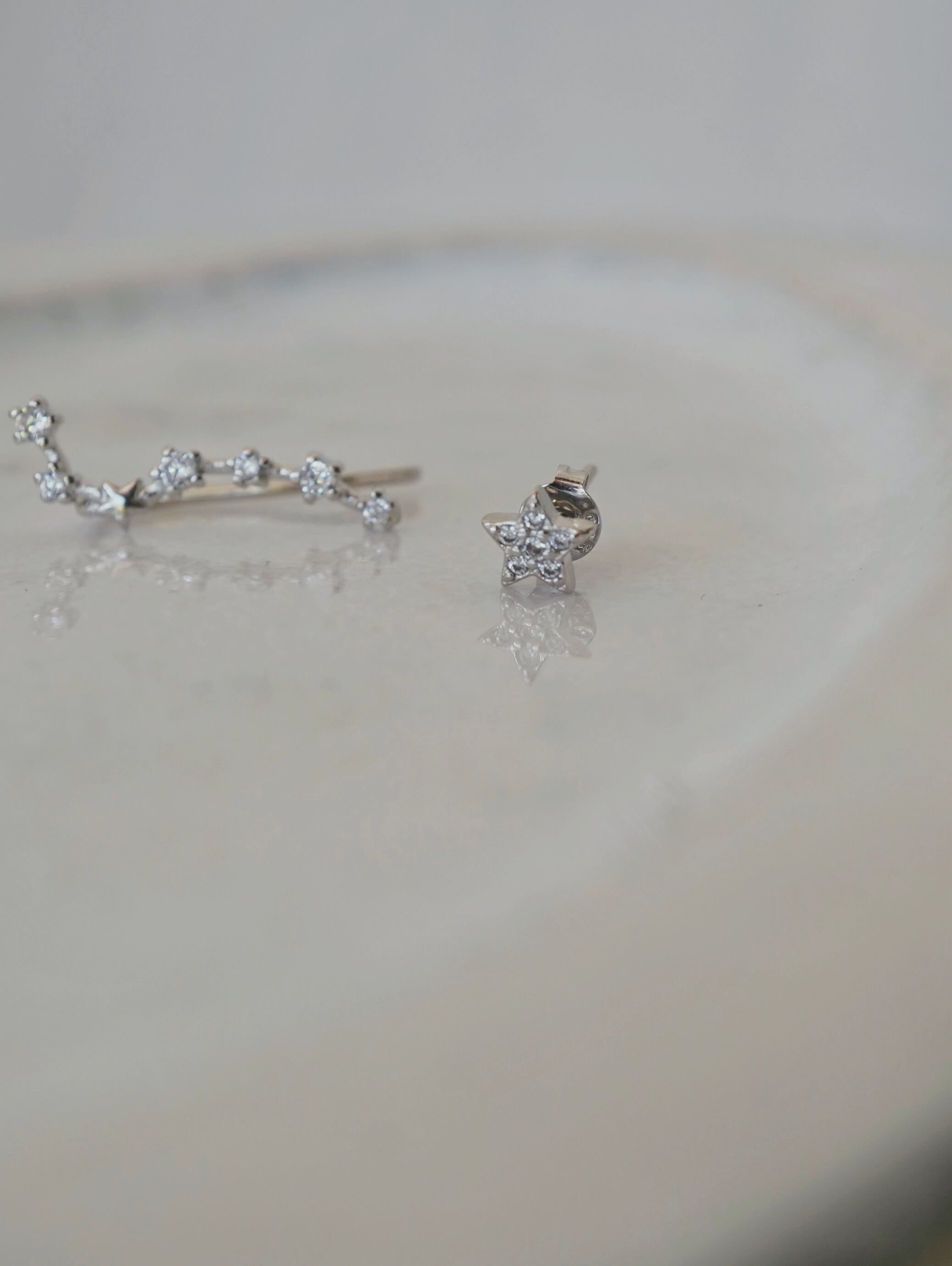 星モチーフを左右で異なる表情に仕上げた、アシンメトリーデザインのピアス。
