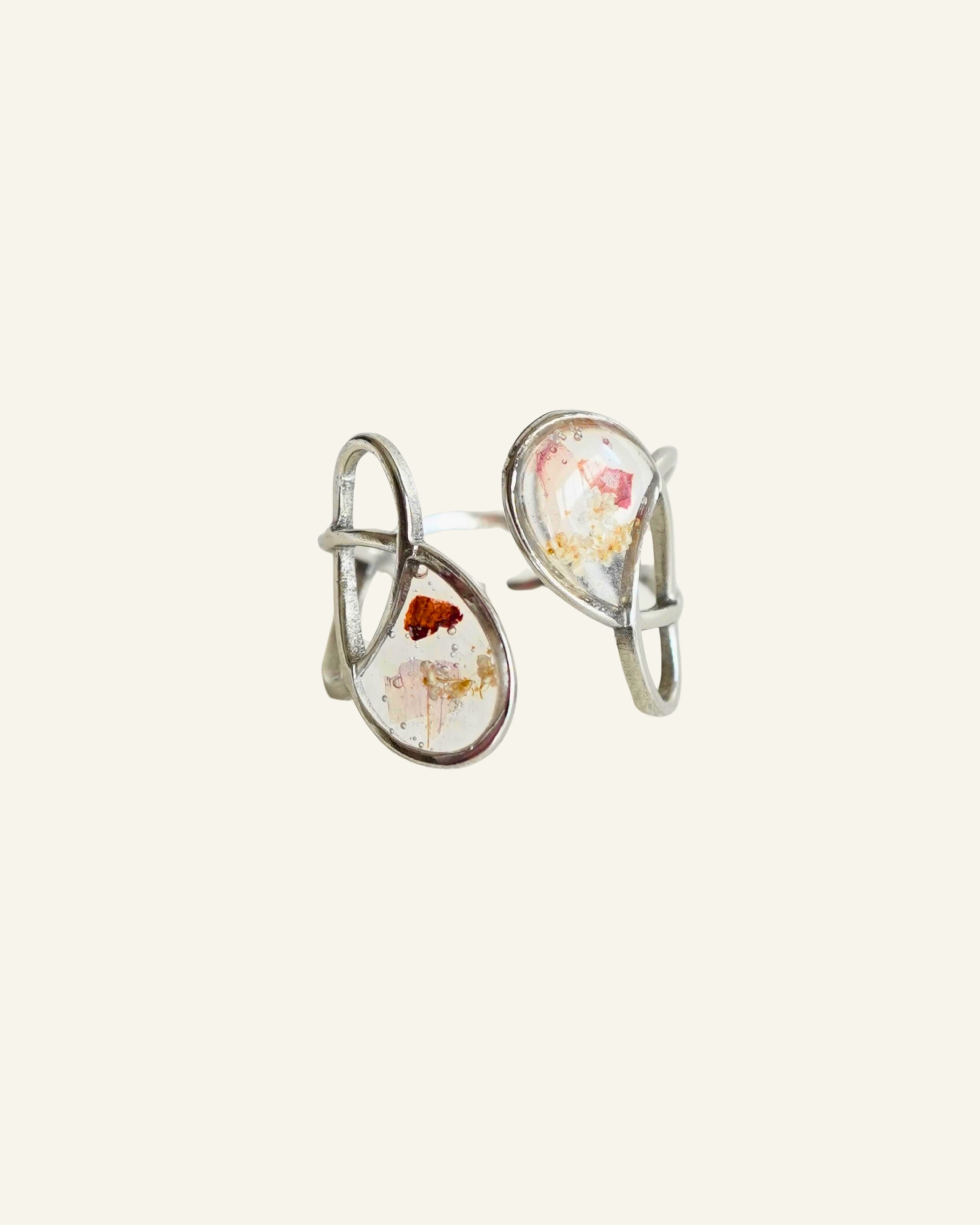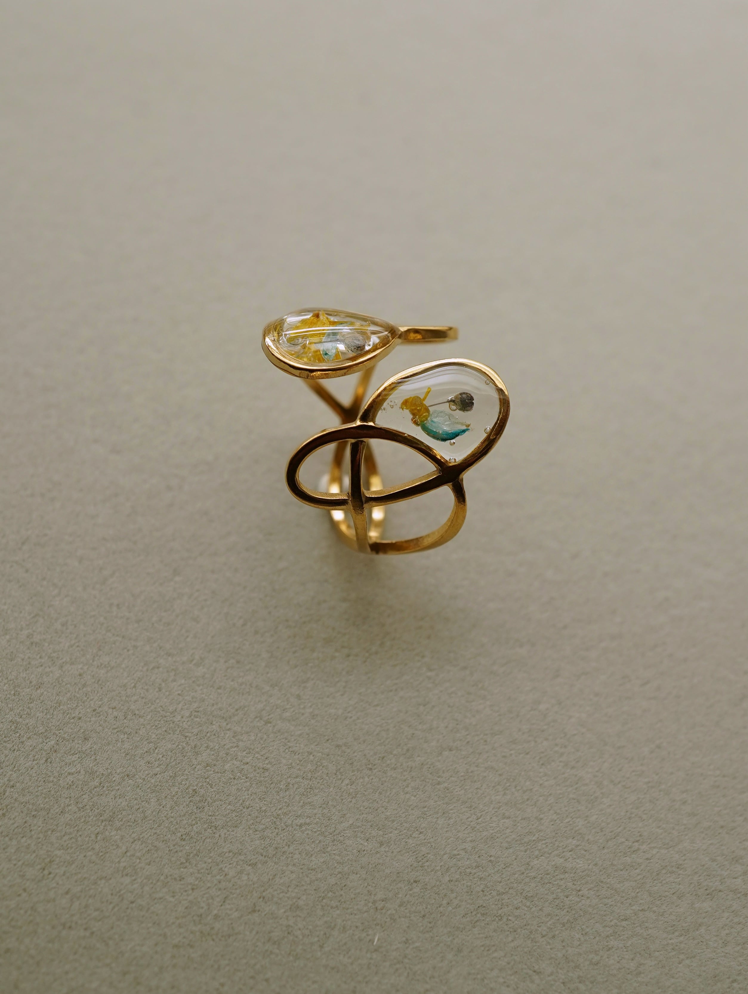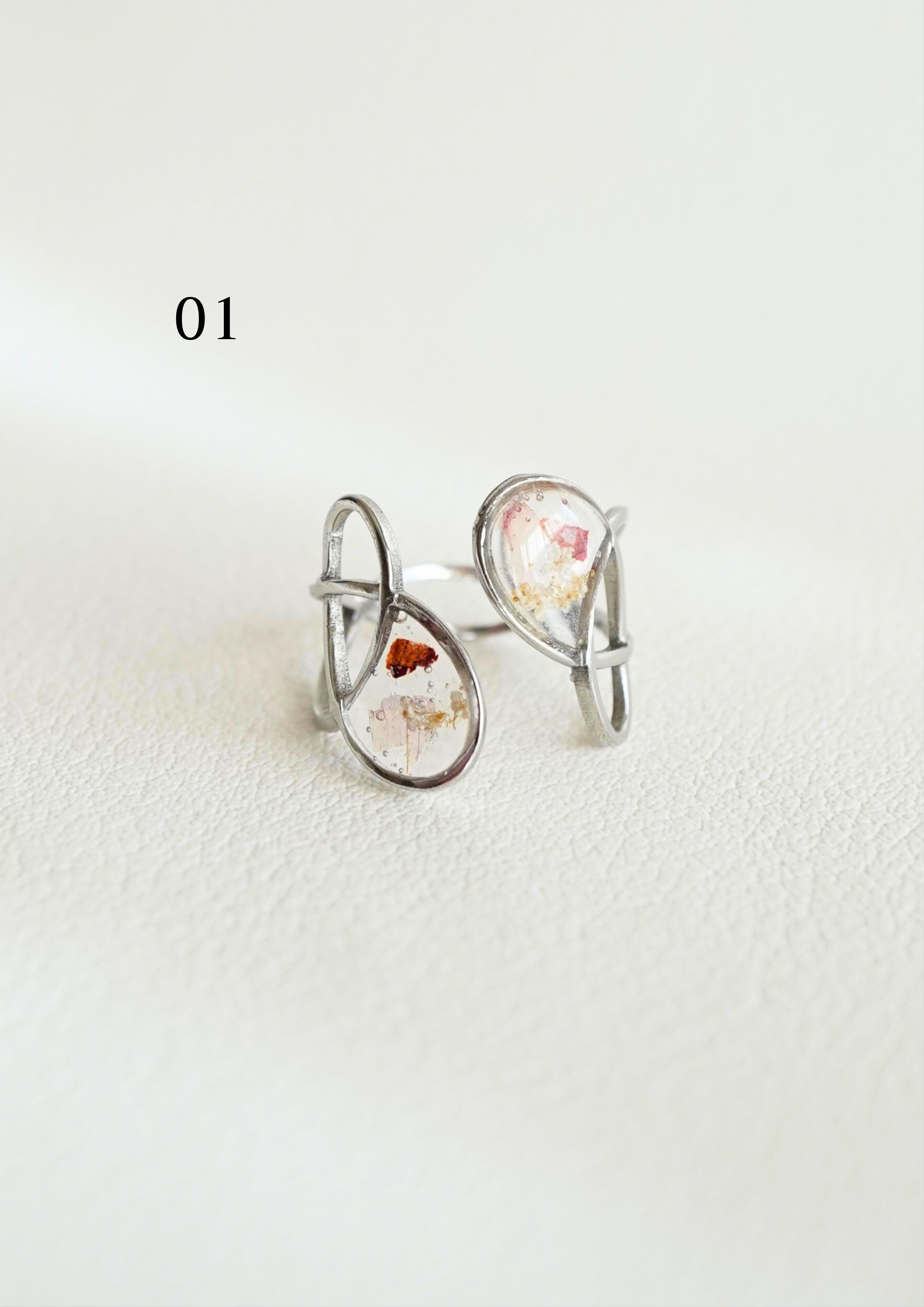 柔らかく交差するラインに、雫のようなフレームを合わせたリング。