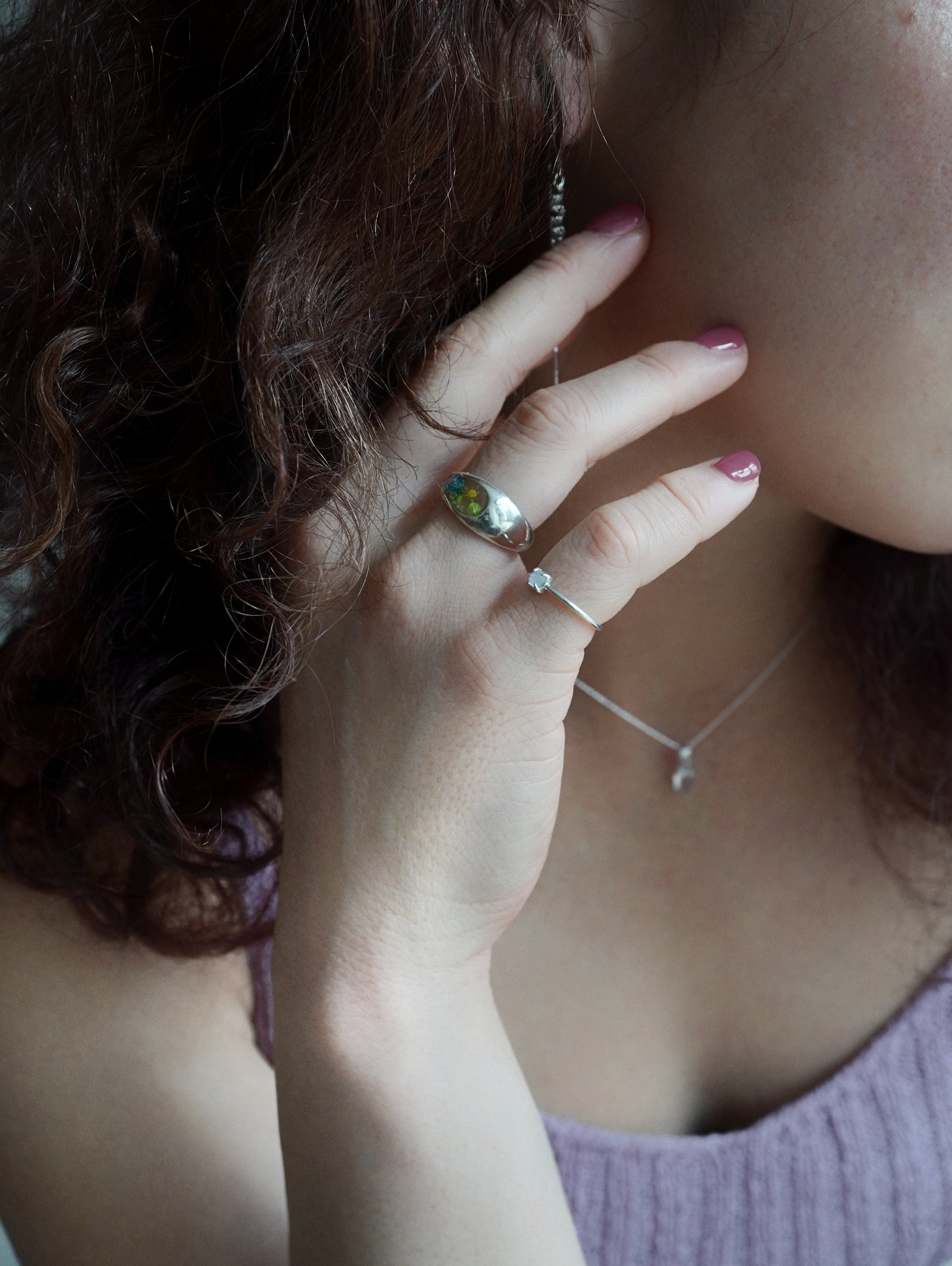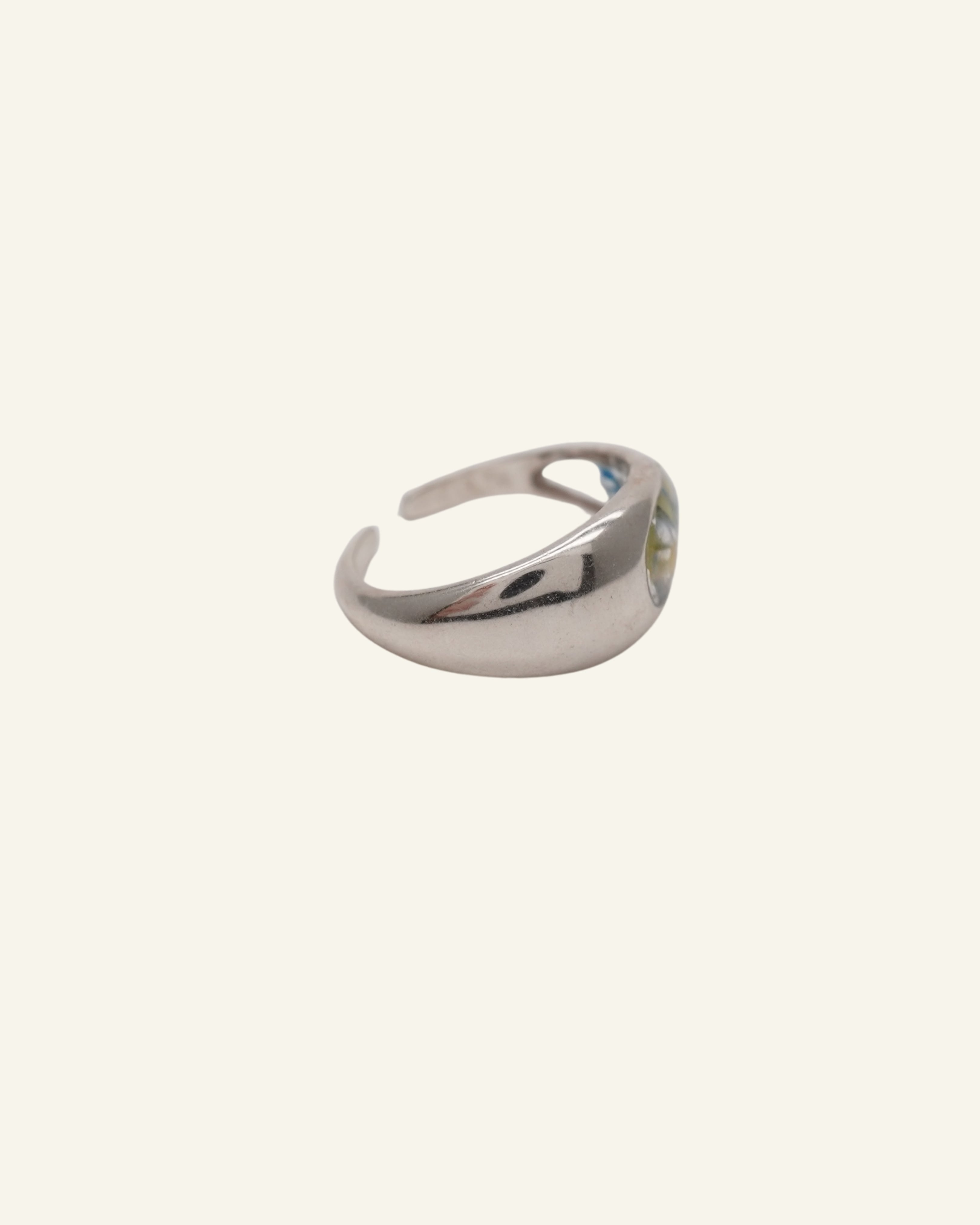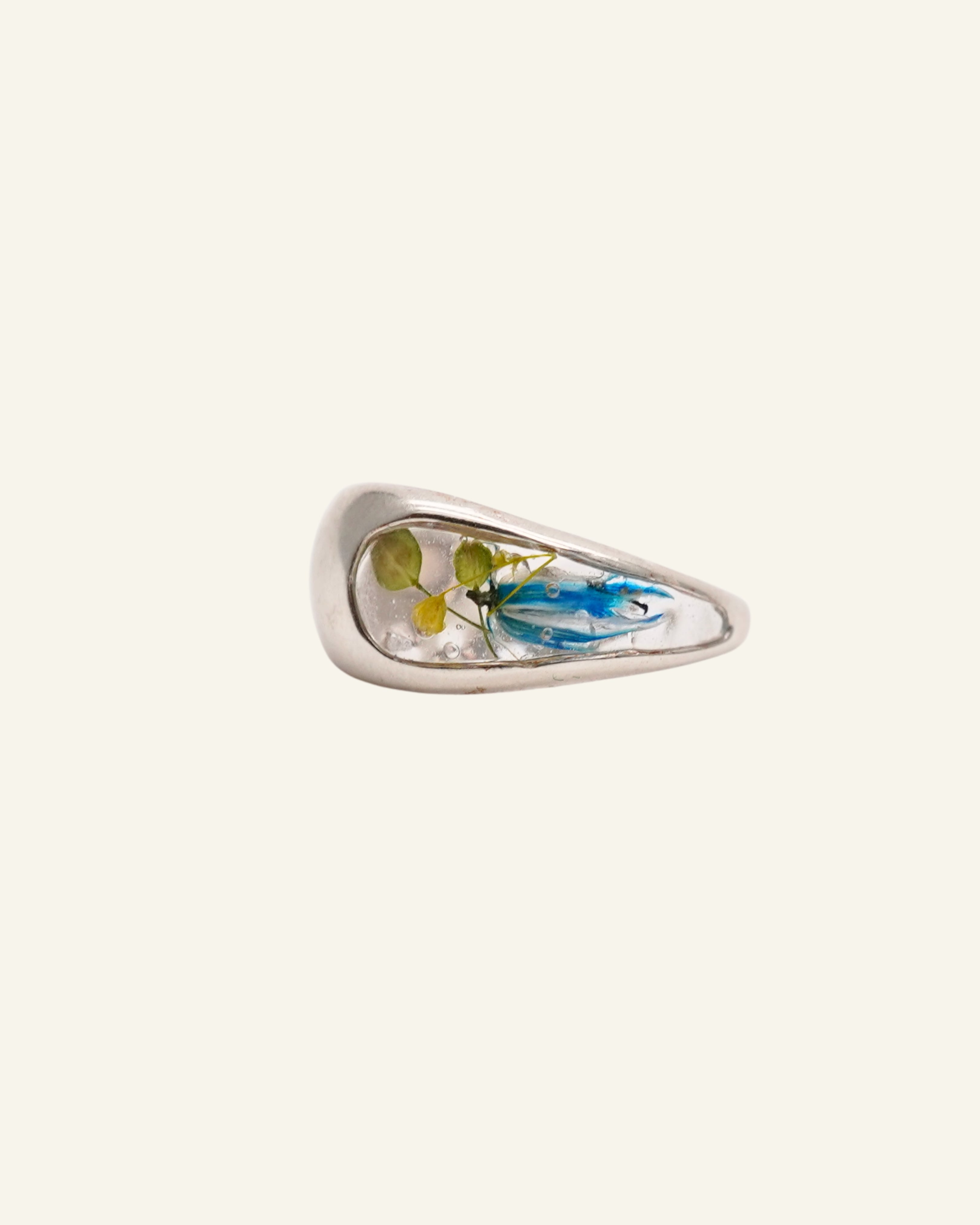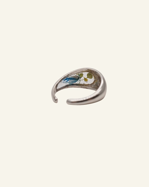 ドライフラワーをレジンで閉じ込めたリング。