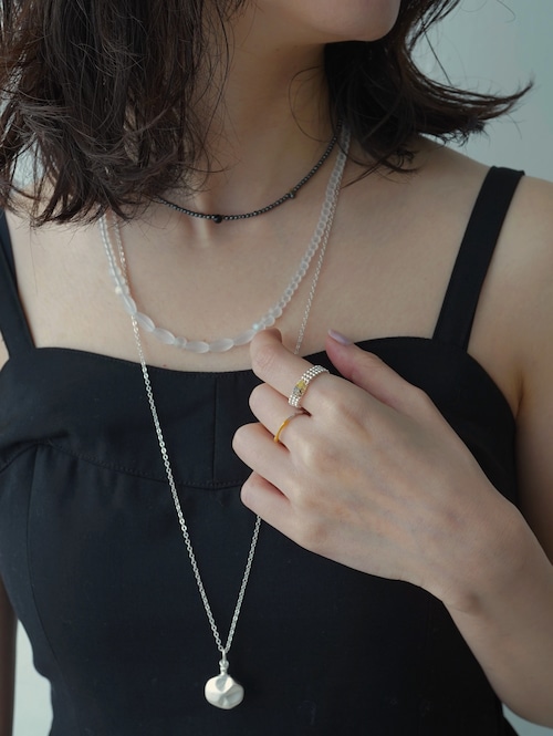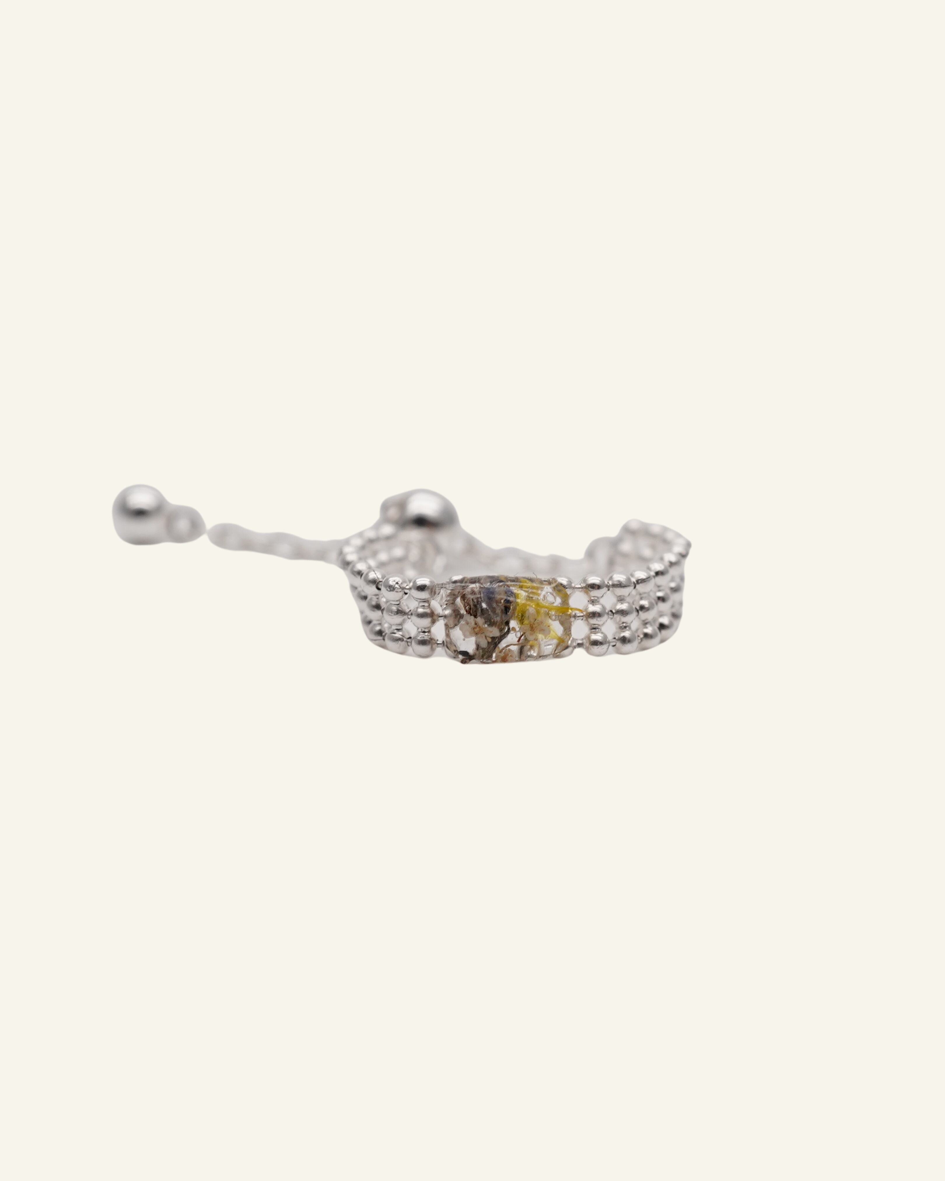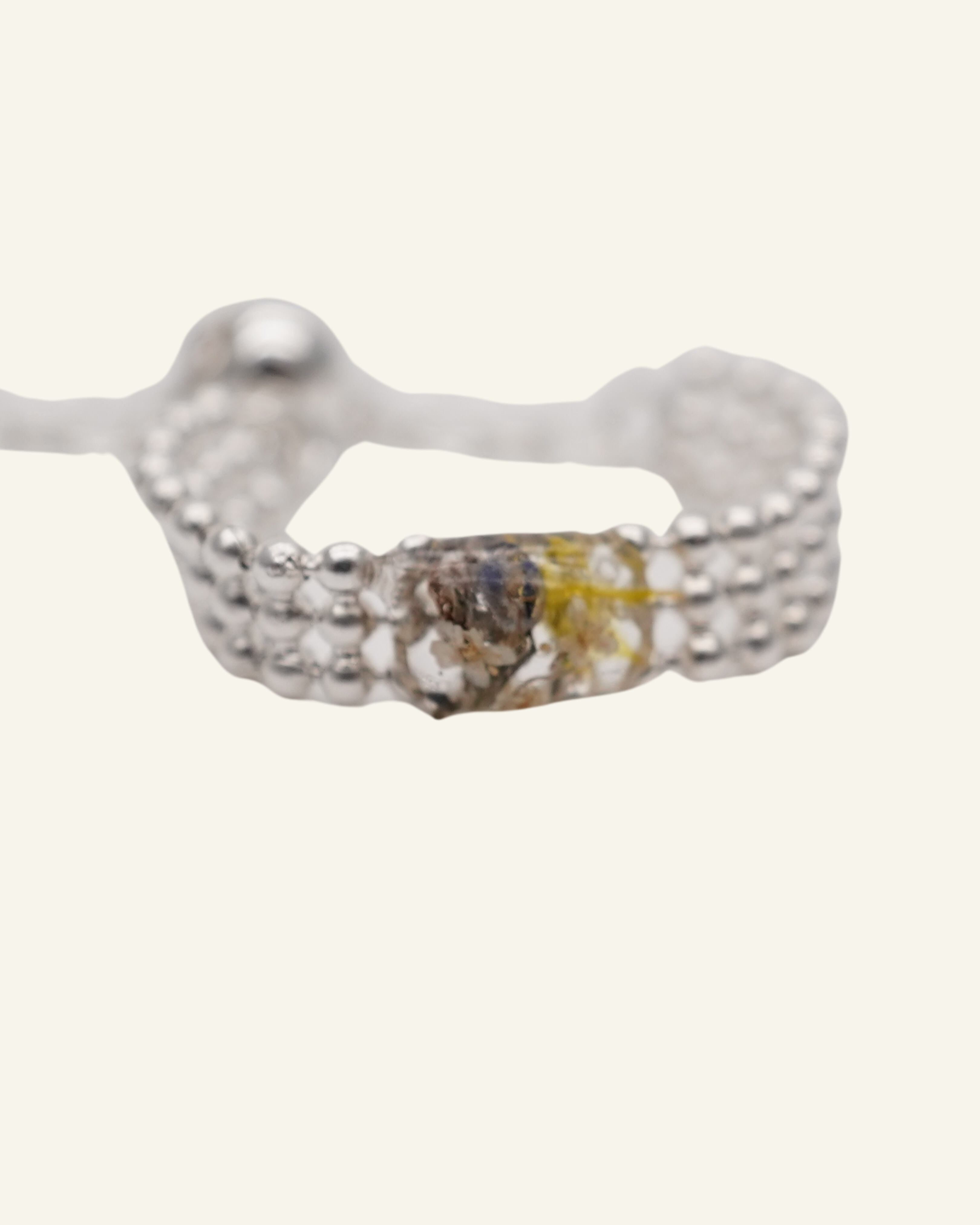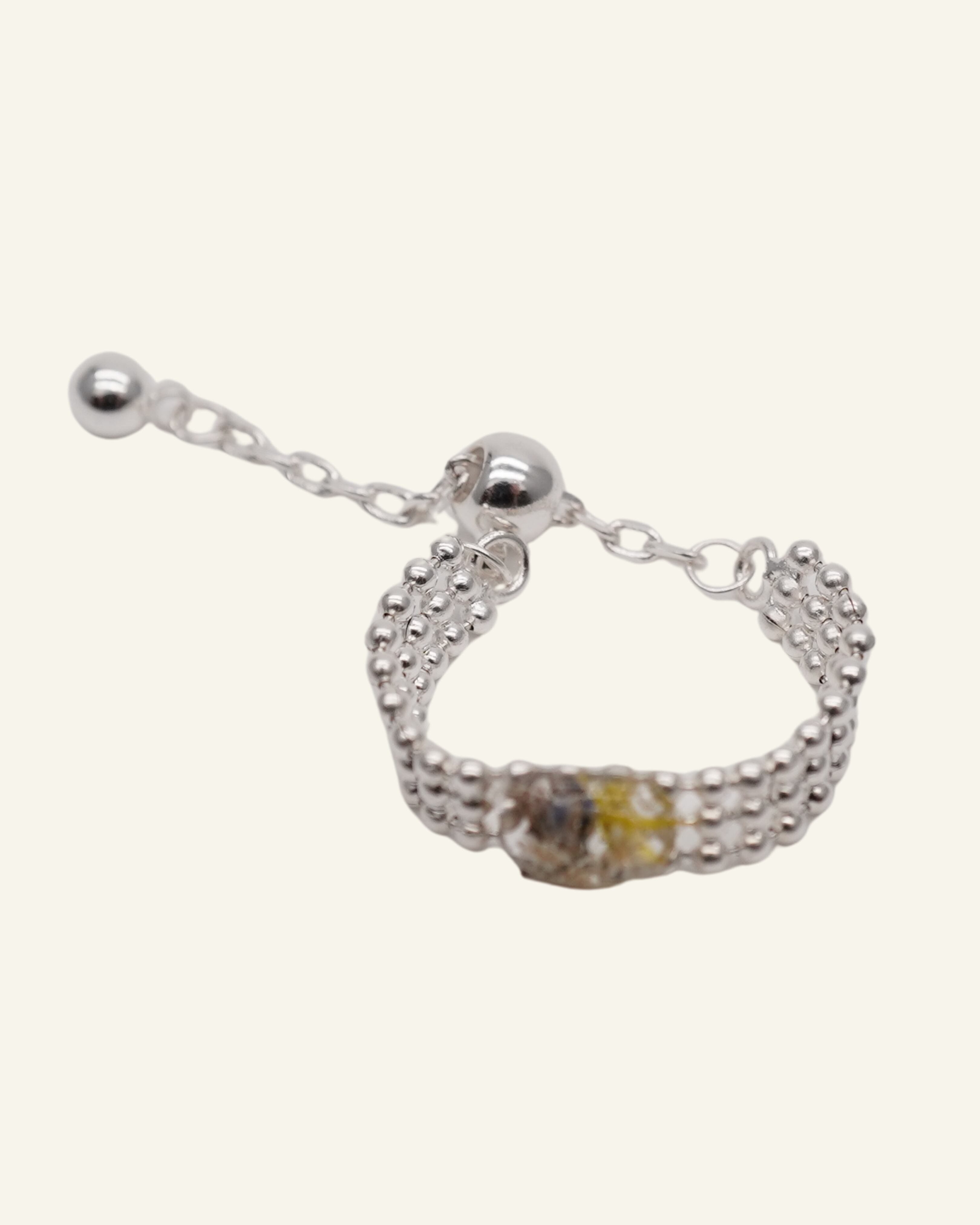 ドライフラワーを閉じ込めたパーツをチェーンに合わせたリング。