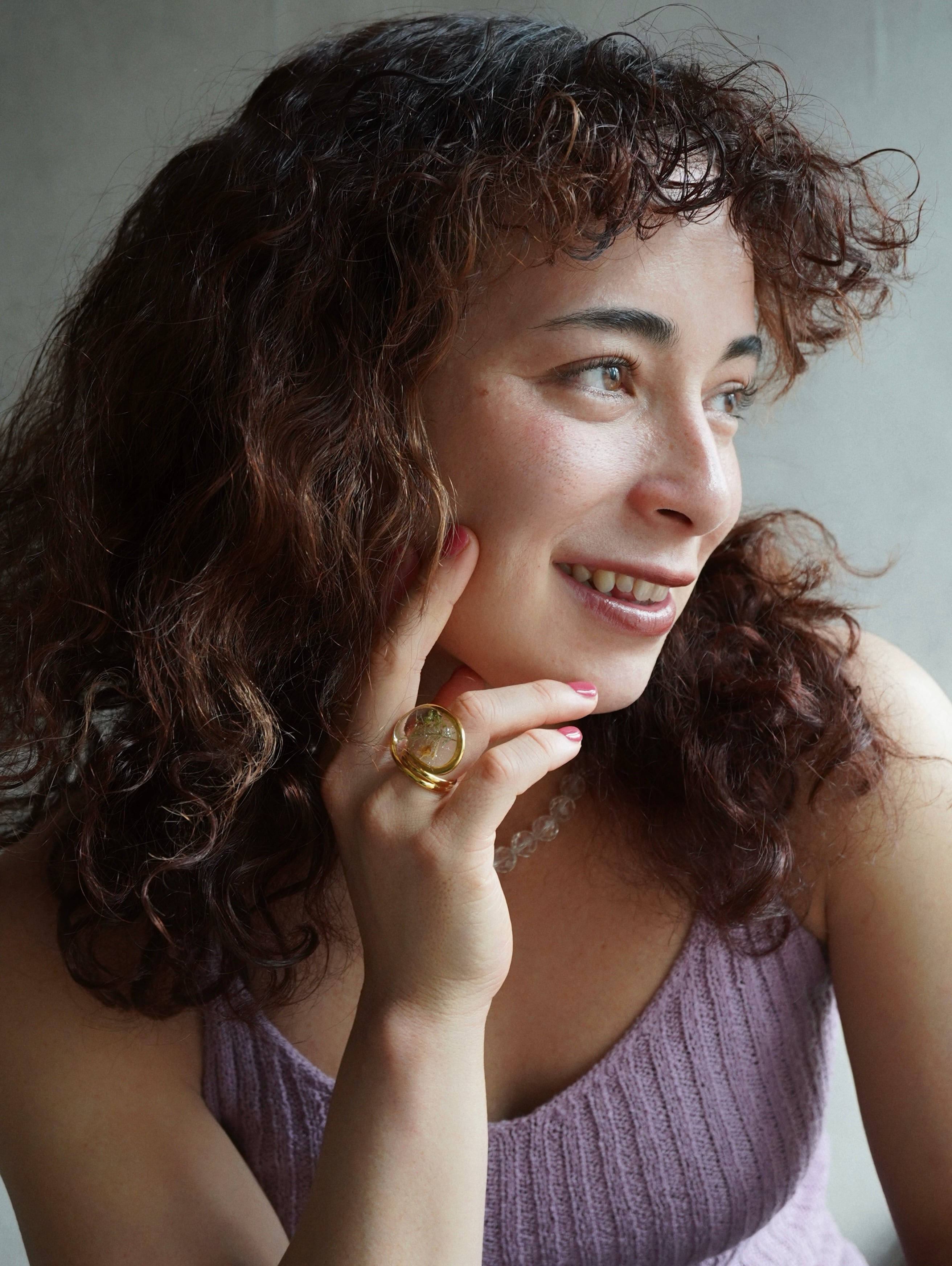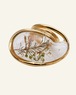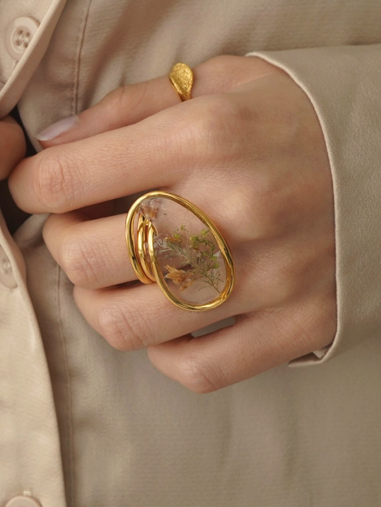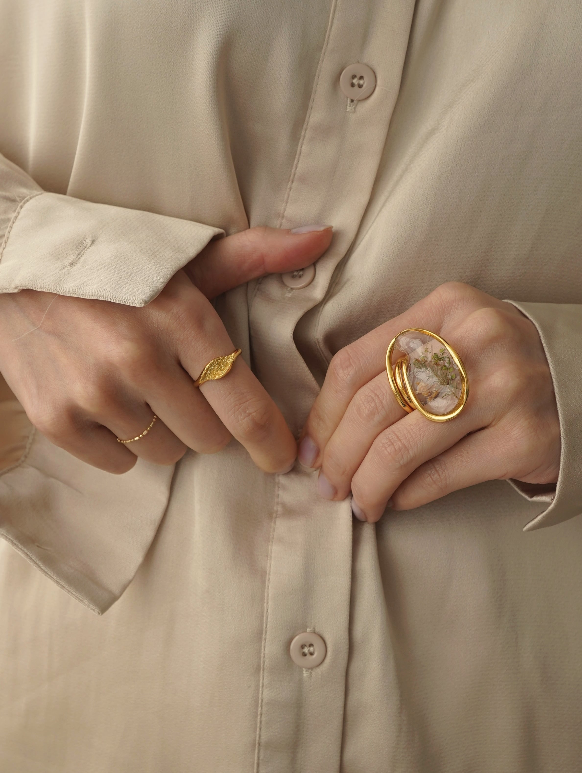 透明感のあるレジンの中にドライフラワーを閉じ込めた指輪です。光の当たり方や指の動きで表情が変わり、さりげないのに目に留まる存在感があります。