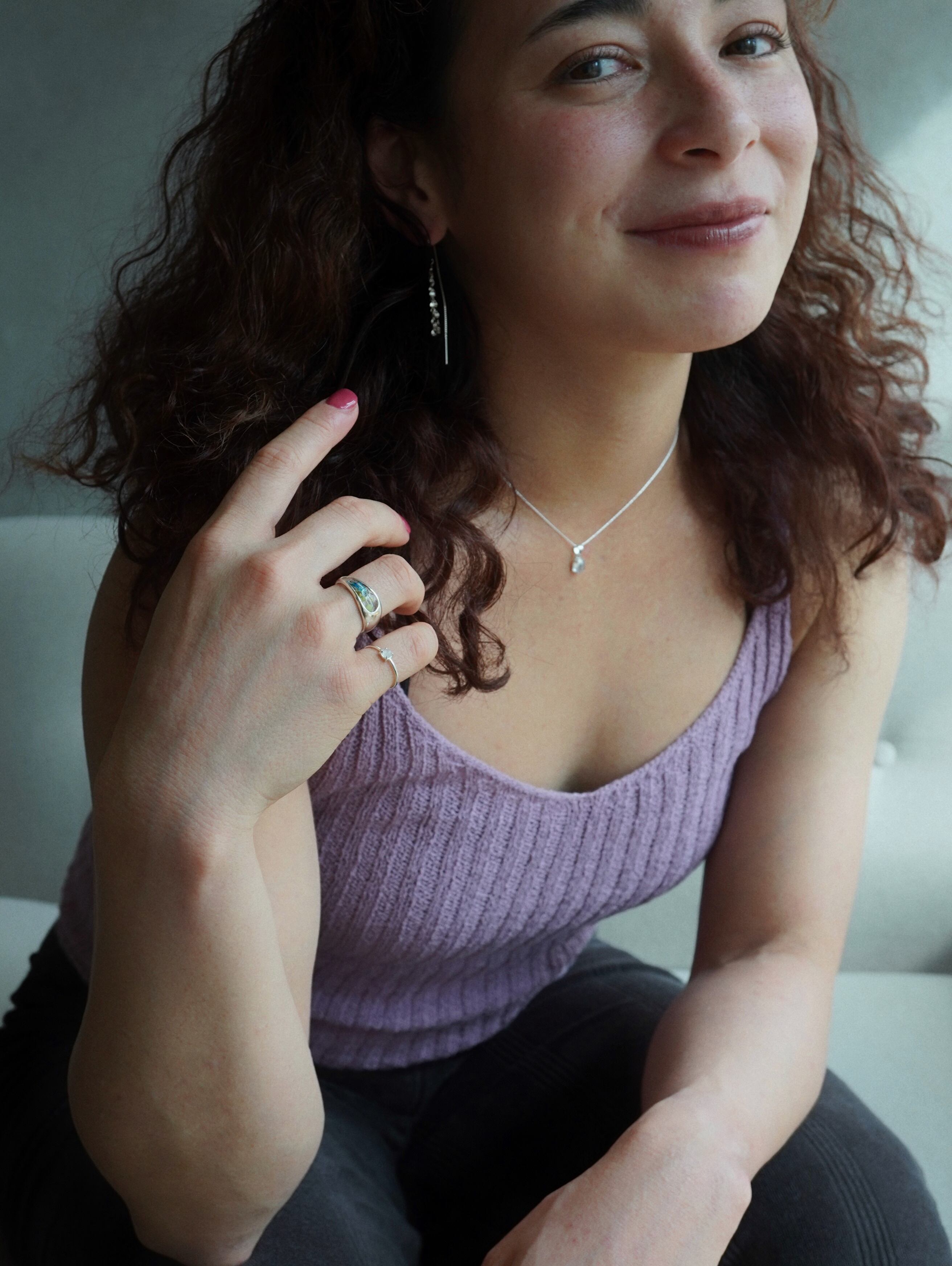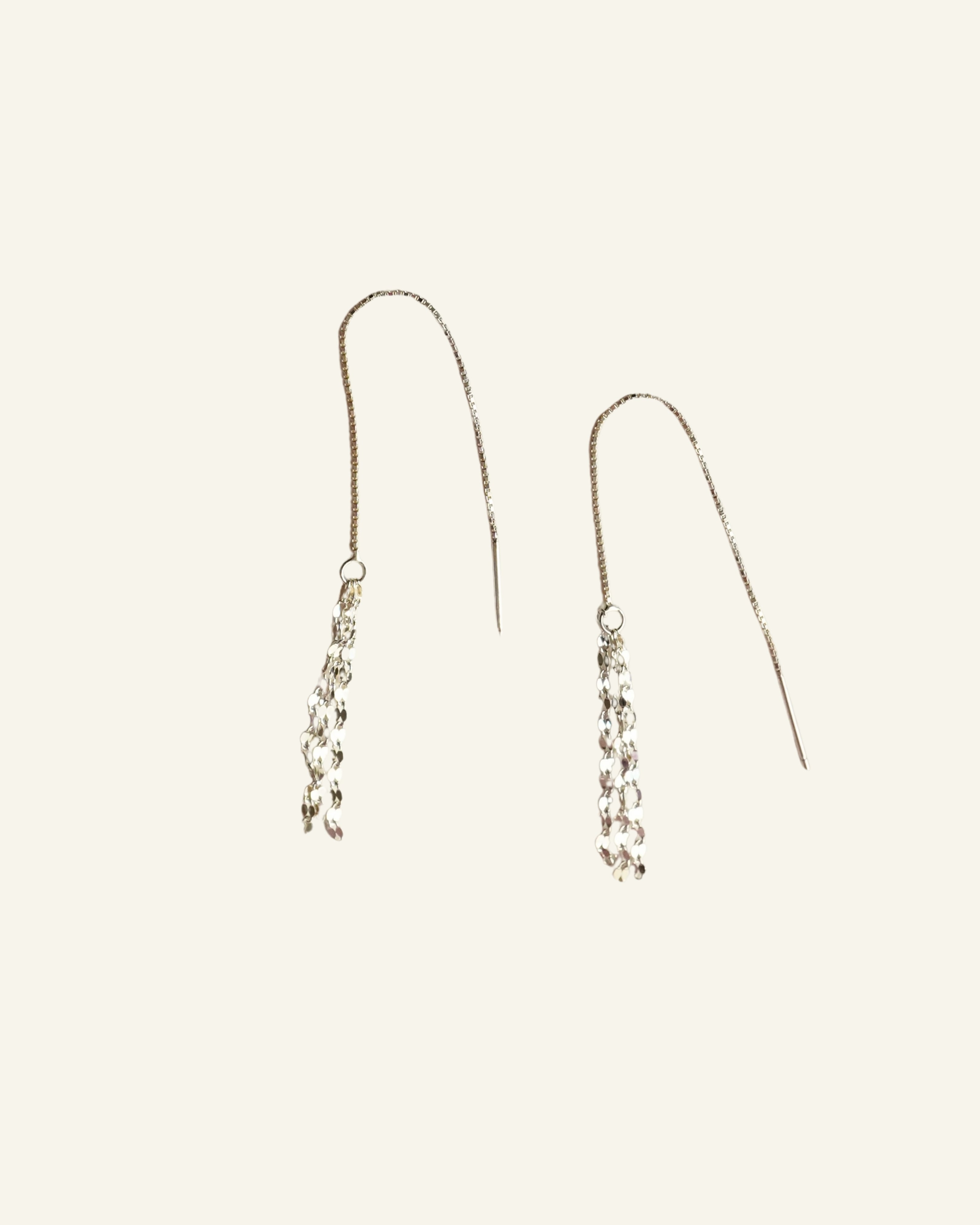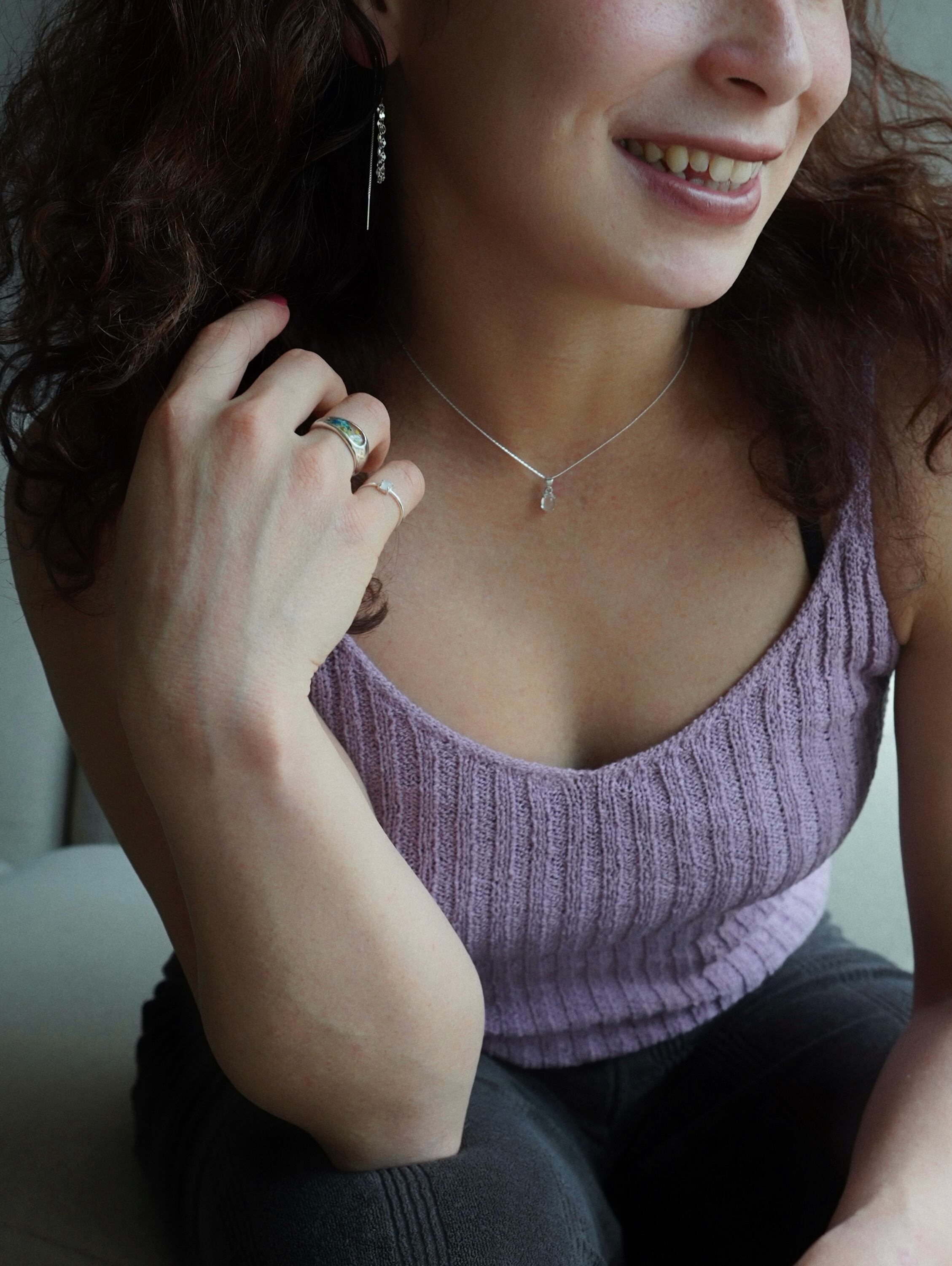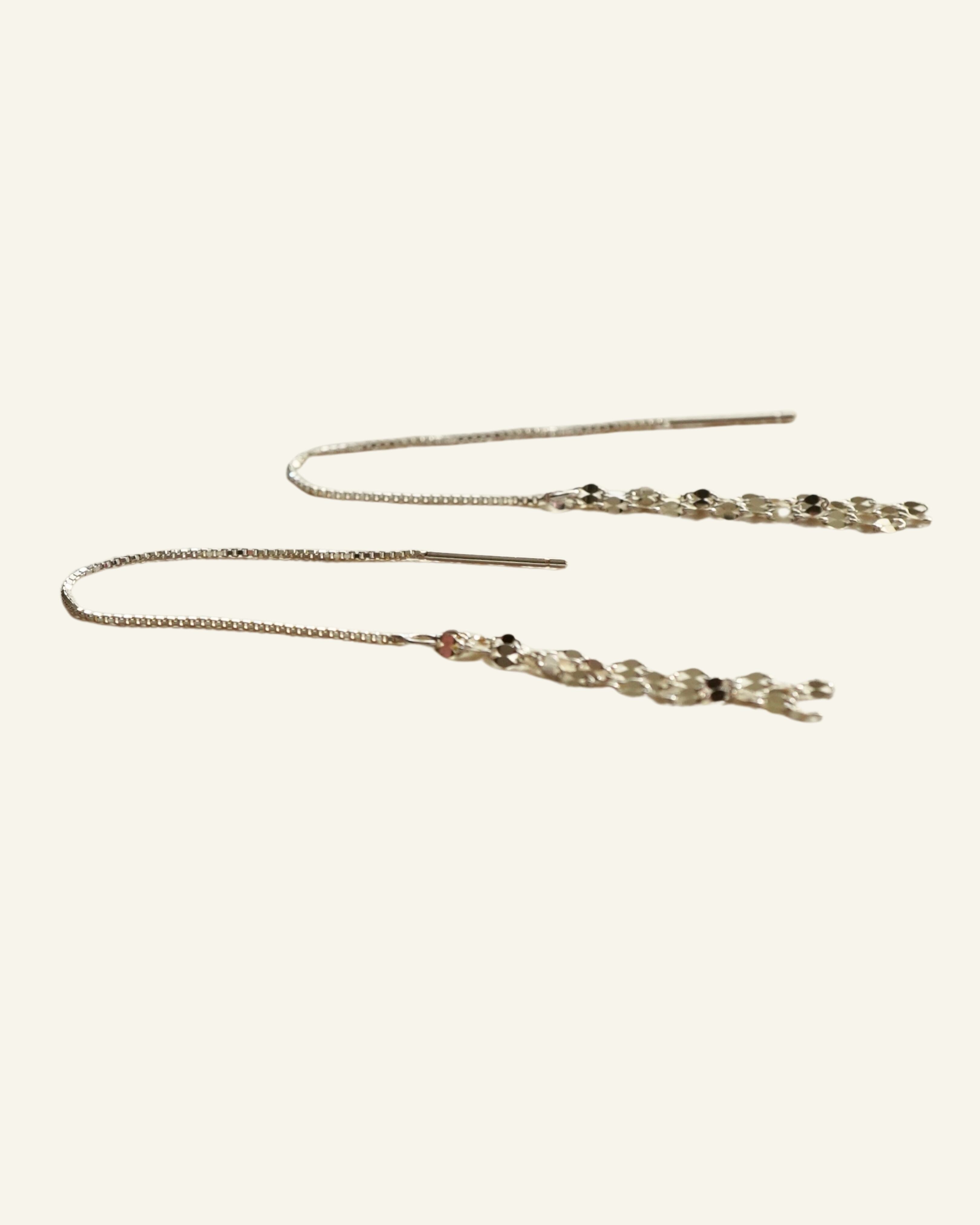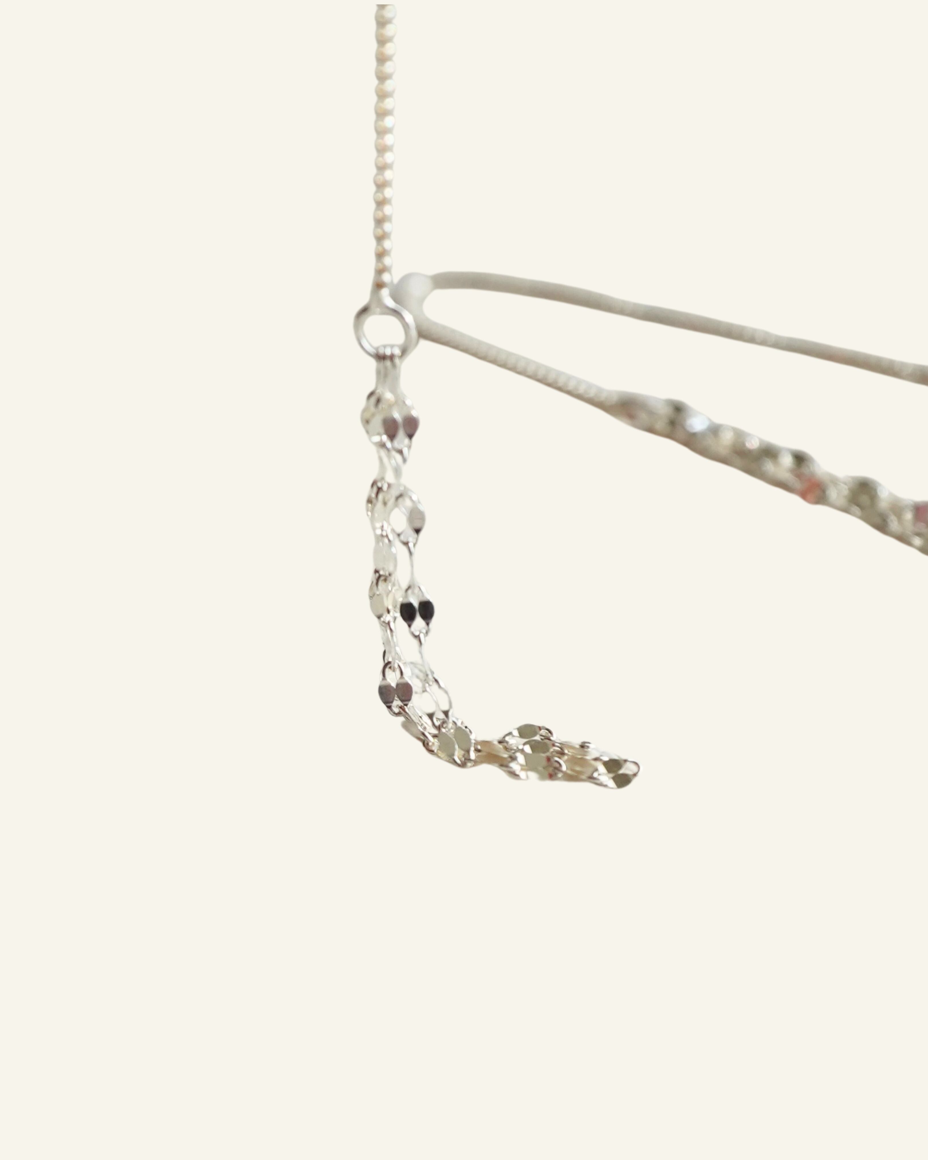 顔まわりで揺れすぎない長さと、光を線で拾うチェーンのバランスにこだわったピアスです。主張は控えめですが、動いたときに自然と視線が集まり、横顔に奥行きが出ます。シルバー925ならではの軽さがあるため、長時間つけても耳が疲れにくく、日常使いしやすい一本です。きれいめにもカジュアルにも寄せすぎず、服を選ばず使えるのもポイントです。