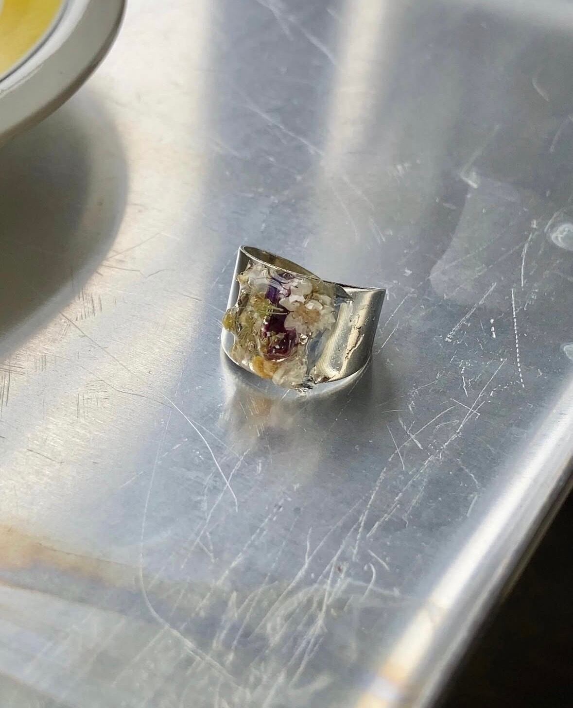 ドライフラワーの色や配置をあえて整えすぎず、その瞬間のバランスをそのまま閉じ込めたリング。