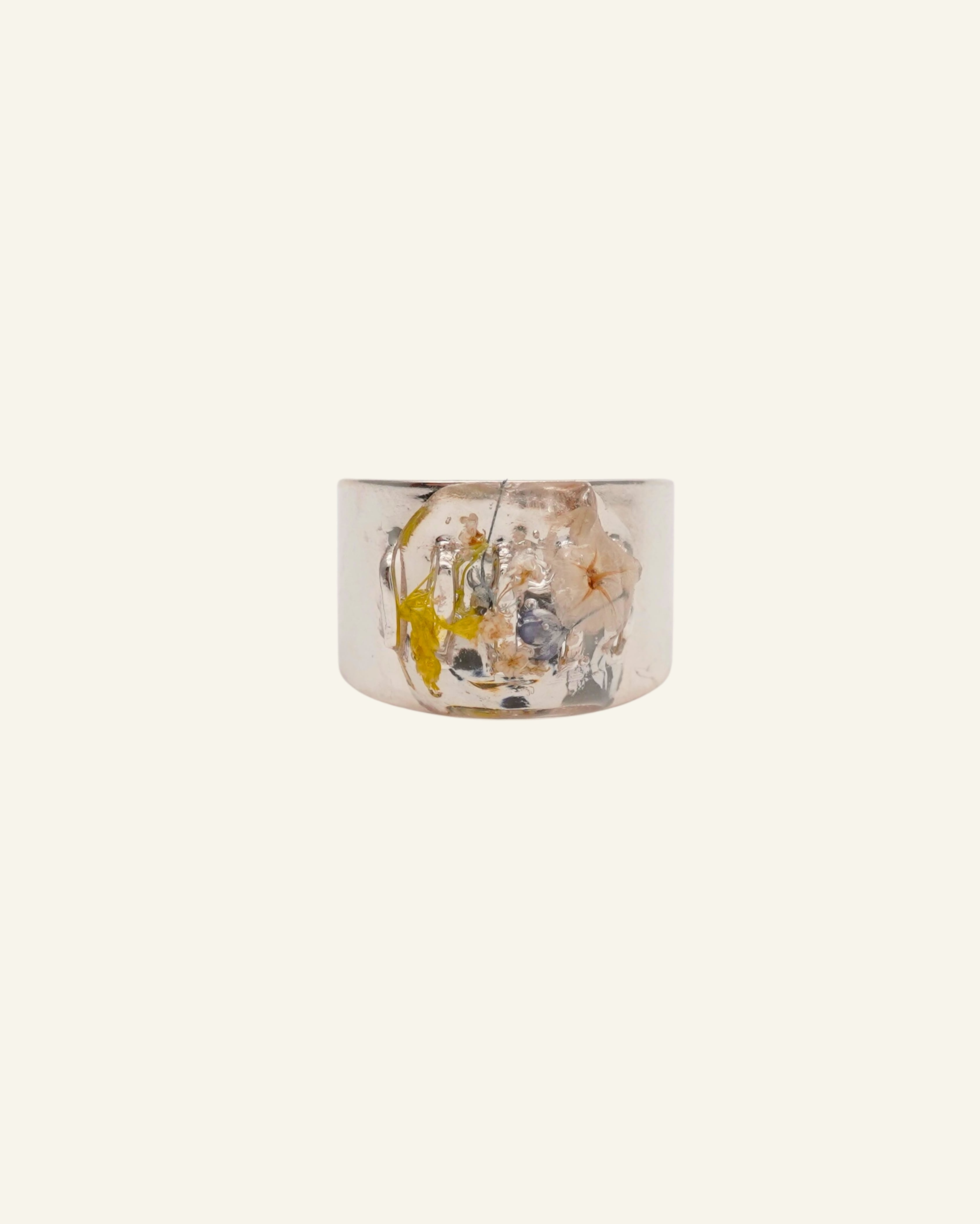 ドライフラワーの色や配置をあえて整えすぎず、その瞬間のバランスをそのまま閉じ込めたリング。