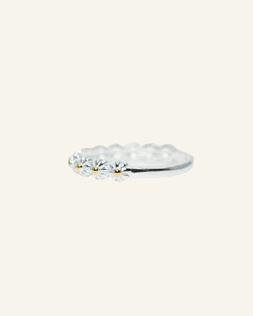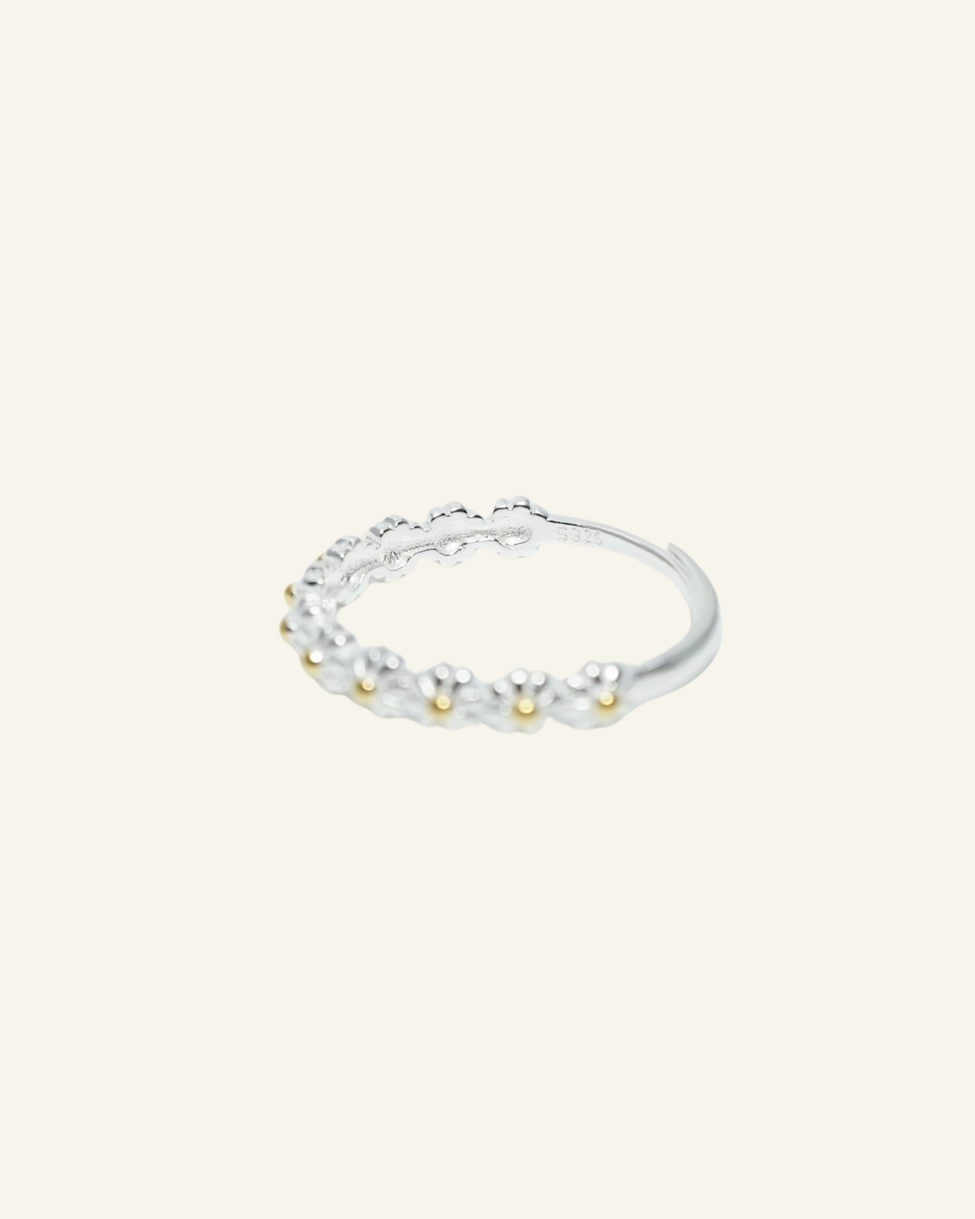 お花をモチーフにした繊細なデザインが指先を美しく飾り、光を受けるたびに上品な輝きを放つリング。