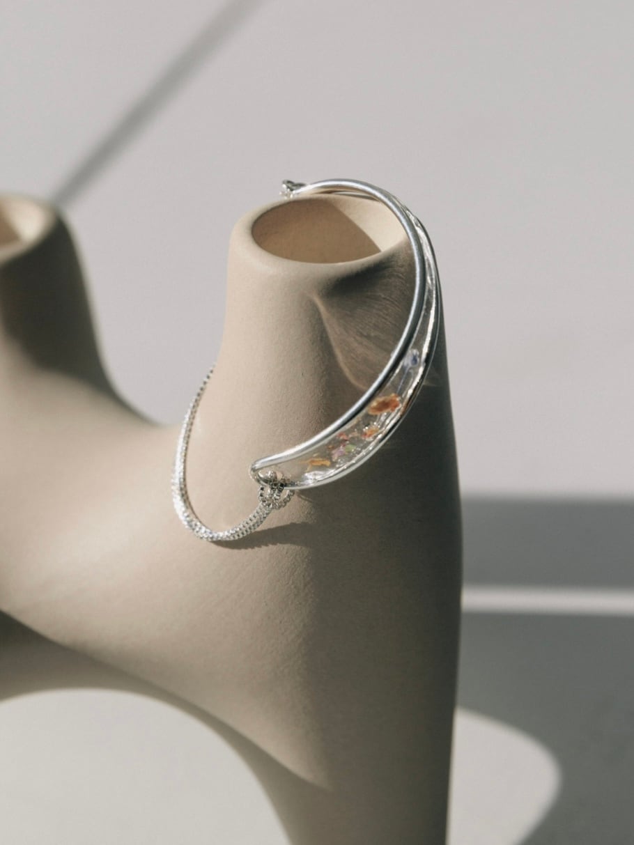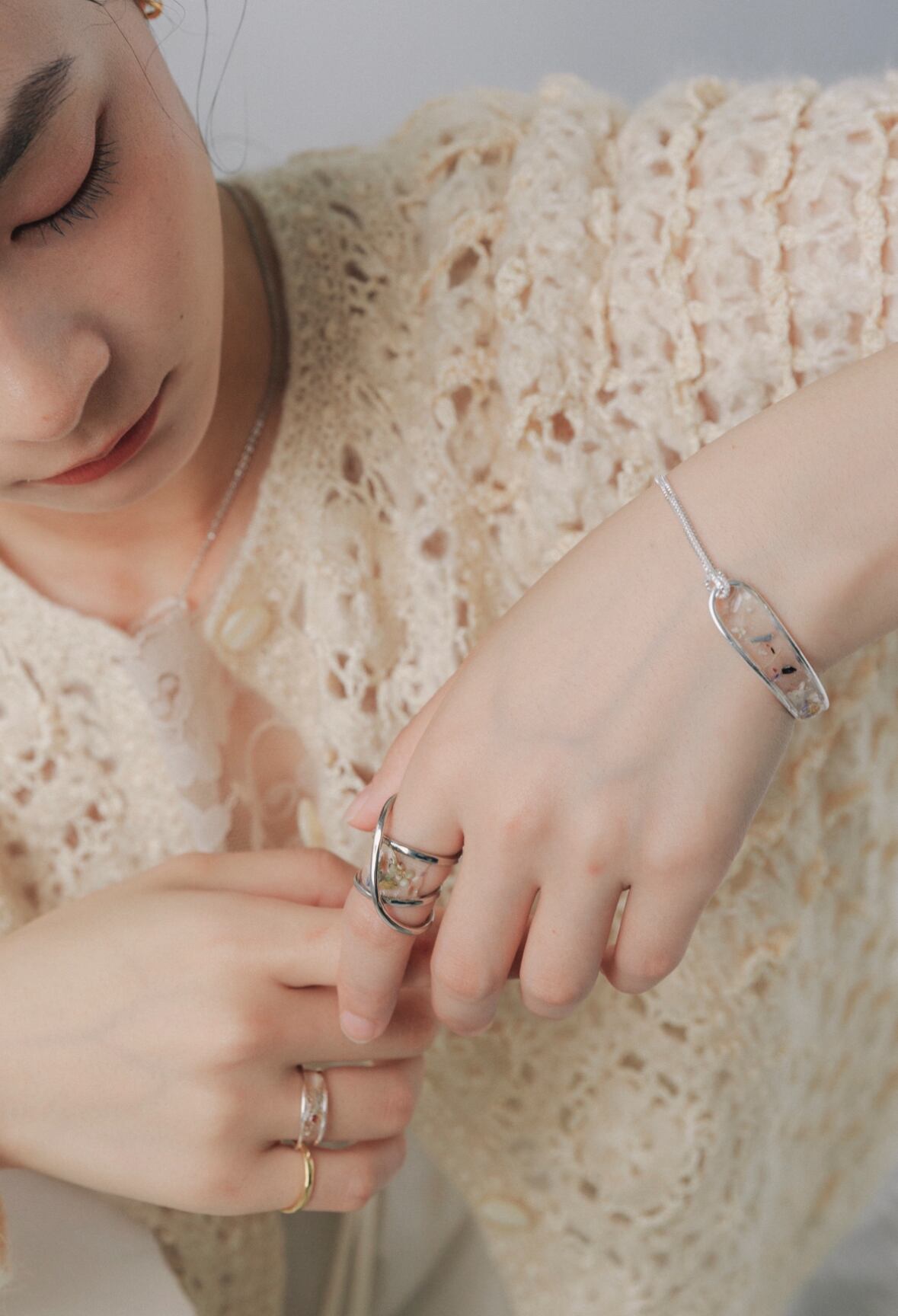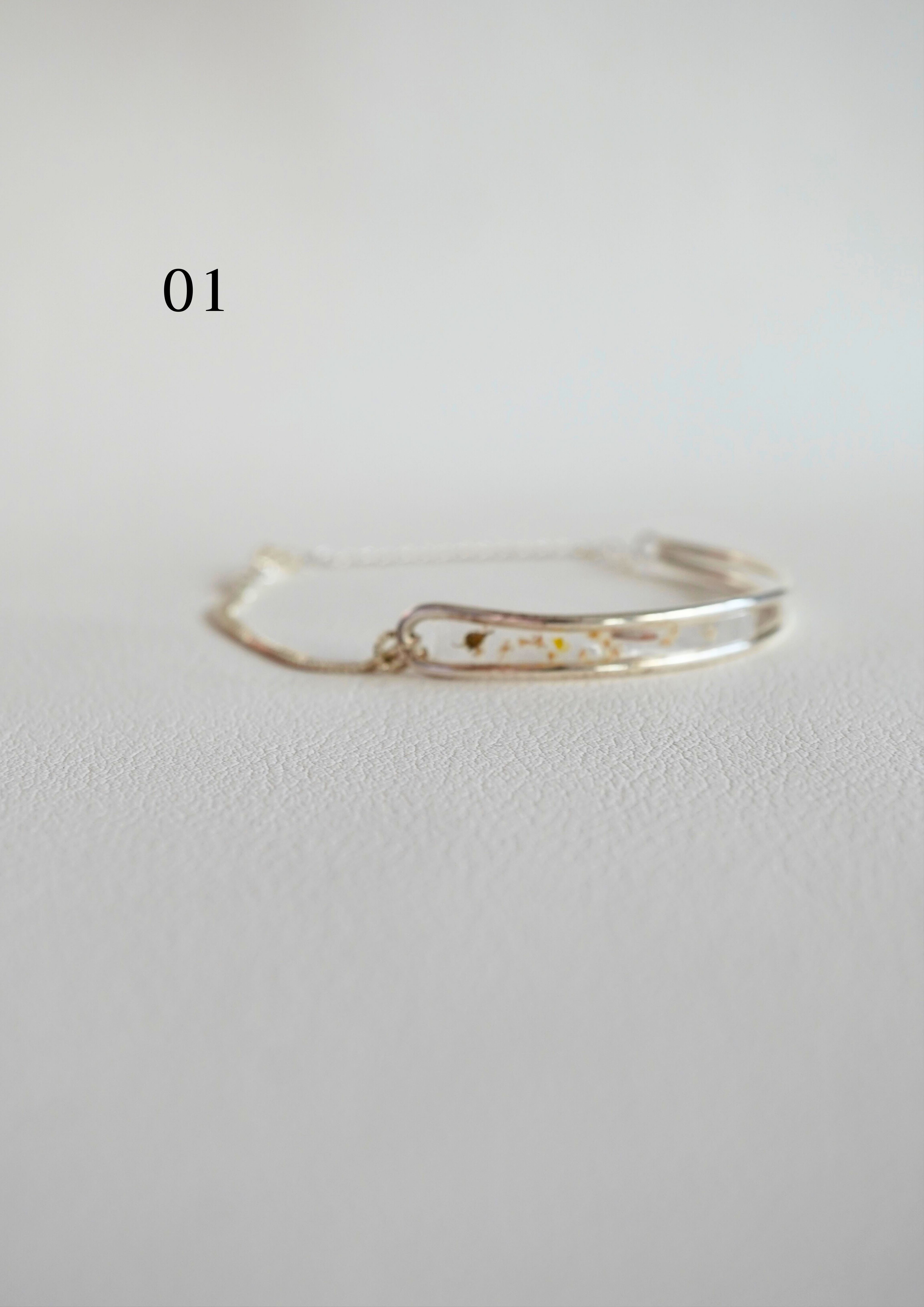 クールな2連のメタルチェーンのブレスレット。これ一つで簡単にレイヤードスタイルが完成します。中に閉じ込めたドライフラワーが可愛くなりすぎず、スタイリッシュでモード感あふれる手元に仕上がります。