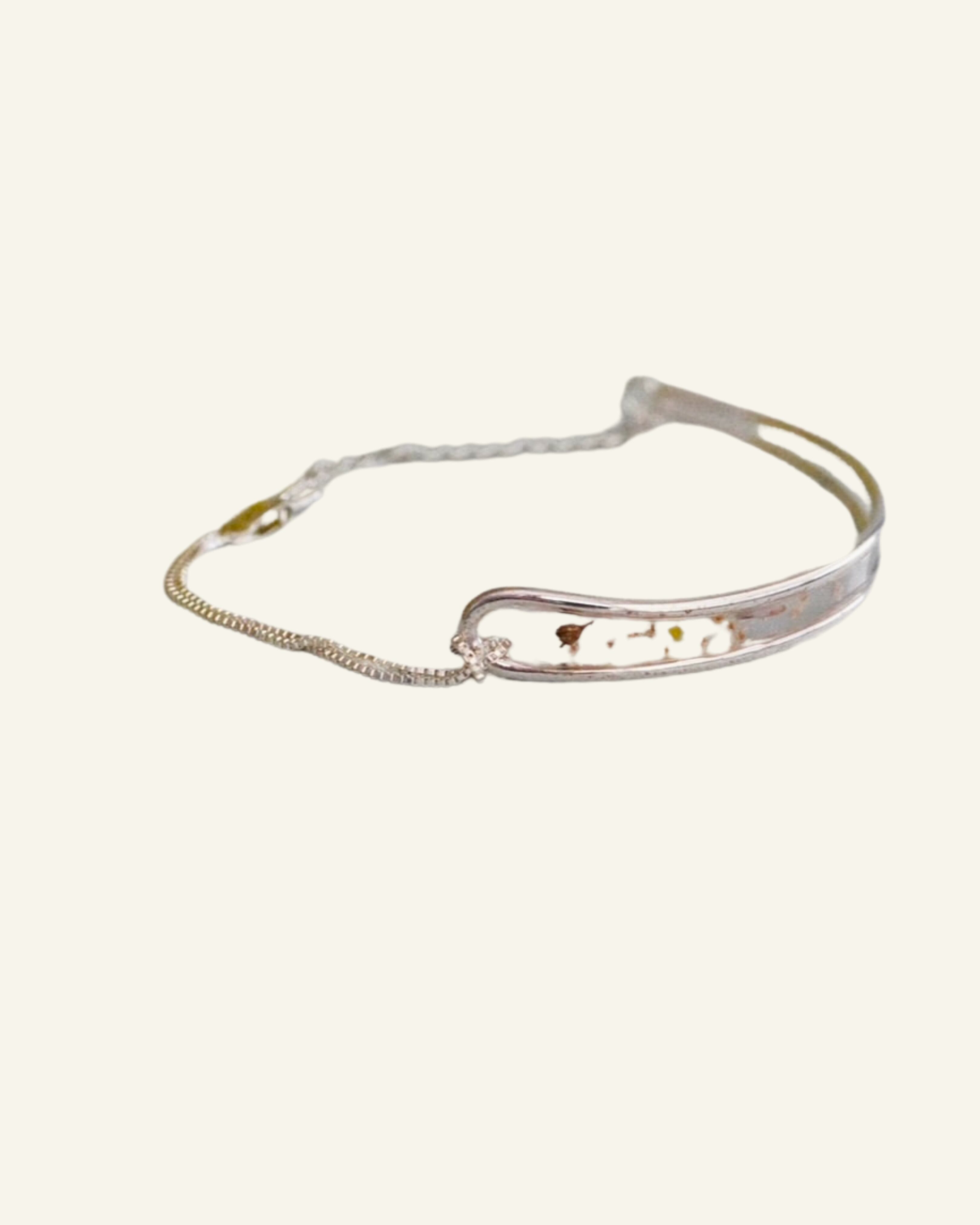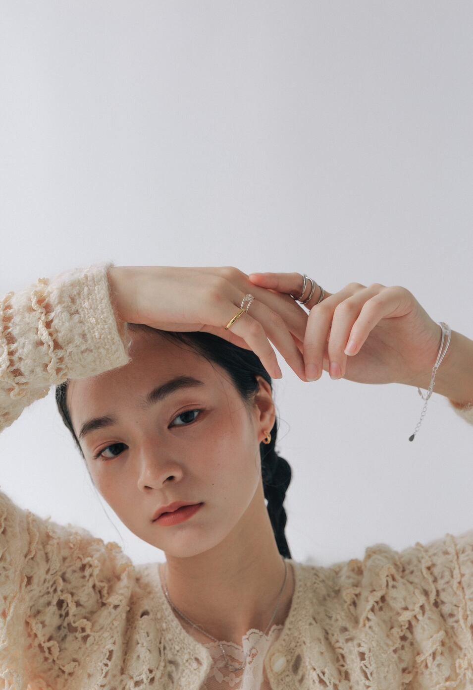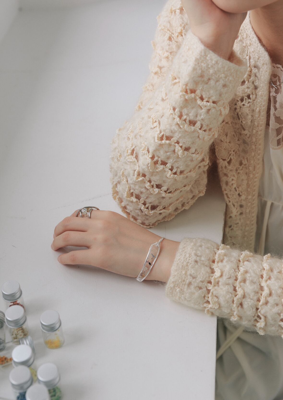クールな2連のメタルチェーンのブレスレット。これ一つで簡単にレイヤードスタイルが完成します。中に閉じ込めたドライフラワーが可愛くなりすぎず、スタイリッシュでモード感あふれる手元に仕上がります。