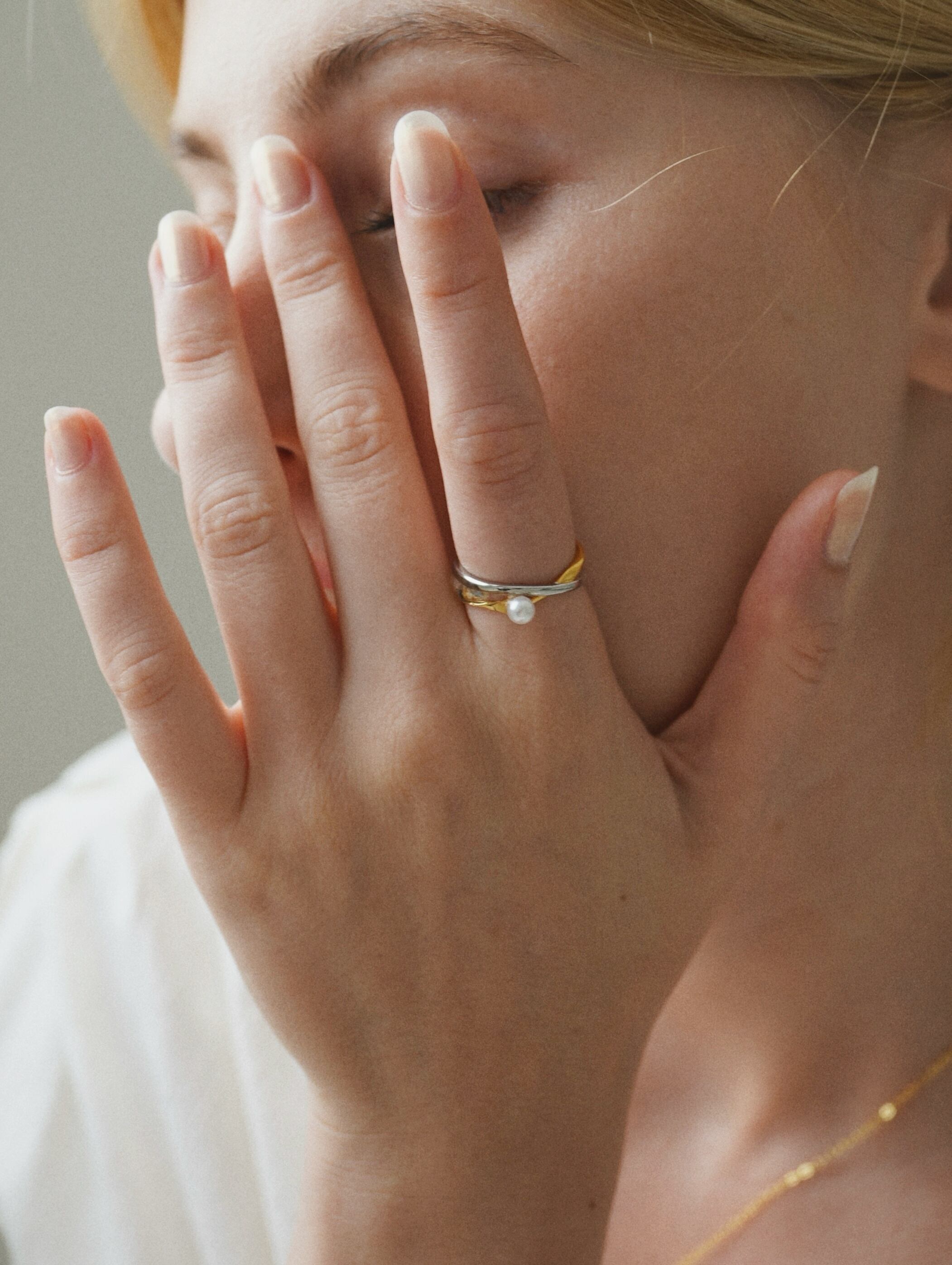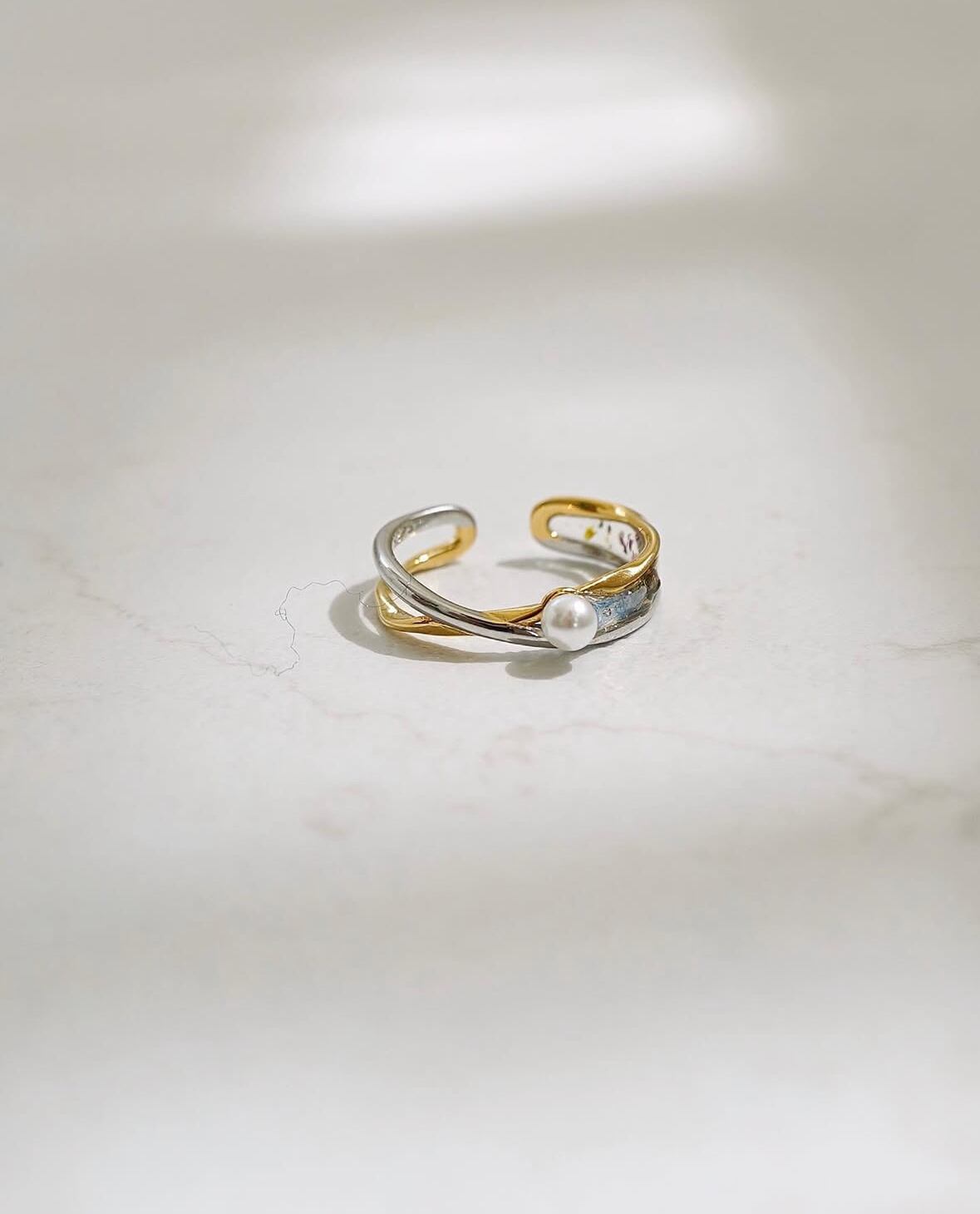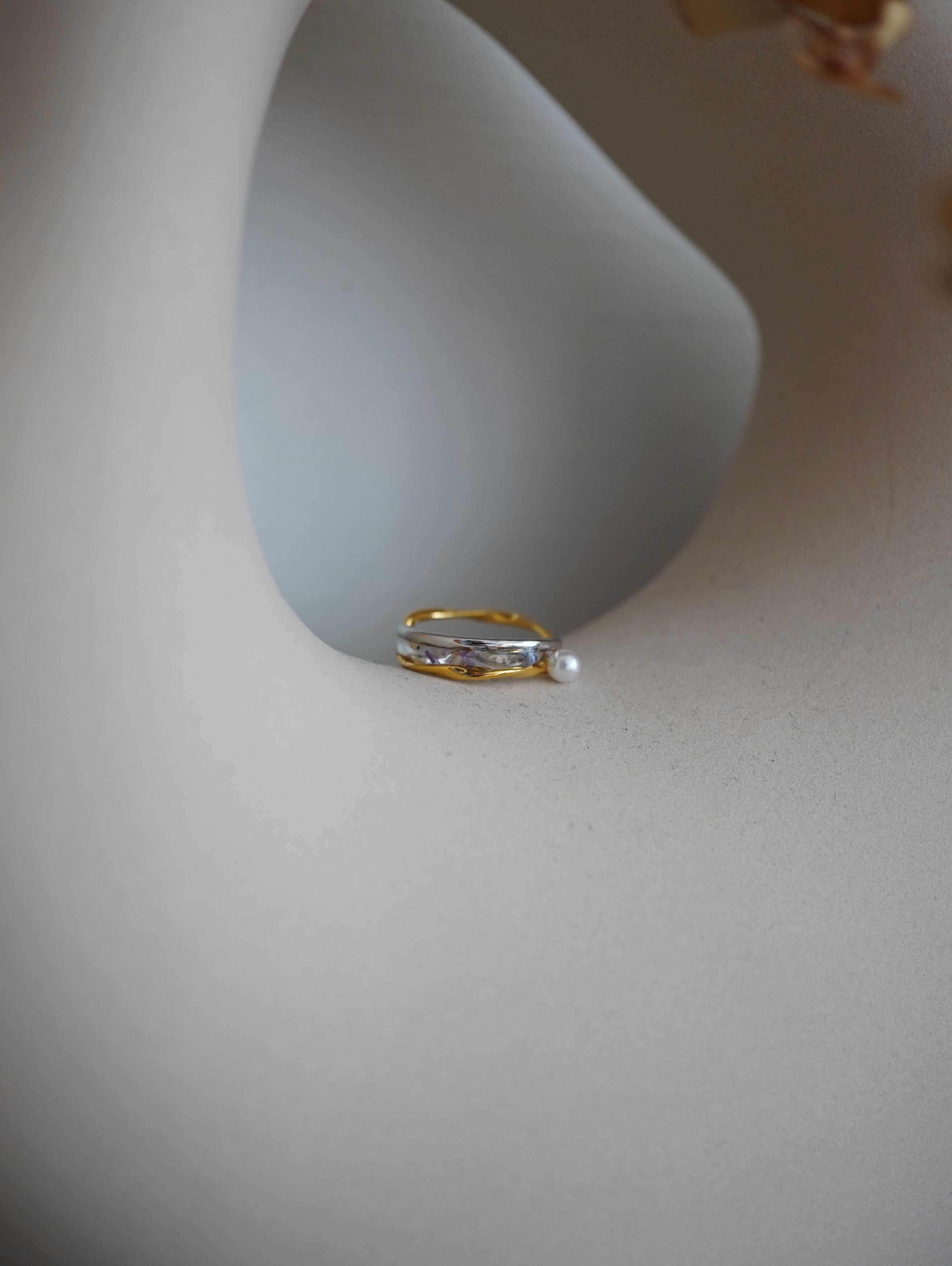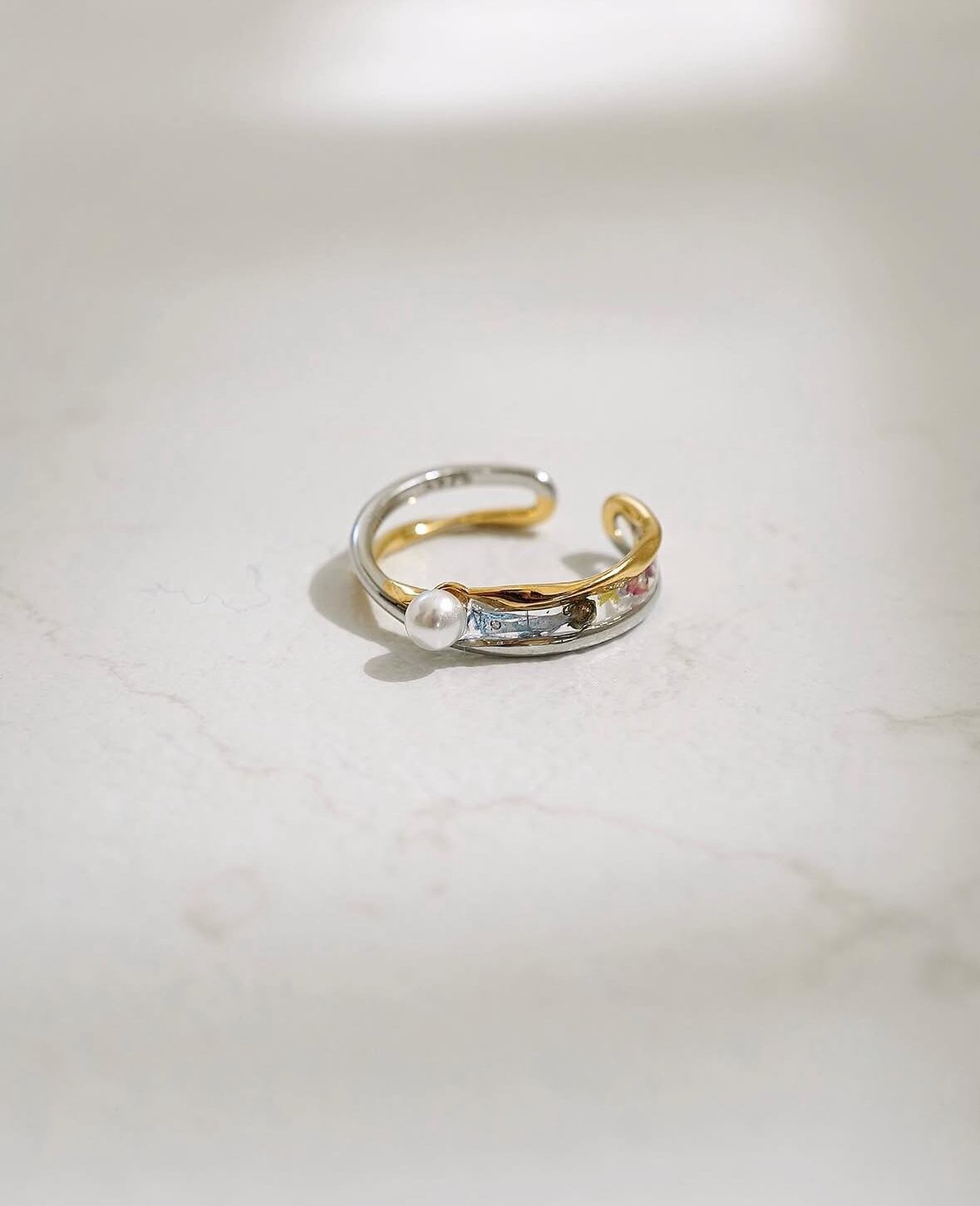 ゴールド×シルバーのパールリング。リング裏が割れているため、多少のゆとりがあります。メタルパーツをクロスさせ、その中にフラワーを閉じ込めました。程よい大きさの一粒のパールが手元でキラッと輝き、上品さを演出します。