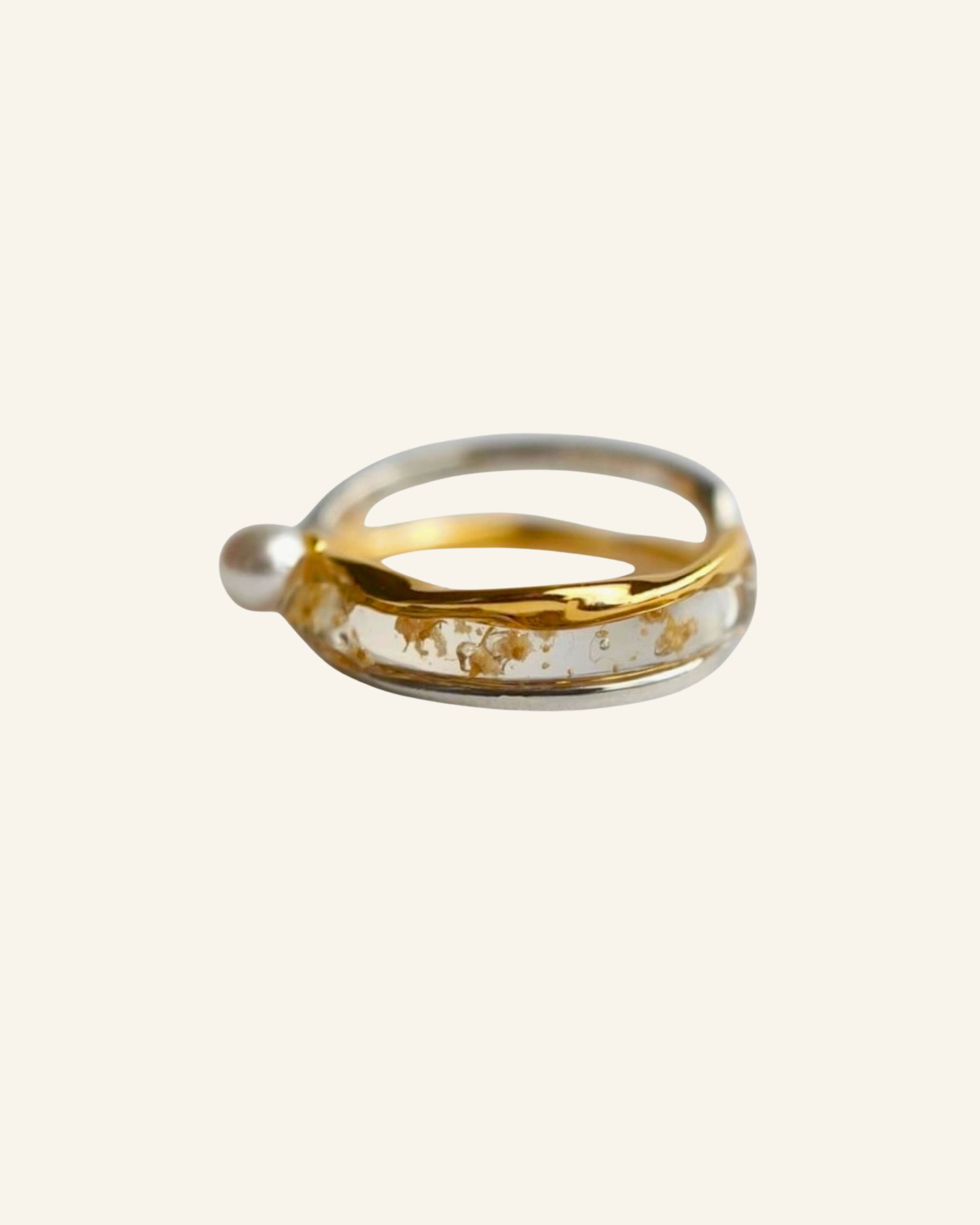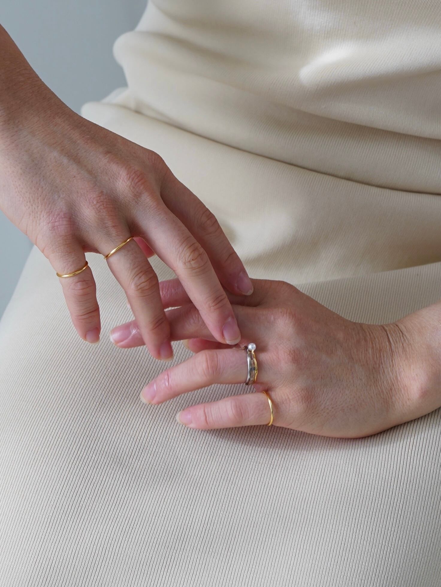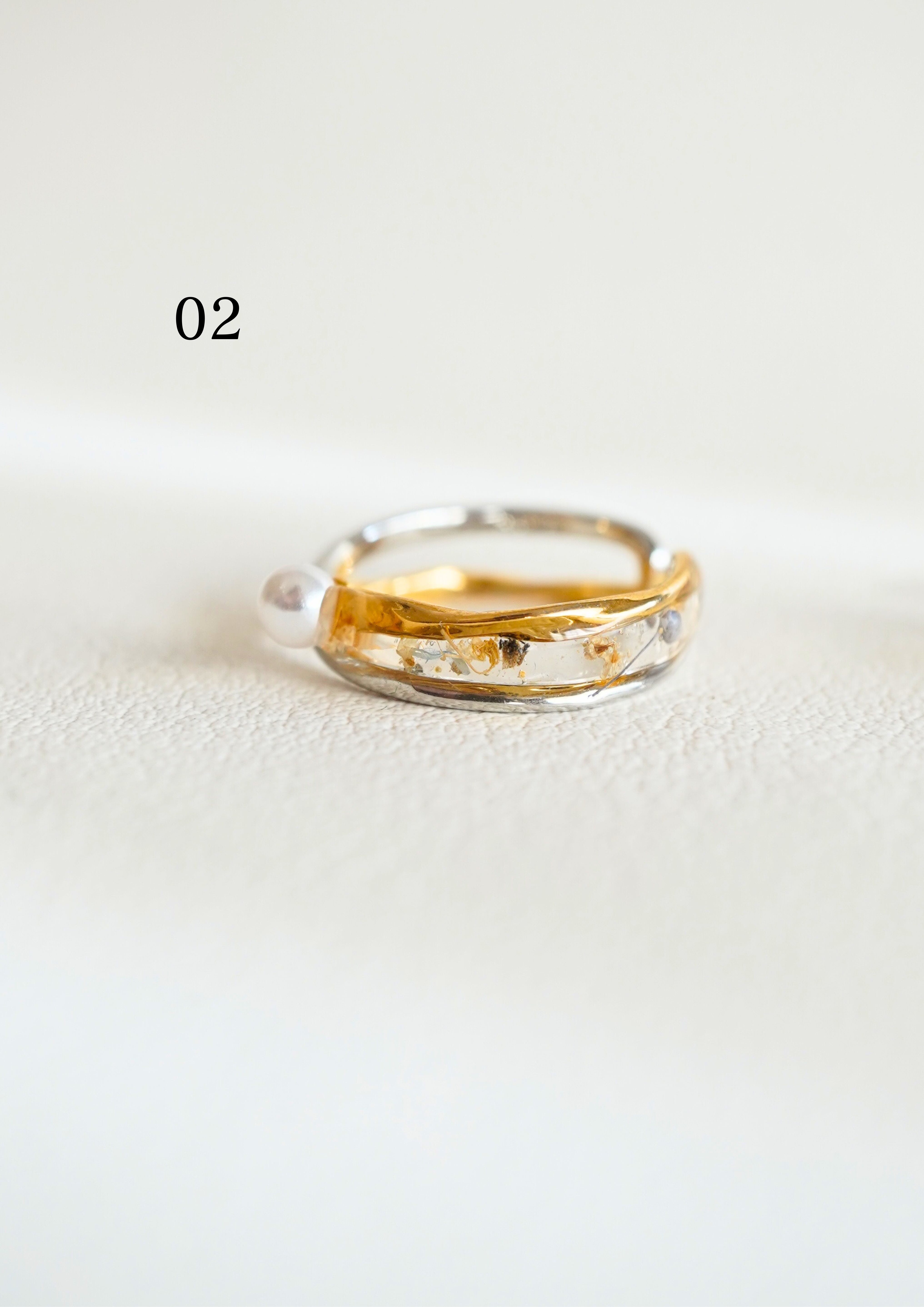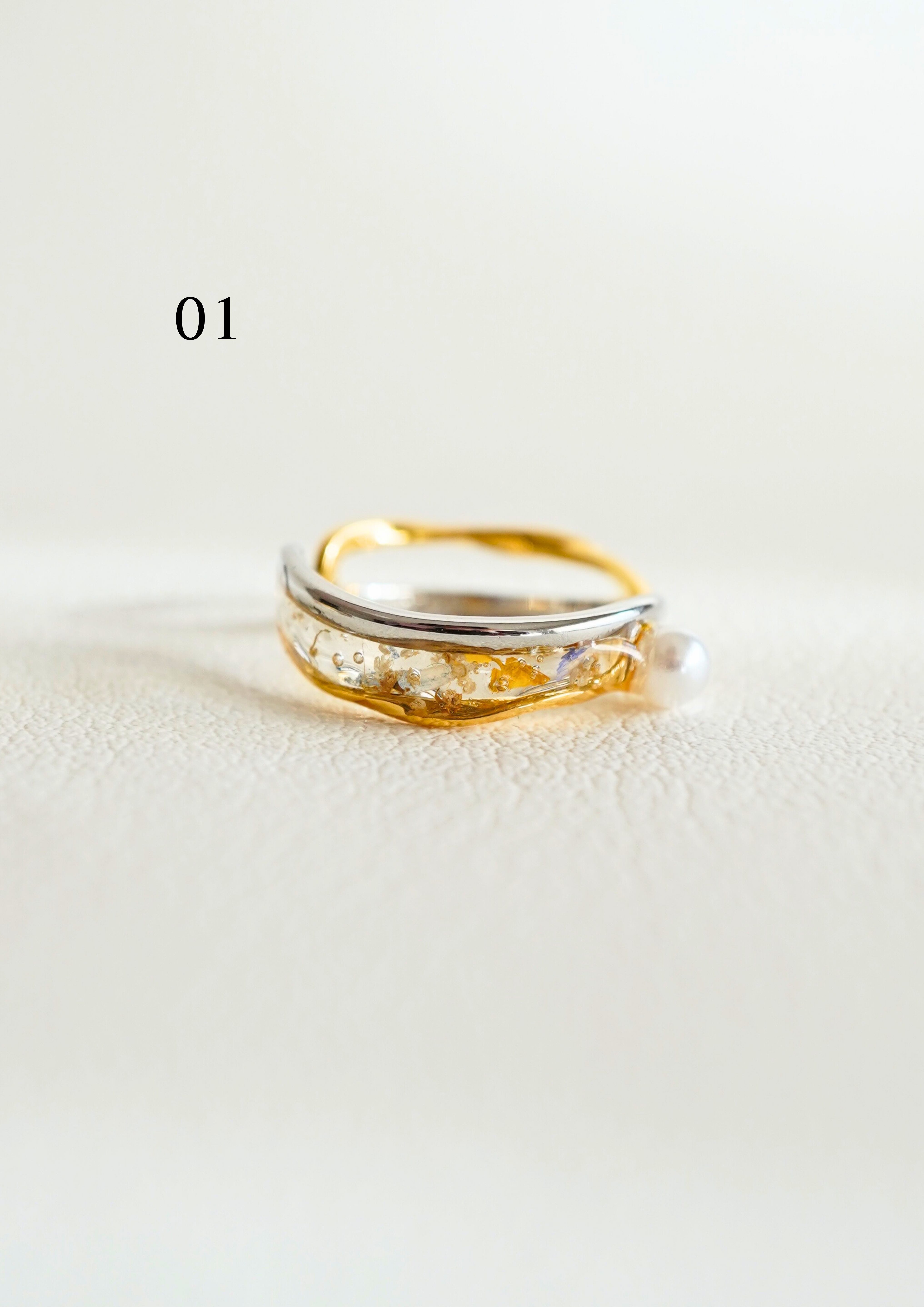ゴールド×シルバーのパールリング。リング裏が割れているため、多少のゆとりがあります。メタルパーツをクロスさせ、その中にフラワーを閉じ込めました。程よい大きさの一粒のパールが手元でキラッと輝き、上品さを演出します。