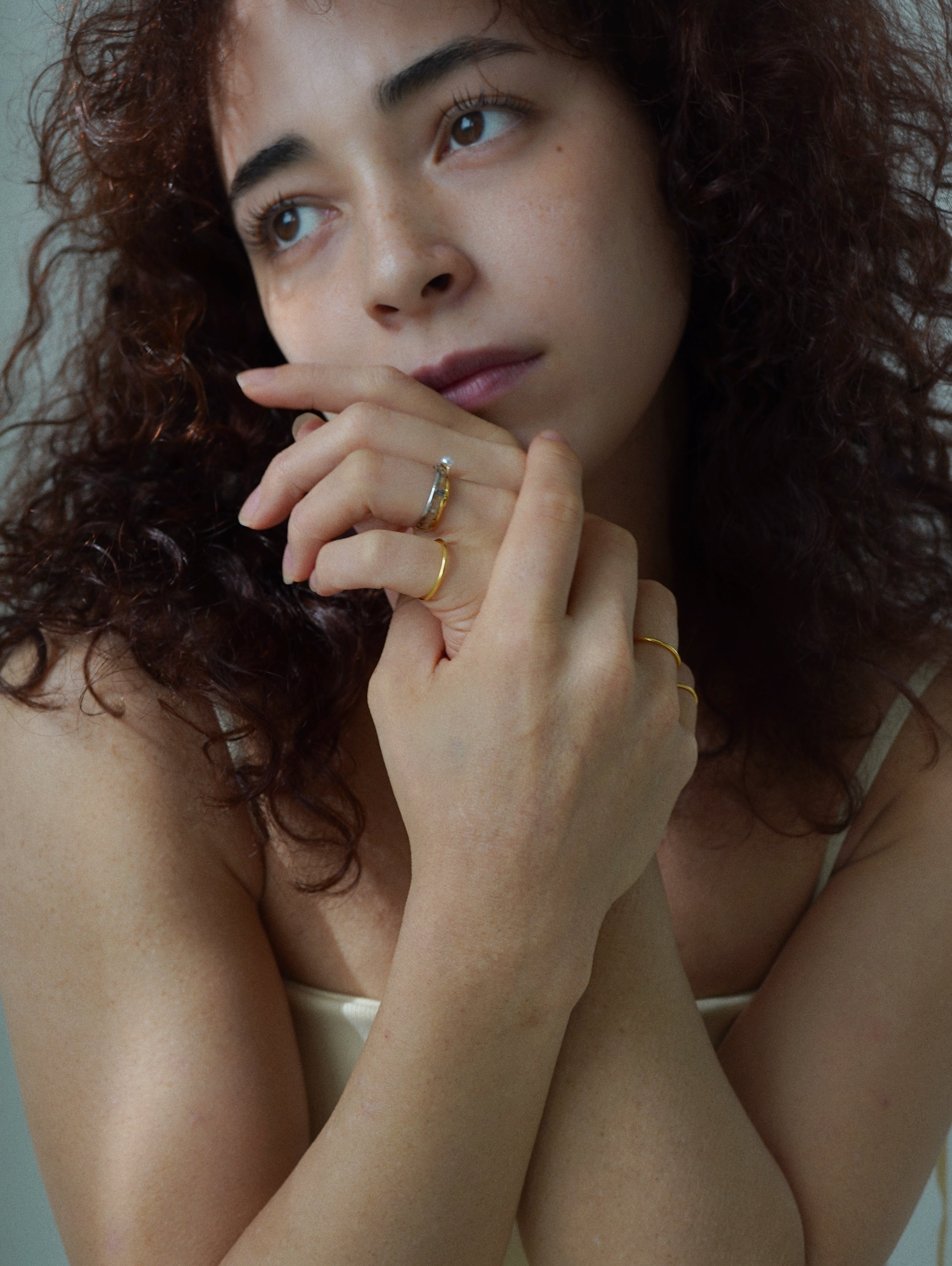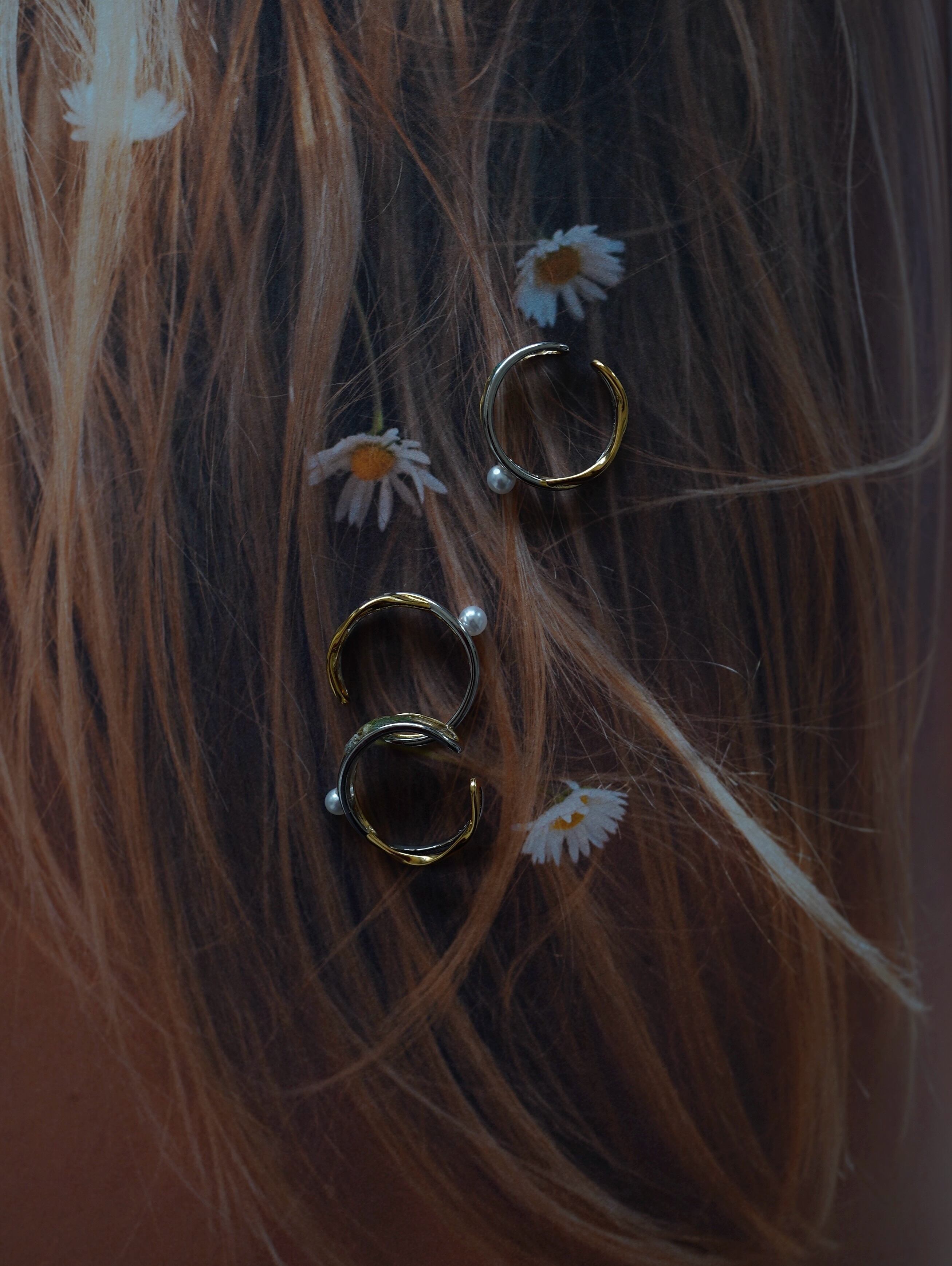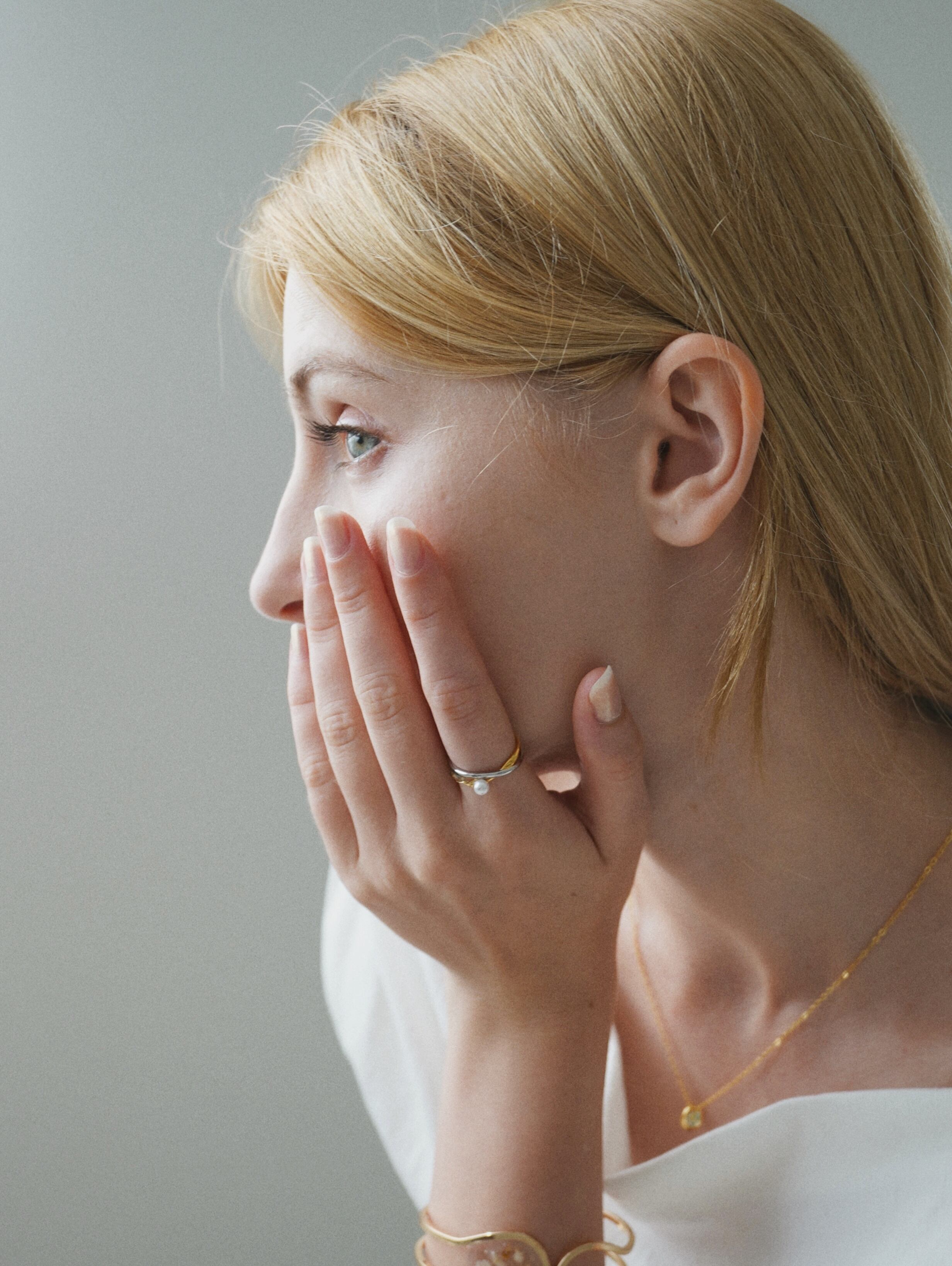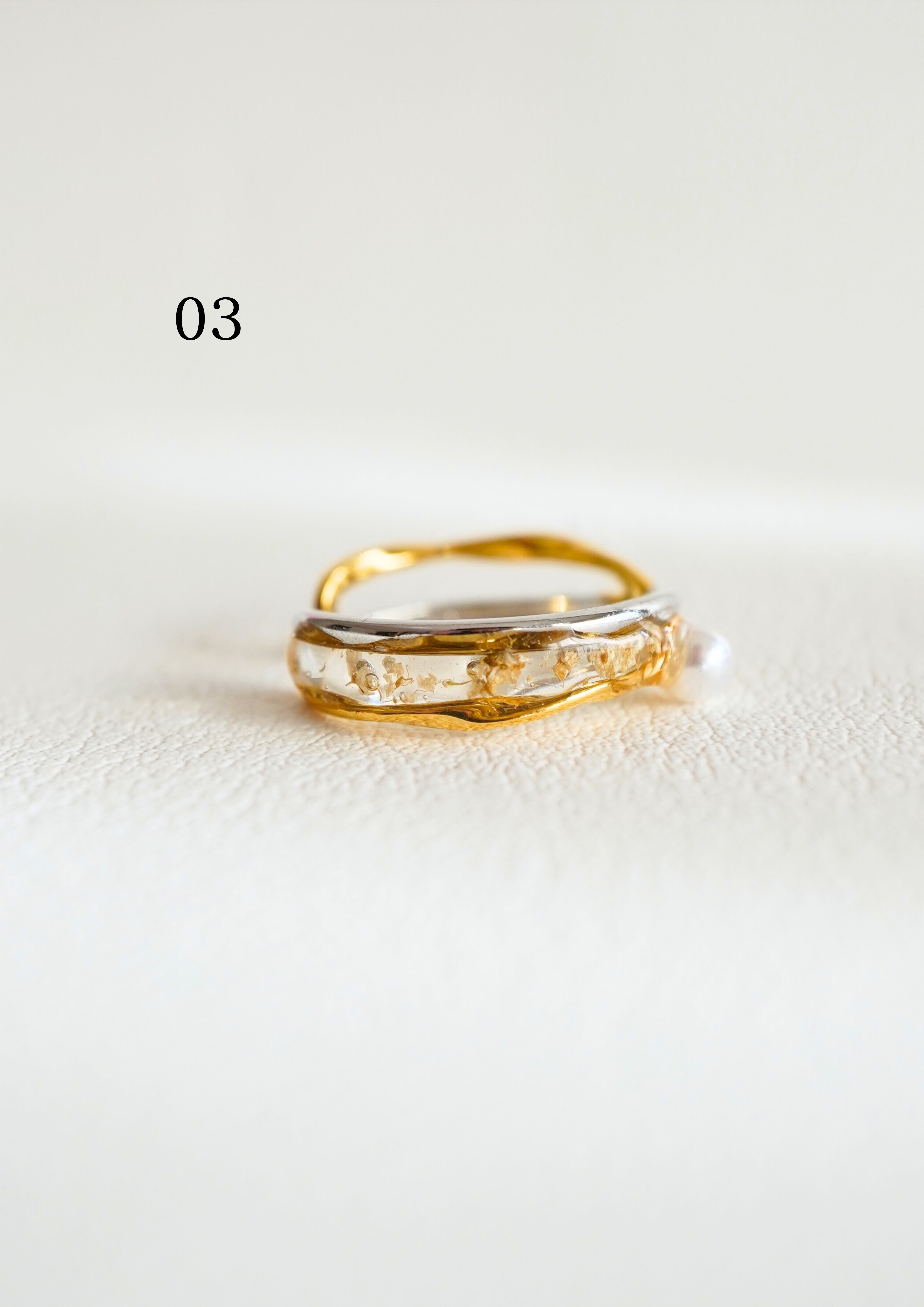ゴールド×シルバーのパールリング。リング裏が割れているため、多少のゆとりがあります。メタルパーツをクロスさせ、その中にフラワーを閉じ込めました。程よい大きさの一粒のパールが手元でキラッと輝き、上品さを演出します。