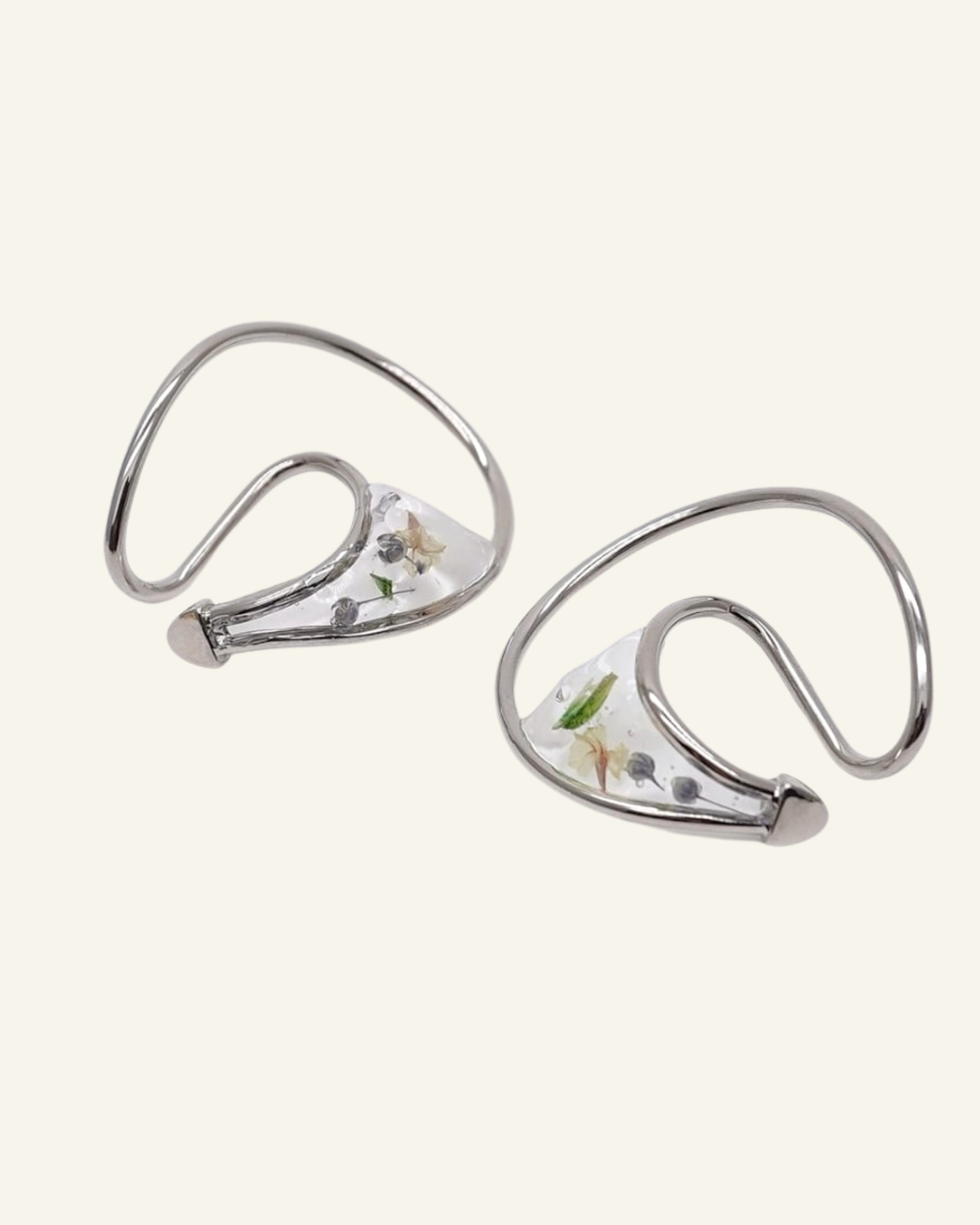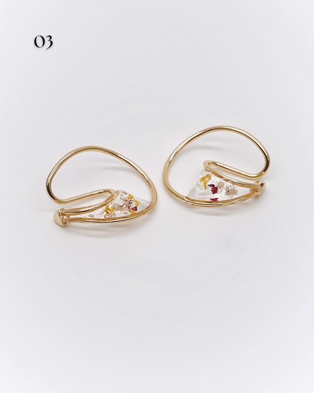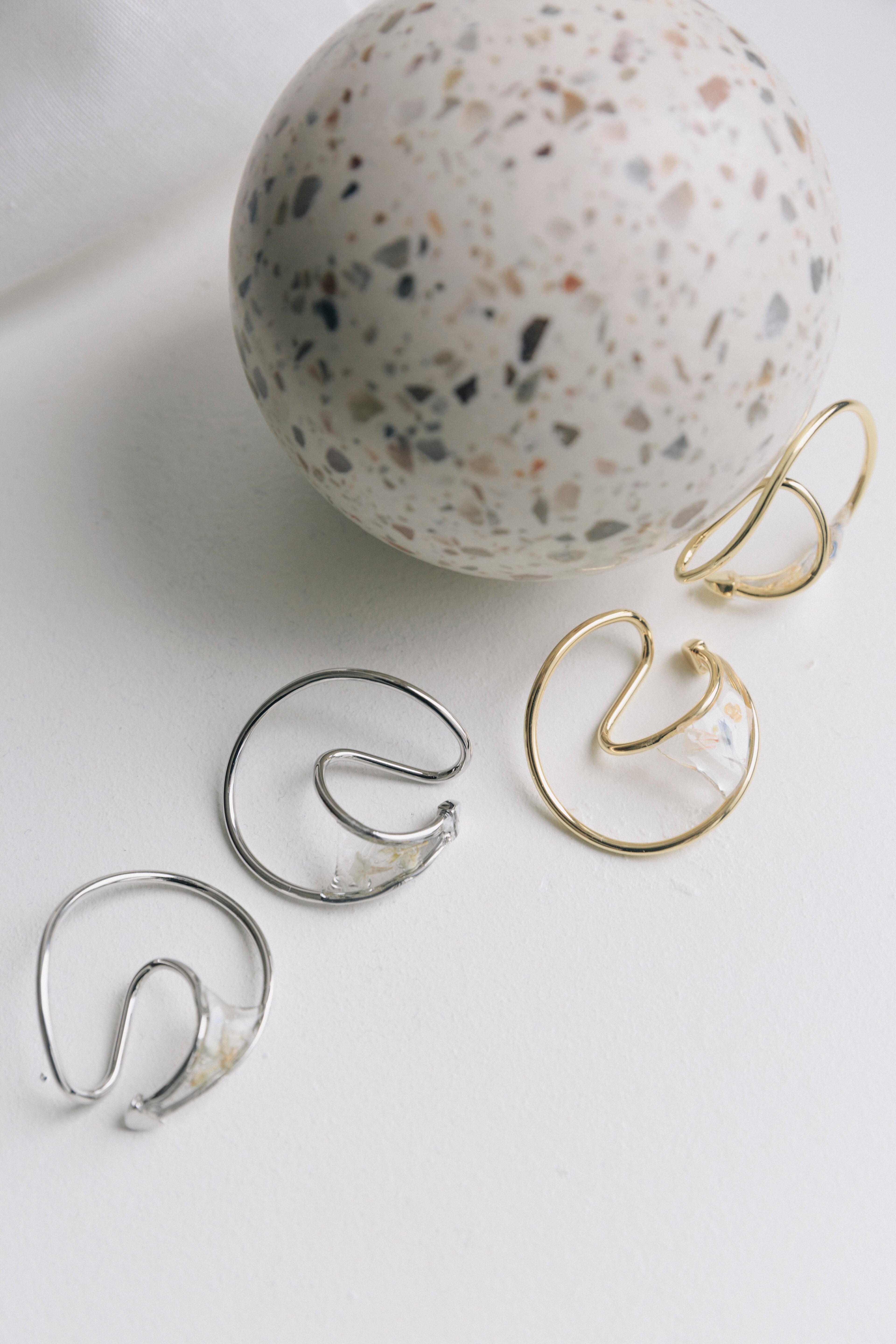 華やかさと抜け感を纏うフラワーフープイヤーカフ。ドライフラワーが中に閉じ込められたデザインで、耳元にさりげない彩りを添え、いつものコーディネートに自然なアクセントを加えます。