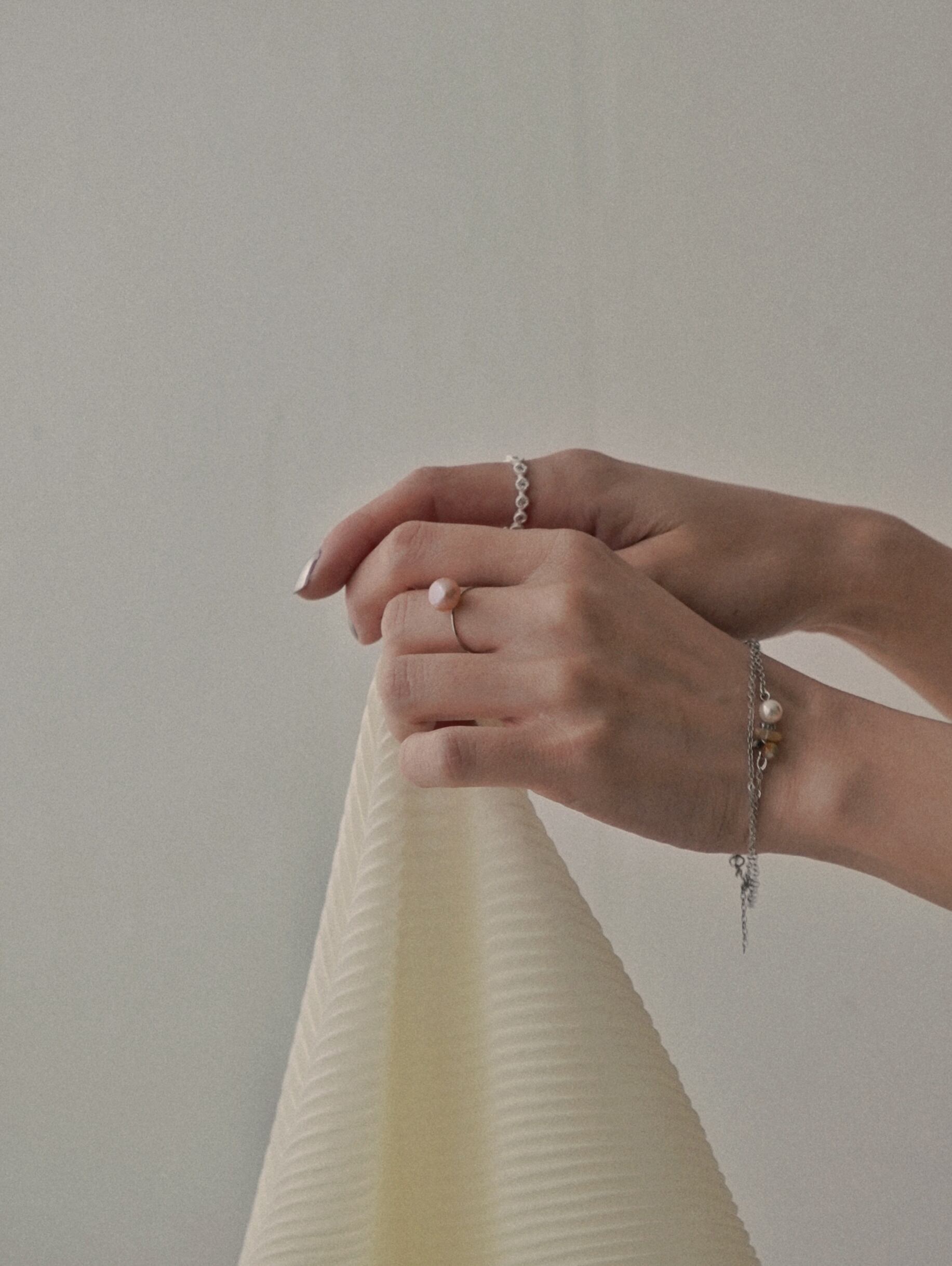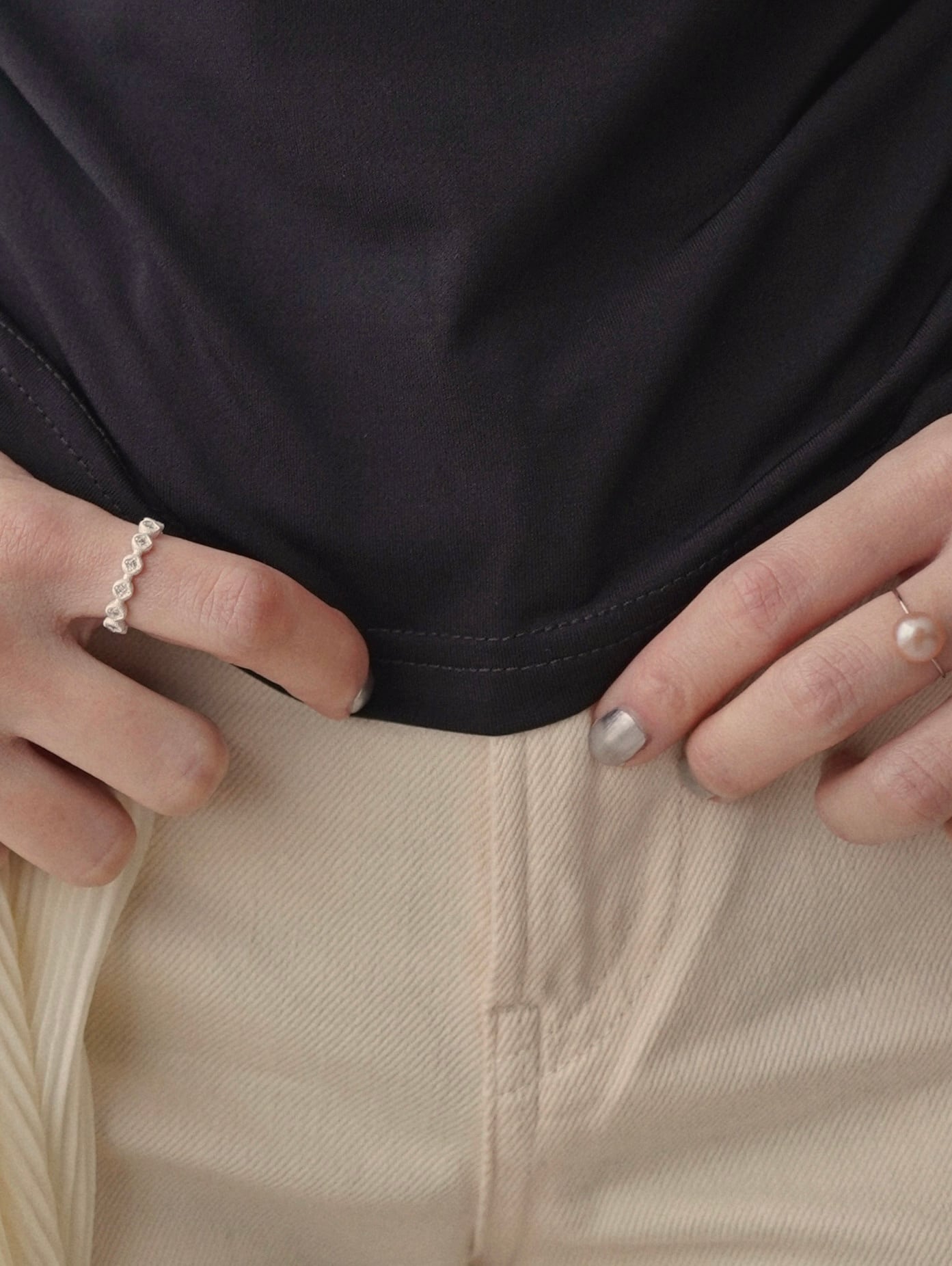淡水パールのワイヤーリング。シンプルでありながら、立体感のあるデザインが手元にさりげないアクセントを加え、上品さを演出します。オケージョンシーンはもちろん、デイリースタイルにもぴったりなアイテムです。