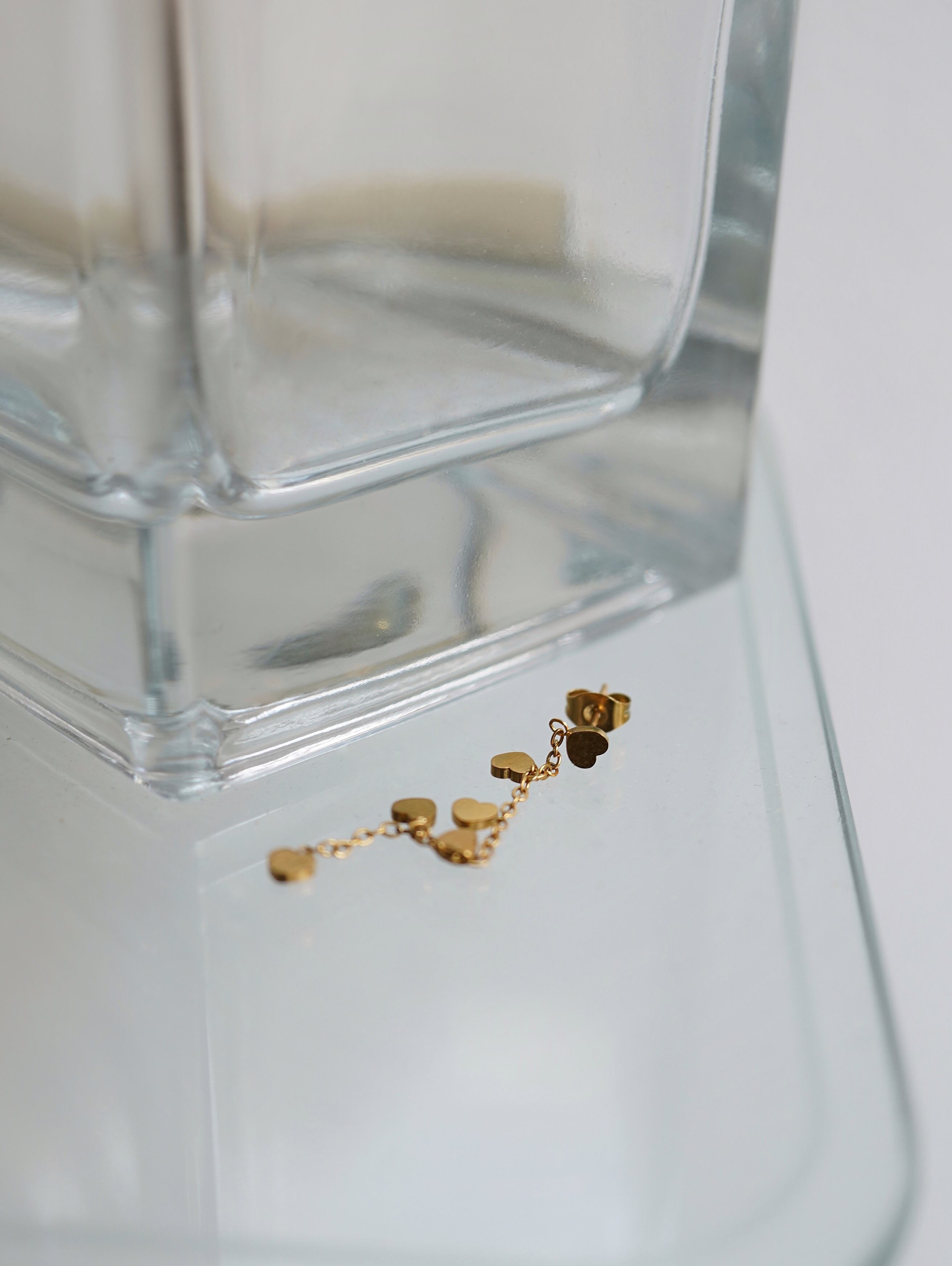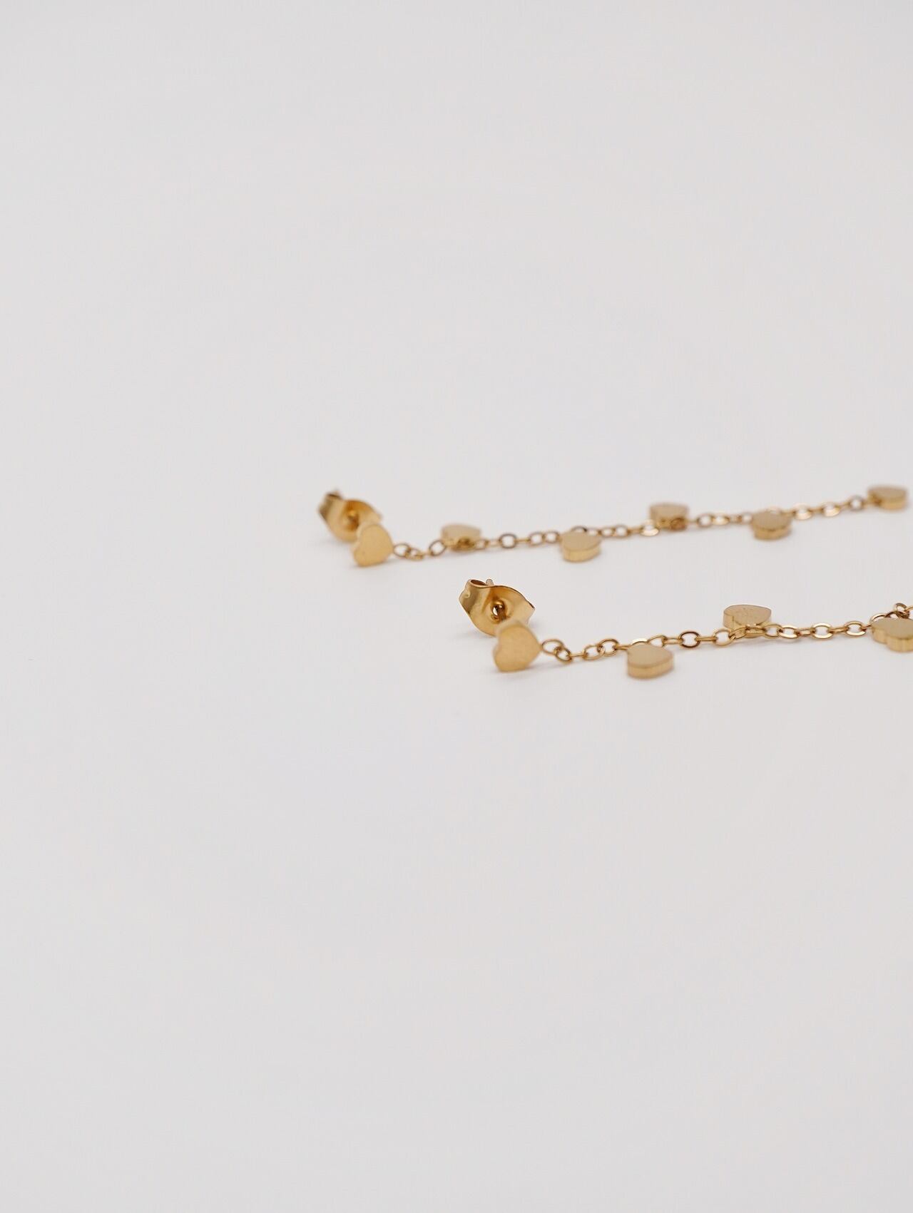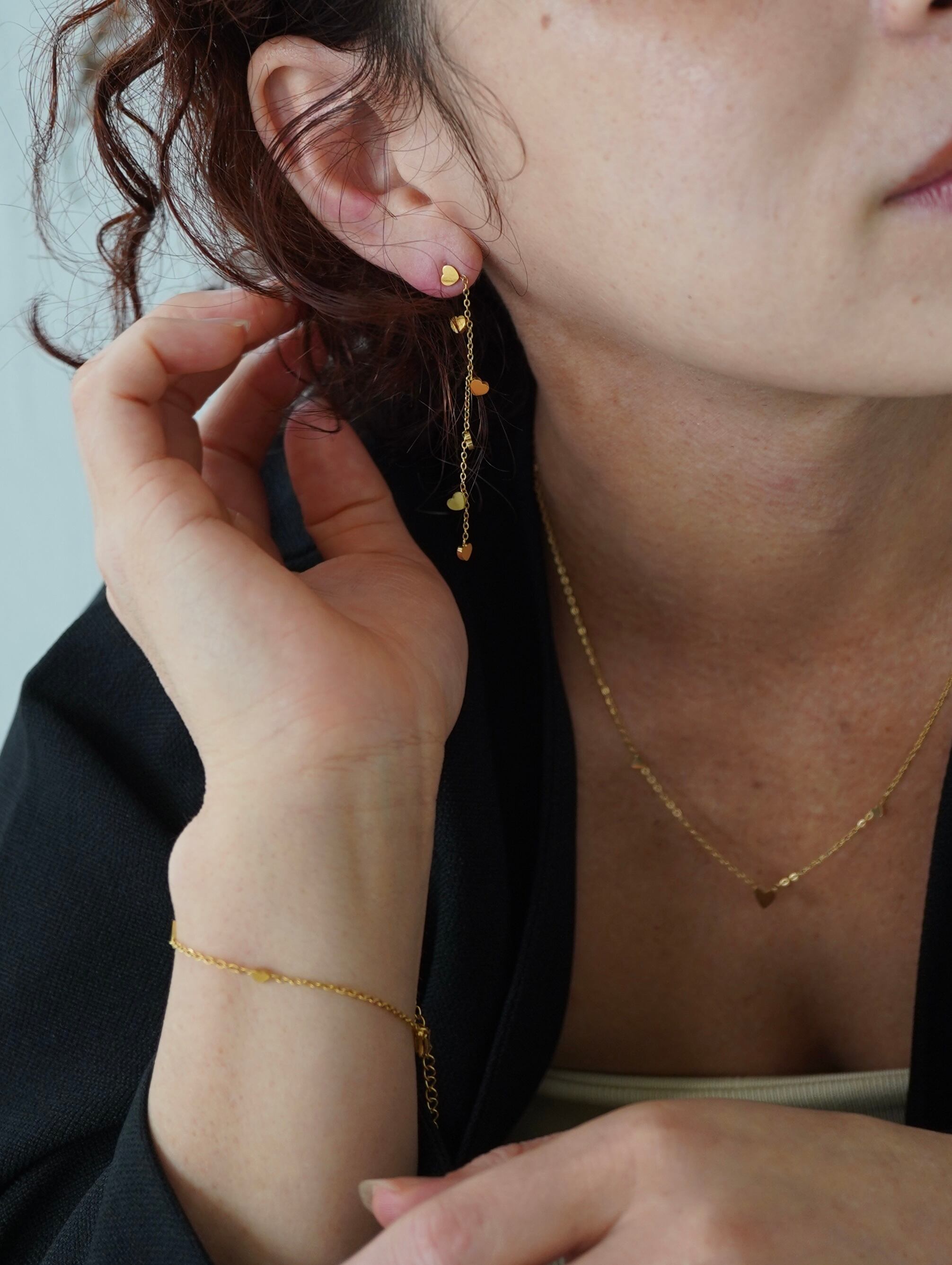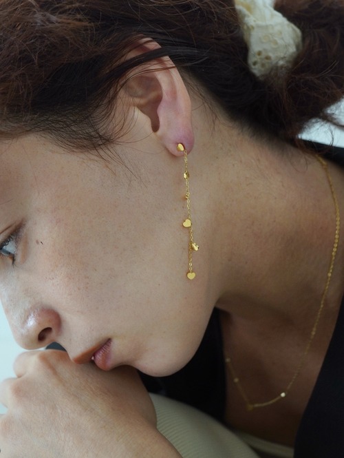 プレートのハートが並んだロングチェーンピアス。華奢なシルエットが女性らしく上品さを演出し、デイリーシーンはもちろん、オケージョンシーンにもぴったりなアイテムです。