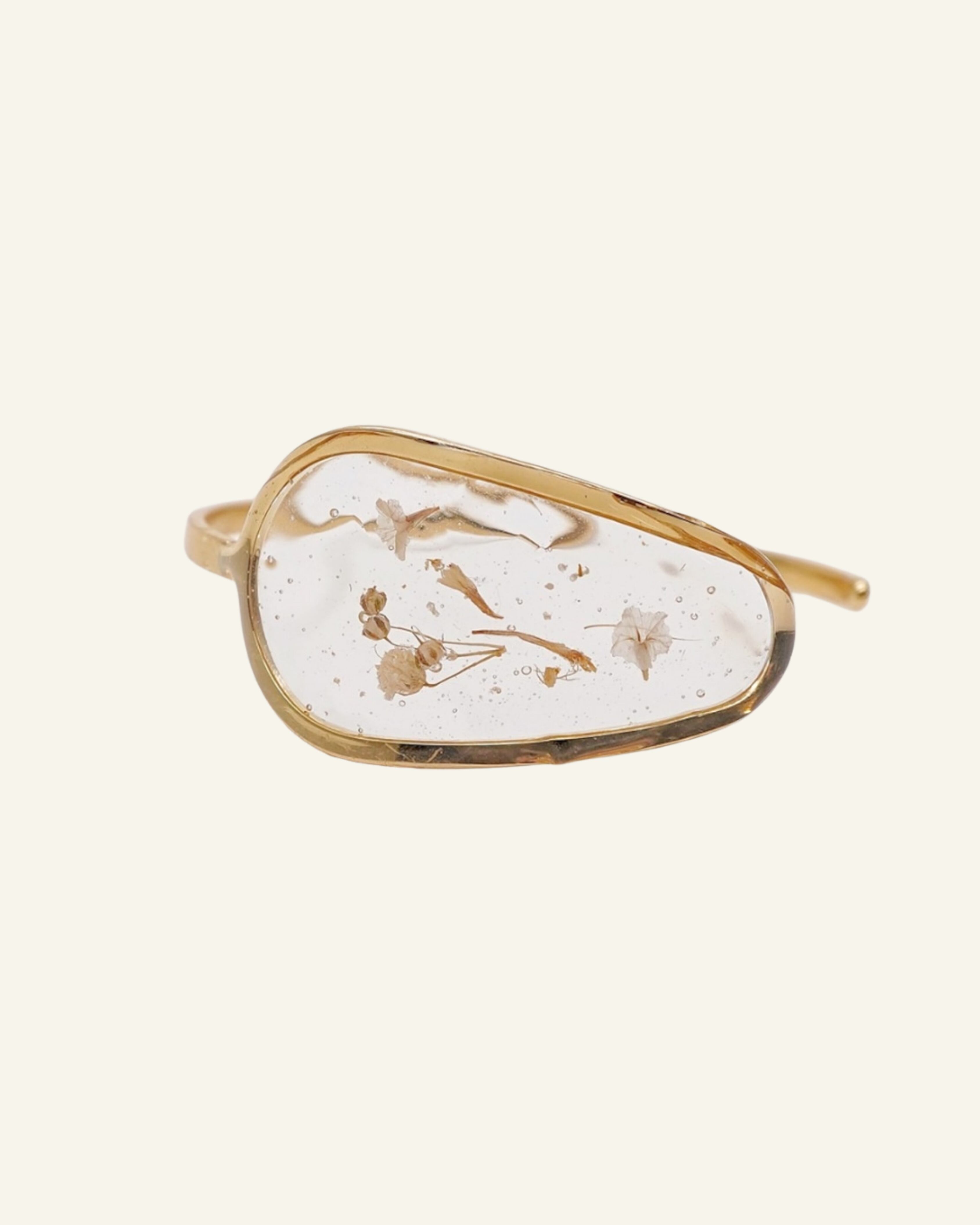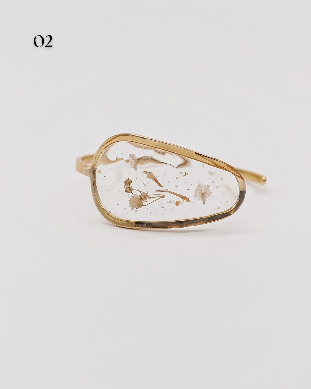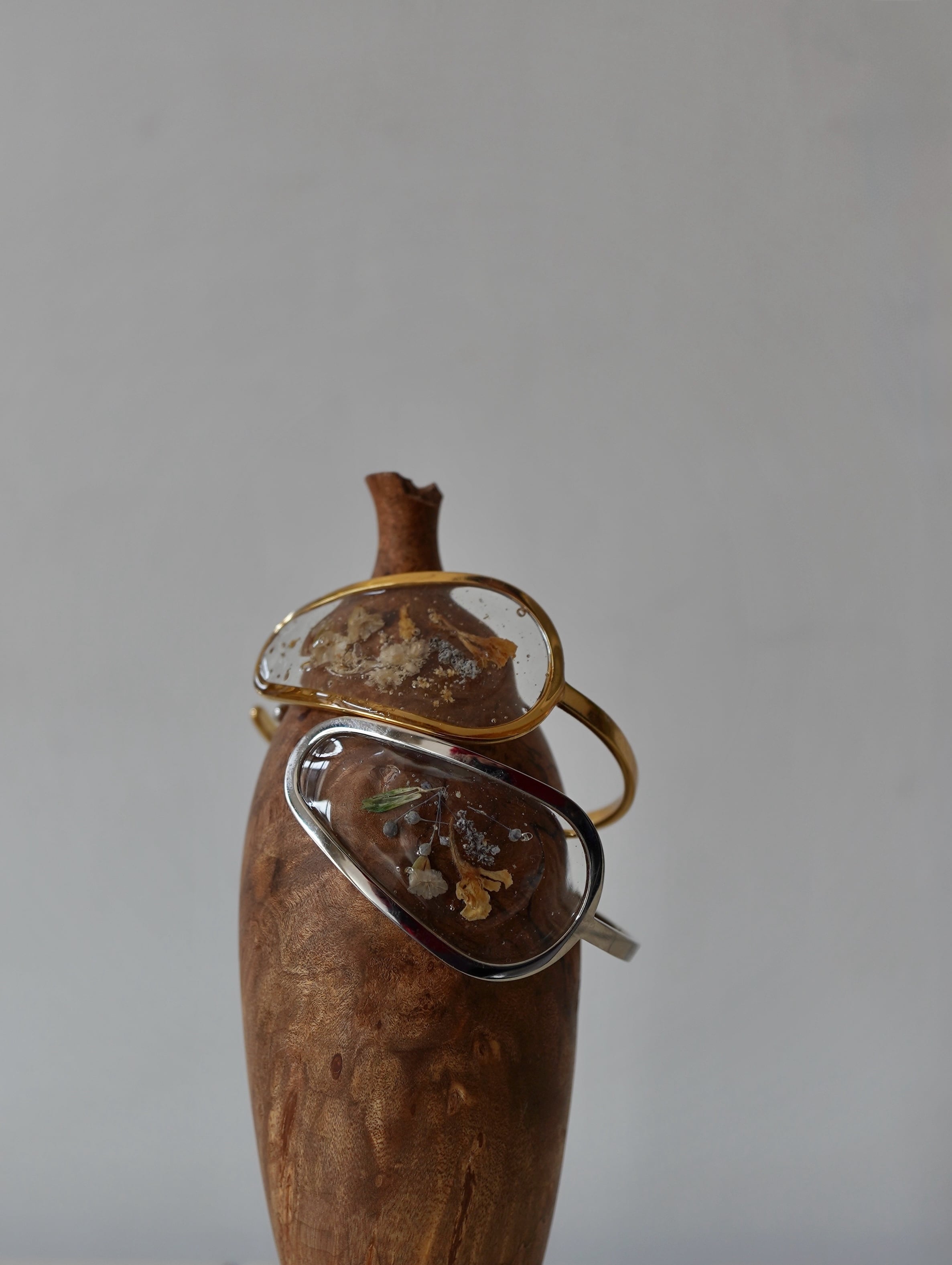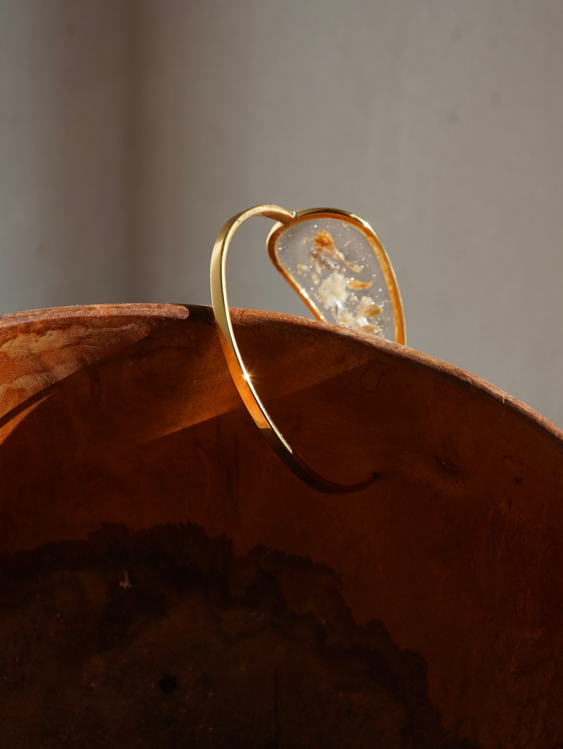 オーバルのバングルの中に花を閉じ込めたデザイン。シンプルでありながら華やかさを感じさせ、どんなコーディネートにも合わせやすいアイテムです。