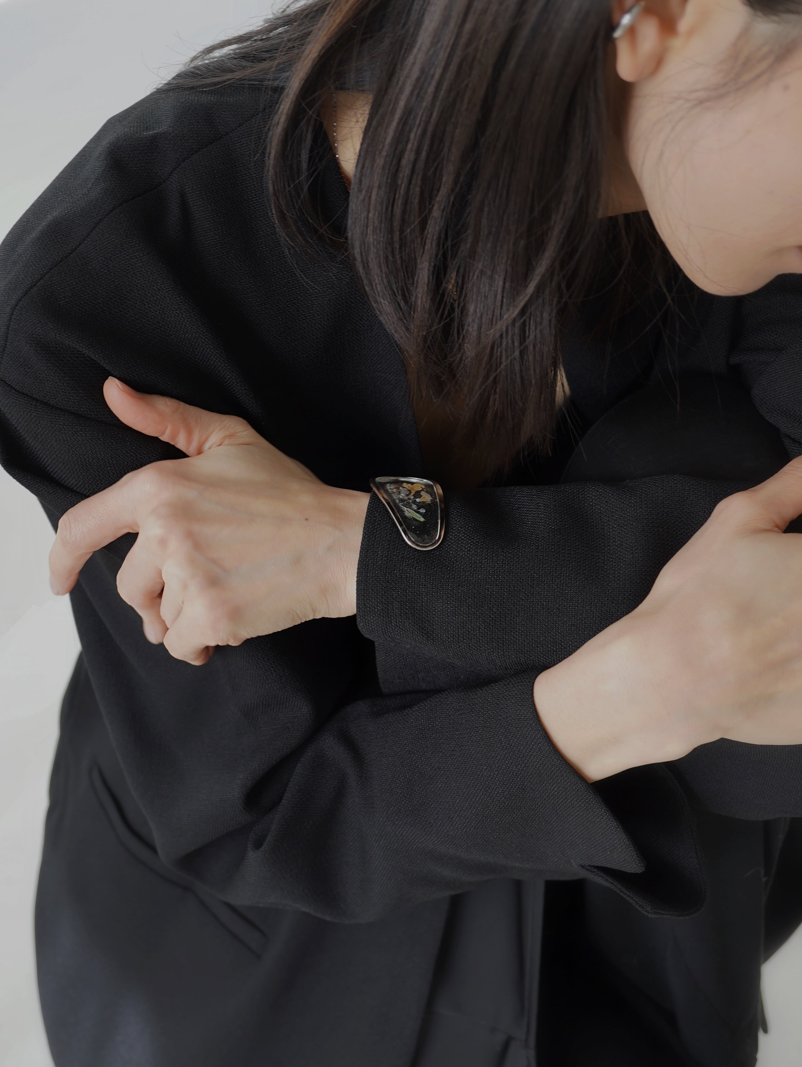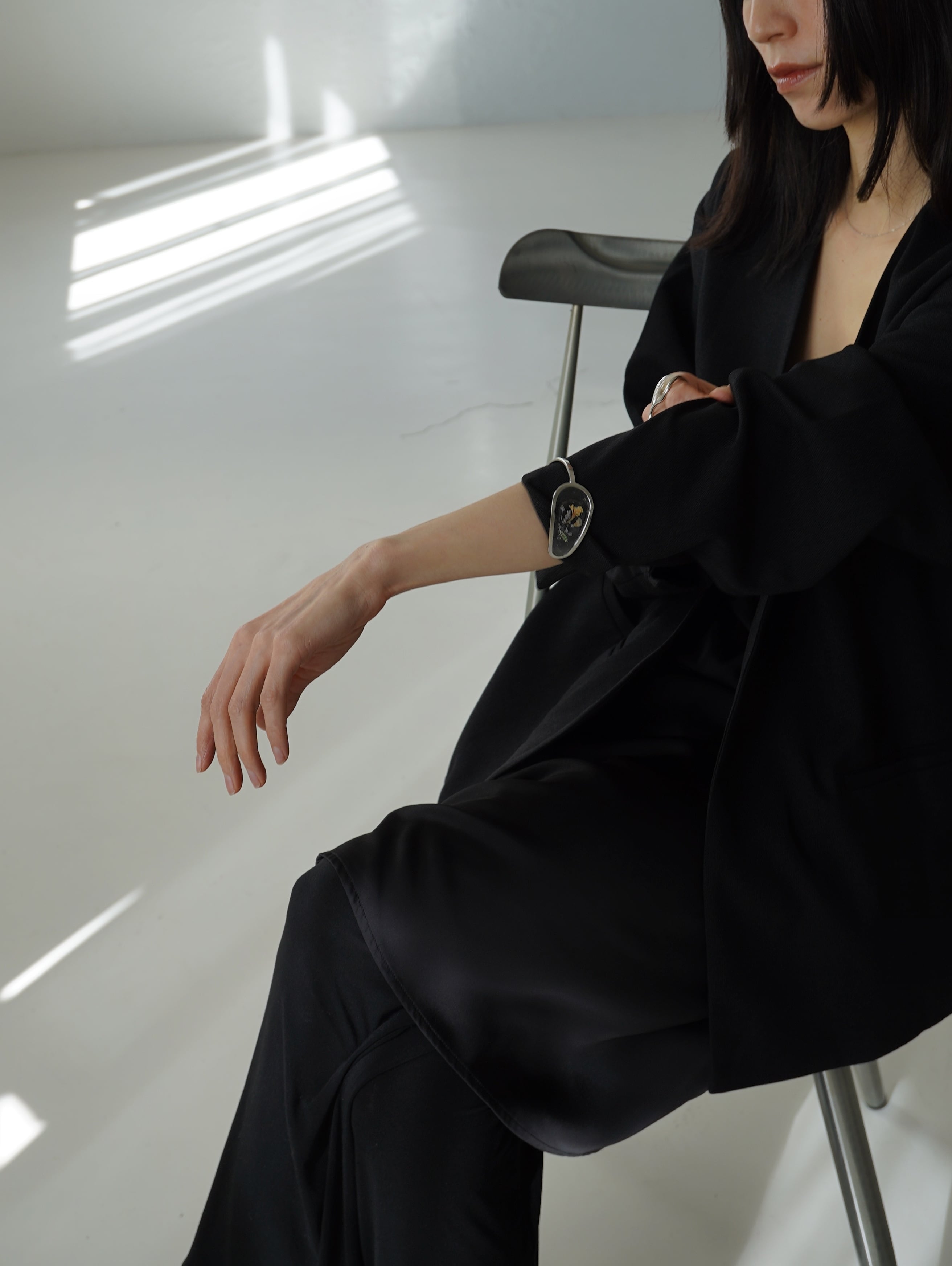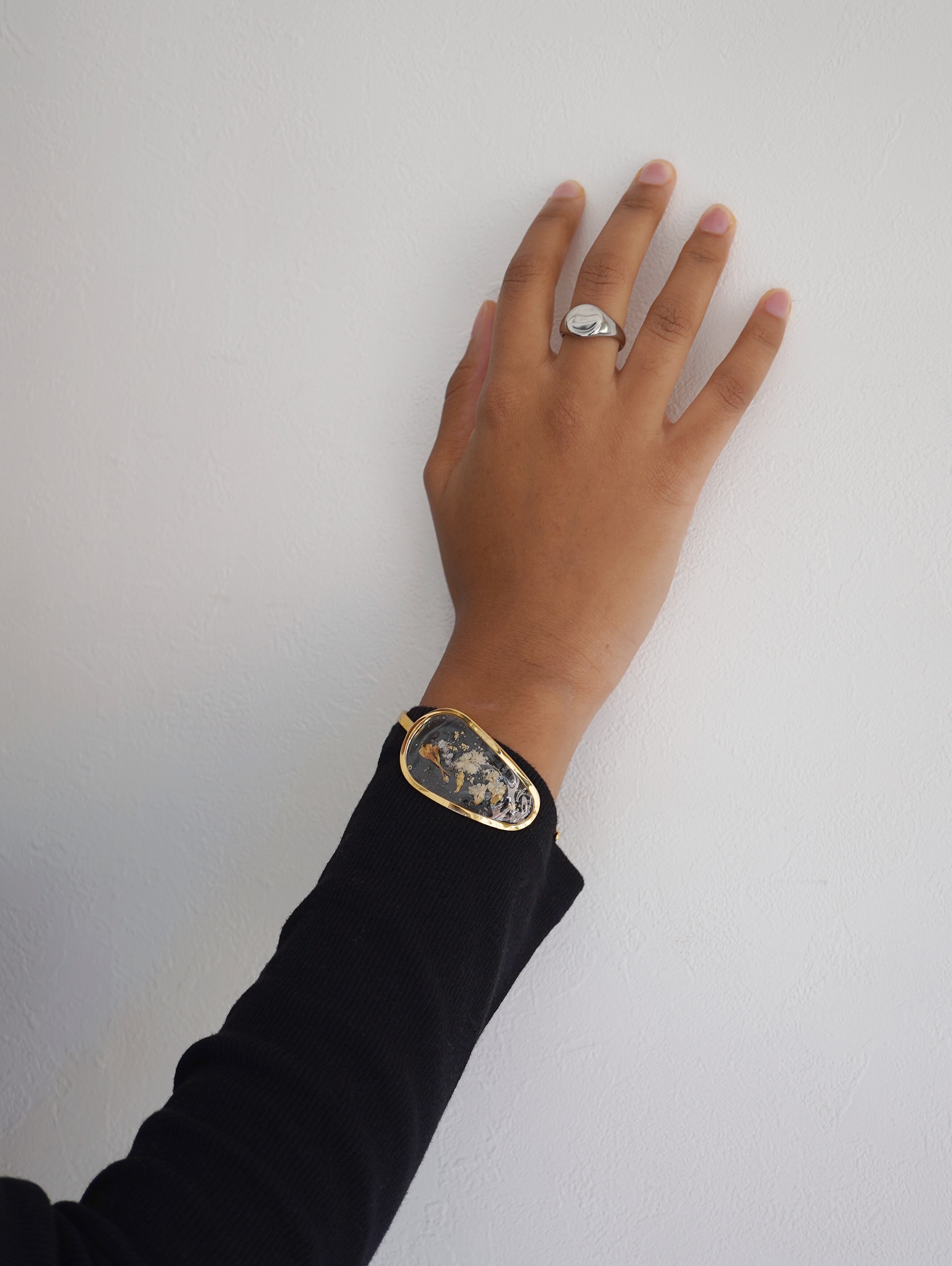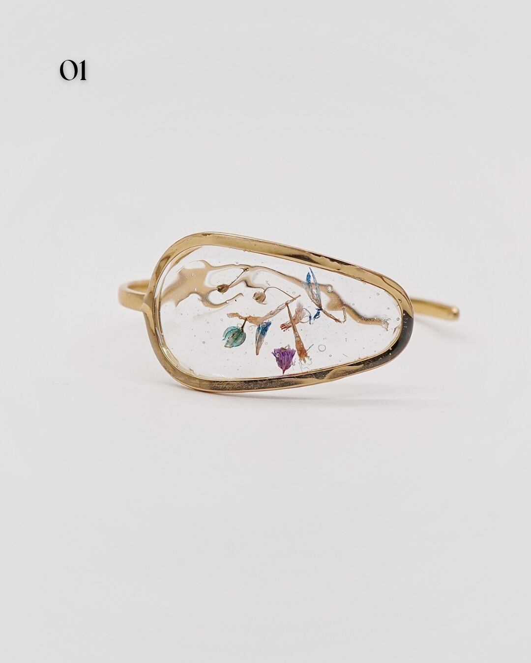 オーバルのバングルの中に花を閉じ込めたデザイン。シンプルでありながら華やかさを感じさせ、どんなコーディネートにも合わせやすいアイテムです。
